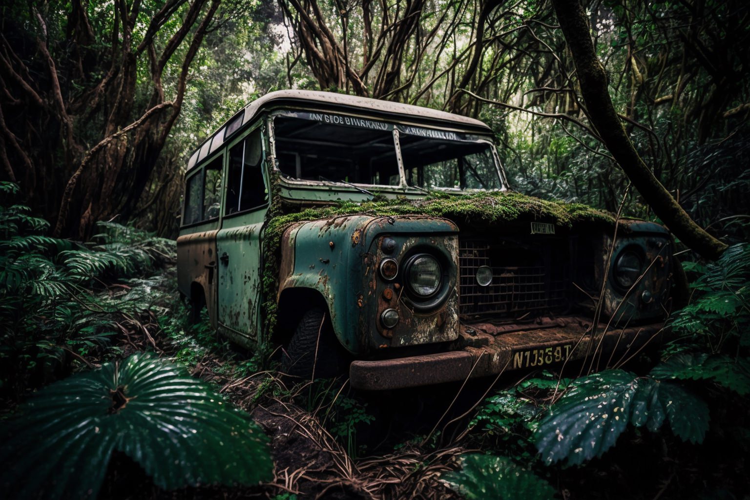Prompt: Abandoned 1967 Land Rover Defender sitting in overgrown forest, dusty and dirty, wide angle shot with shallow depth of field, shot in the style of street photography