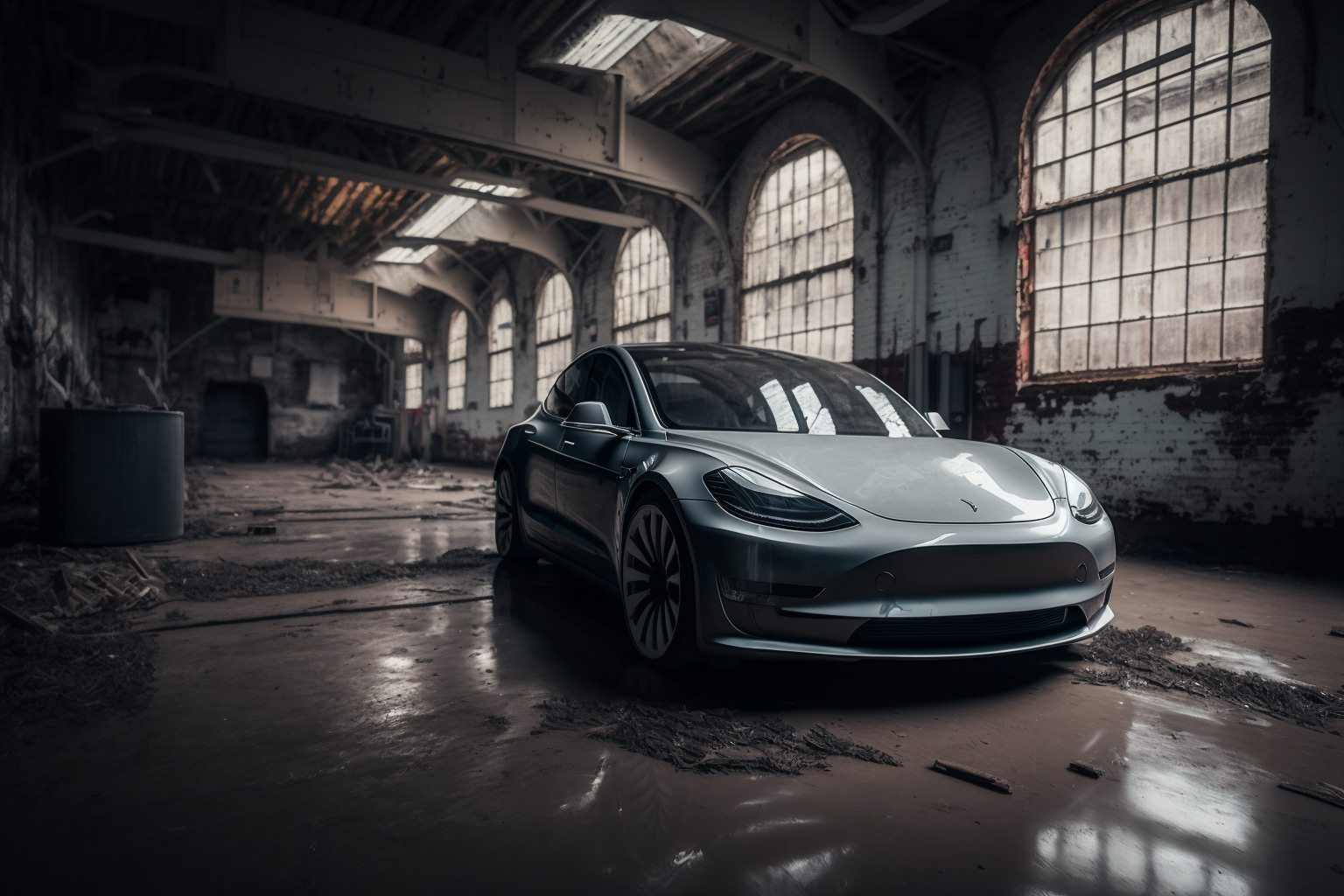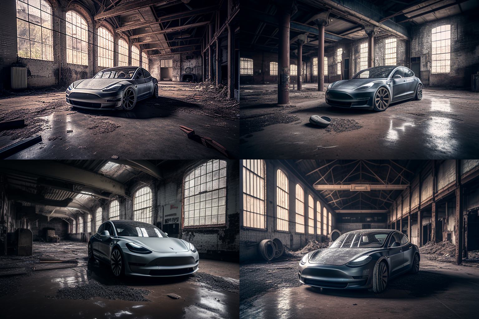 Prompt: Abandoned grey Tesla Model 3 sitting in an old 1930 industrial hall, dusty and dirty, wide angle shot with shallow depth of field, shot in the style of street photography