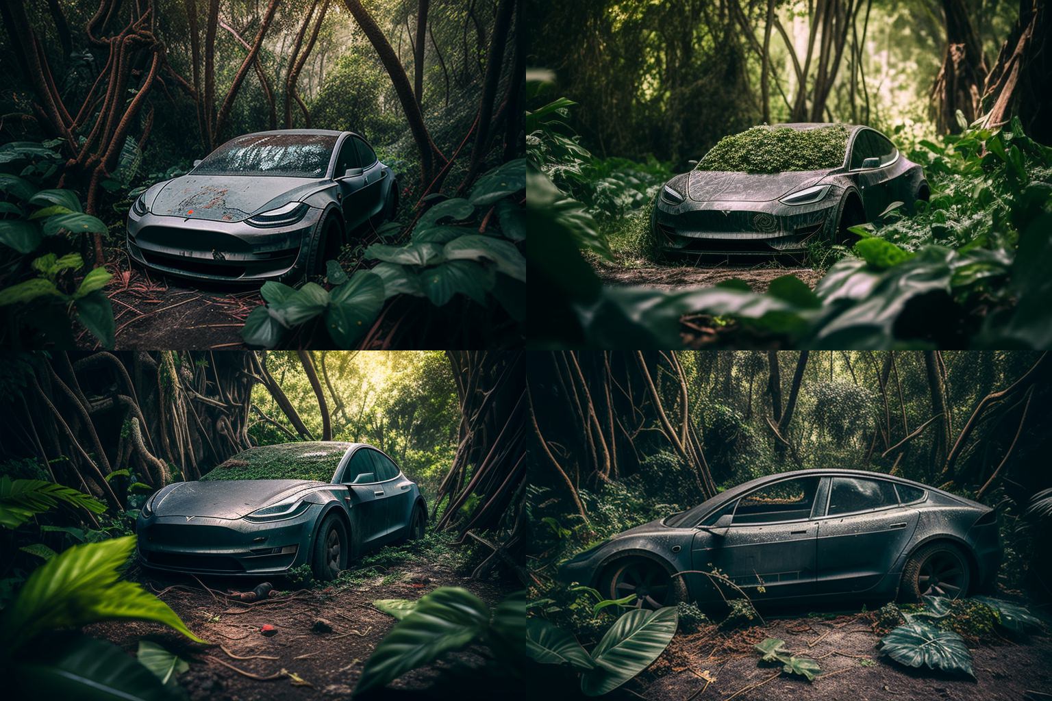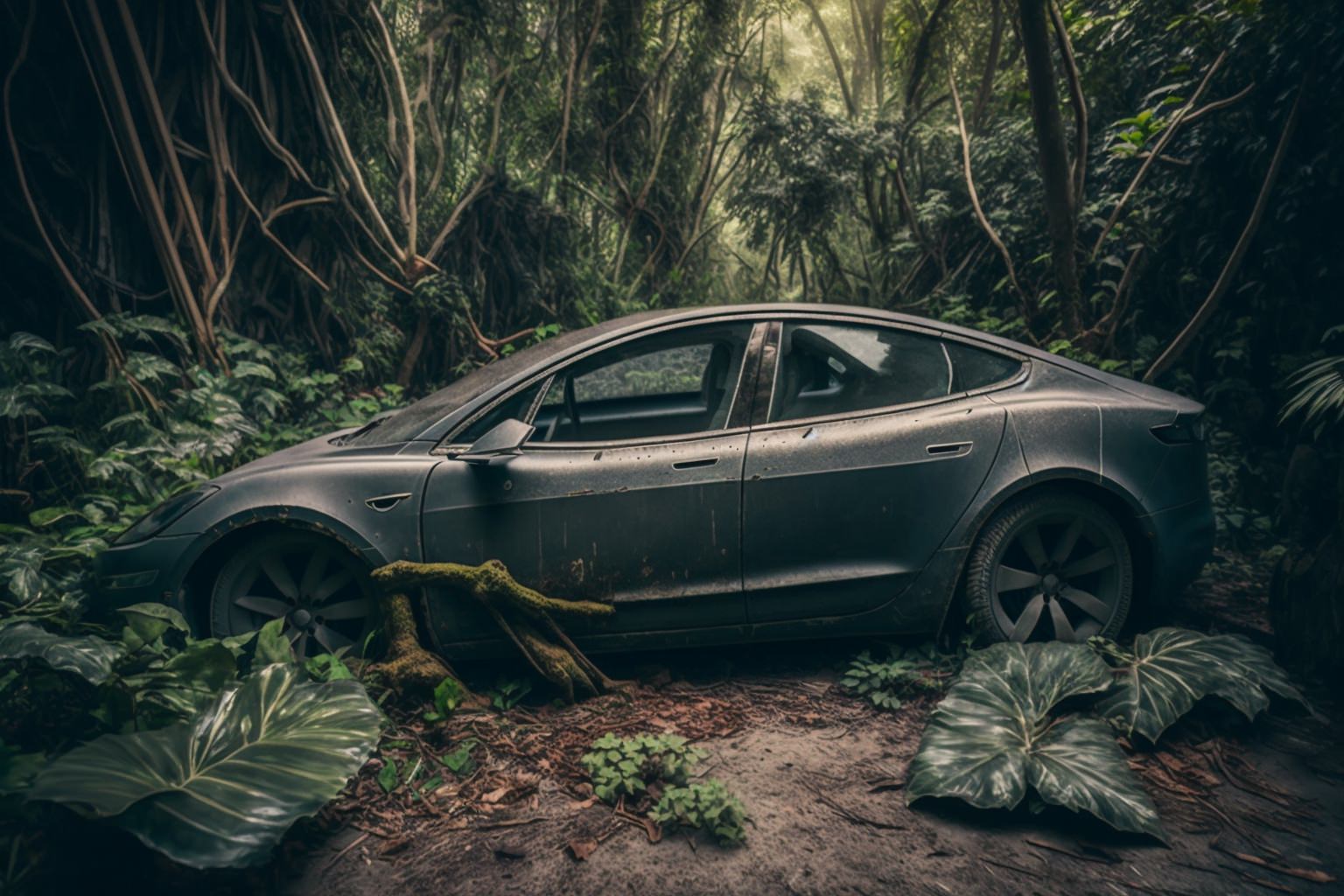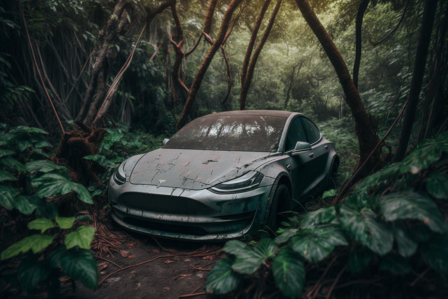 Prompt: Abandoned grey Tesla Model 3 sitting in overgrown green lush tropical forest, dusty and dirty, wide angle shot with shallow depth of field, shot in the style of street photography