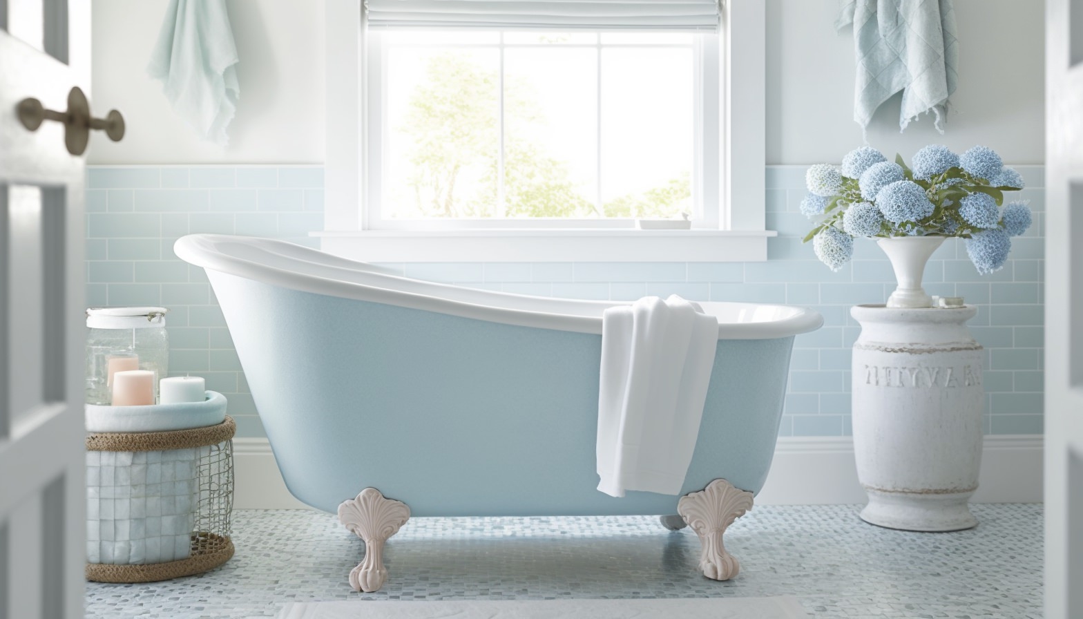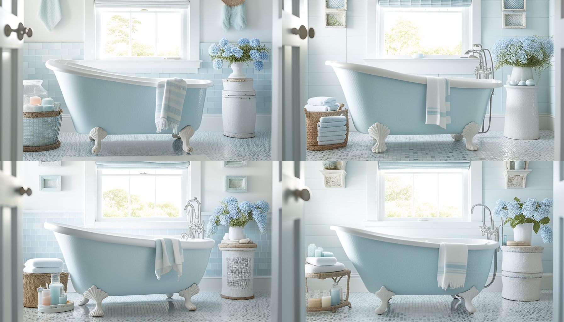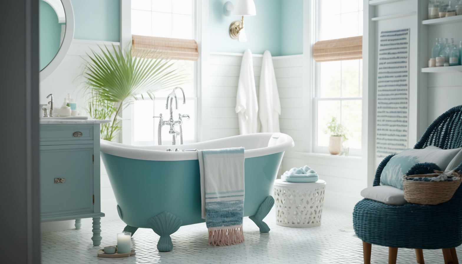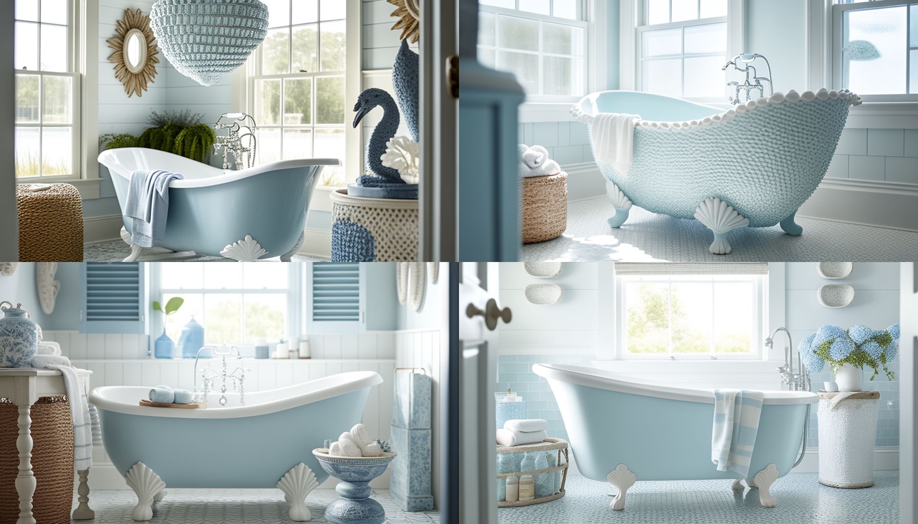 Prompt: Editorial Style Photo, Eye Level, Coastal Bathroom, Clawfoot Tub, Seashell, Wicker, Mosaic Tile, Blue and White, Serena & Lily, Natural Light, Beach House, Afternoon, Relaxing, Coastal, Beachy, Nautical, 4k
