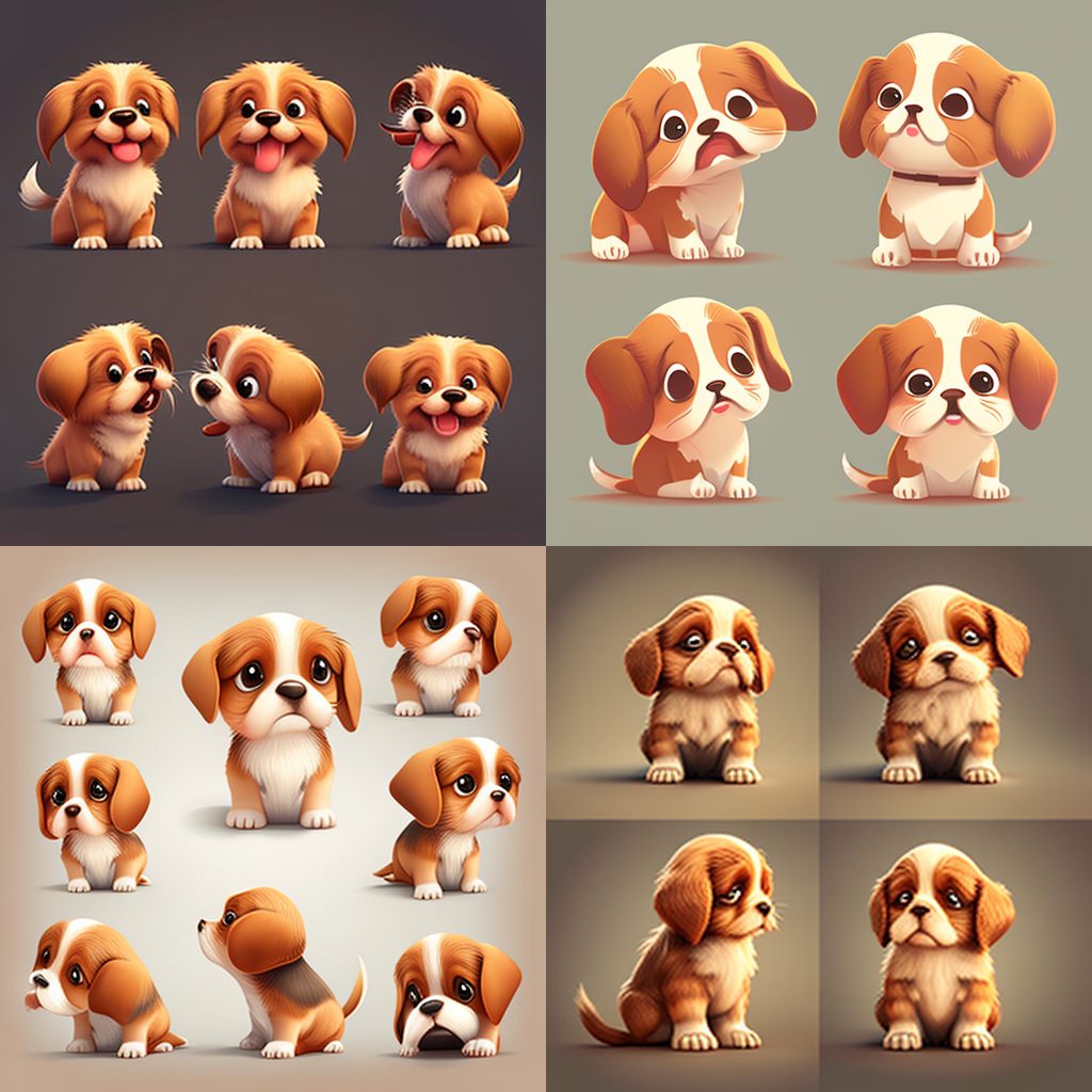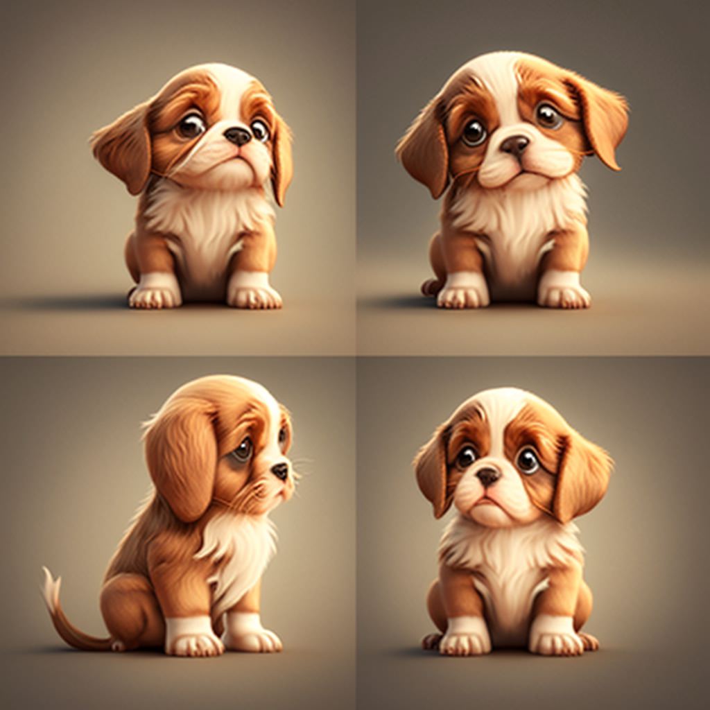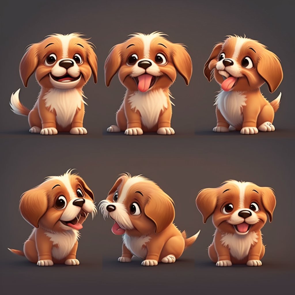 Prompt: Cute puppy, multiple character’s poses and motions including happy and sad