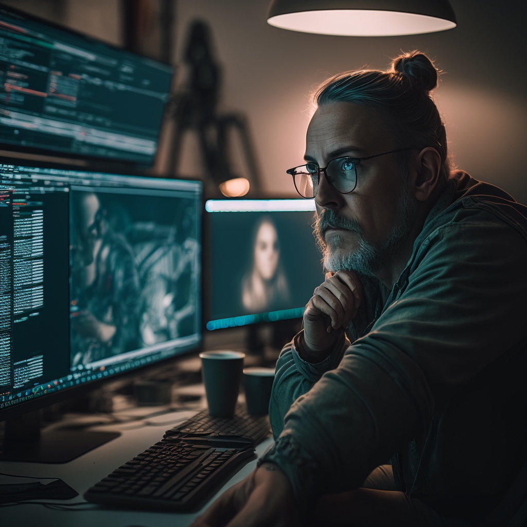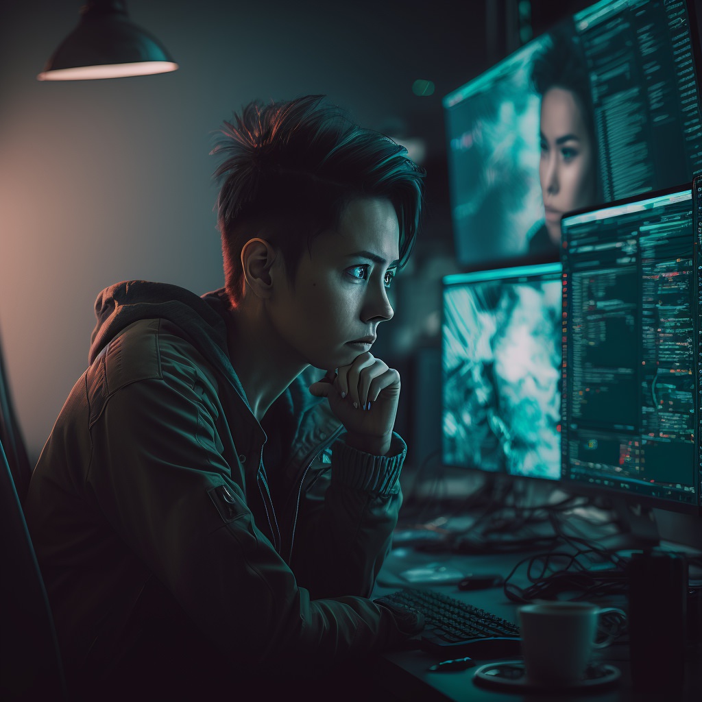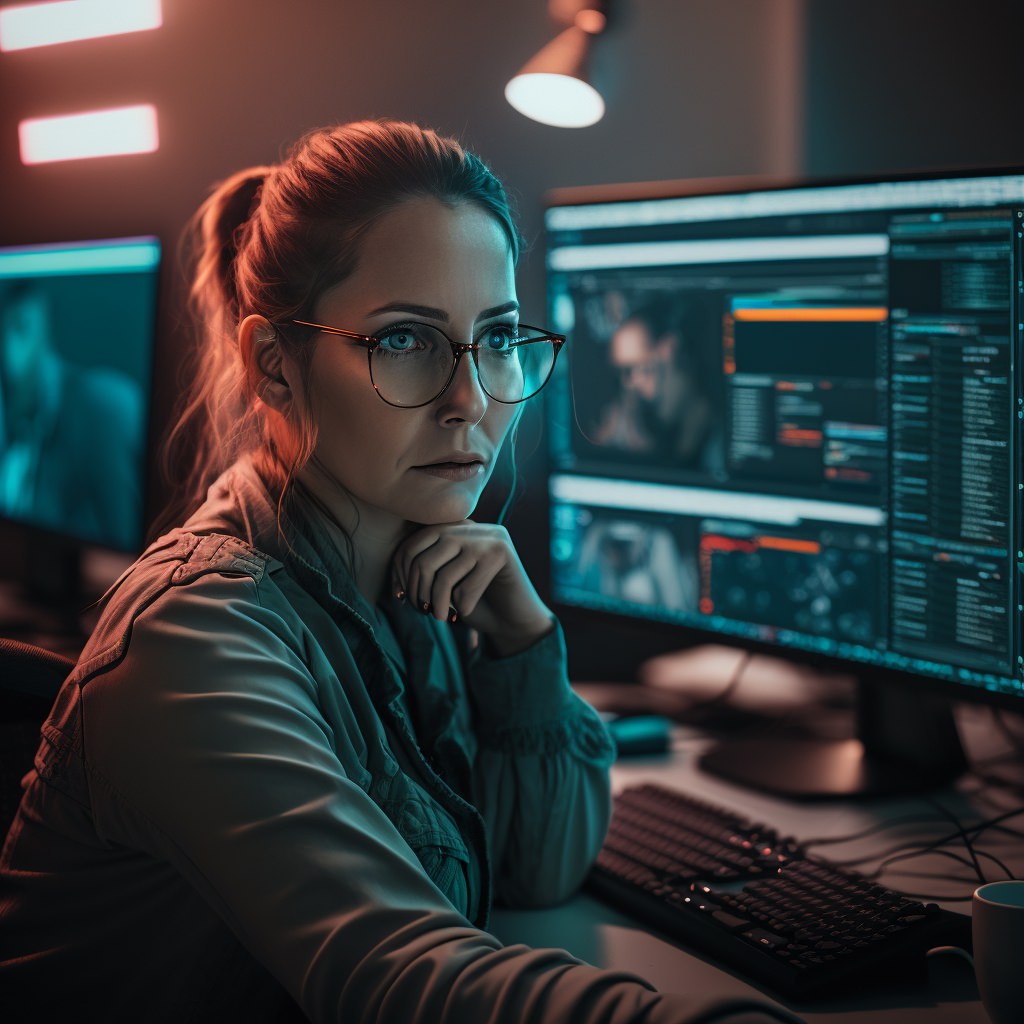 A <40 year old woman/variations> sitting in front of a computer screen, cyber security, photo realism, Unreal Engine, Cinematic, Color Grading, portrait Photography, Shot on 24mm lense, Ultra - Wide Angle, Depth of Field, hyper - detailed, beautifully color - coded, insane details, intricate details, beautifully color graded, Unreal Engine, Cinematic, Color Grading, Editorial Photography Photography, Photoshoot, Depth of Field, DOF, White Balance, 32k, Super - Resolution, Megapixel, ProPhoto RGB, VR, Lonely, Good, Massive, Halfrear Lighting, Backlight, Natural Lighting, Incandescent, Optical Fiber, Moody Lighting, Cinematic Lighting, Studio Lighting, Soft Lighting, Volumetric, Contre - Jour, Beautiful Lighting, Accent Lighting, Global Illumination, Screen Space Global Illumination, Ray Tracing Global Illumination, Optics, Scattering, Glowing, Shadows, Rough, Shimmering, Ray Tracing Reflections, Lumen Reflections, Screen Space Reflections, Diffraction Grading, Chromatic Aberration, GB Displacement, Scan Lines, Ray Traced, Ray Tracing Ambient Occlusion, Anti-Aliasing, FKAA, TXAA, RTX, SSAO, Shaders, OpenGL - Shaders, GLSL - Shaders, Post Processing, Post-Production, Cel Shading, Tone Mapping, CGI, VFX, SFX, insanely detailed and intricate, hypermaximalist, elegant, hyper realistic, super detailed, photography