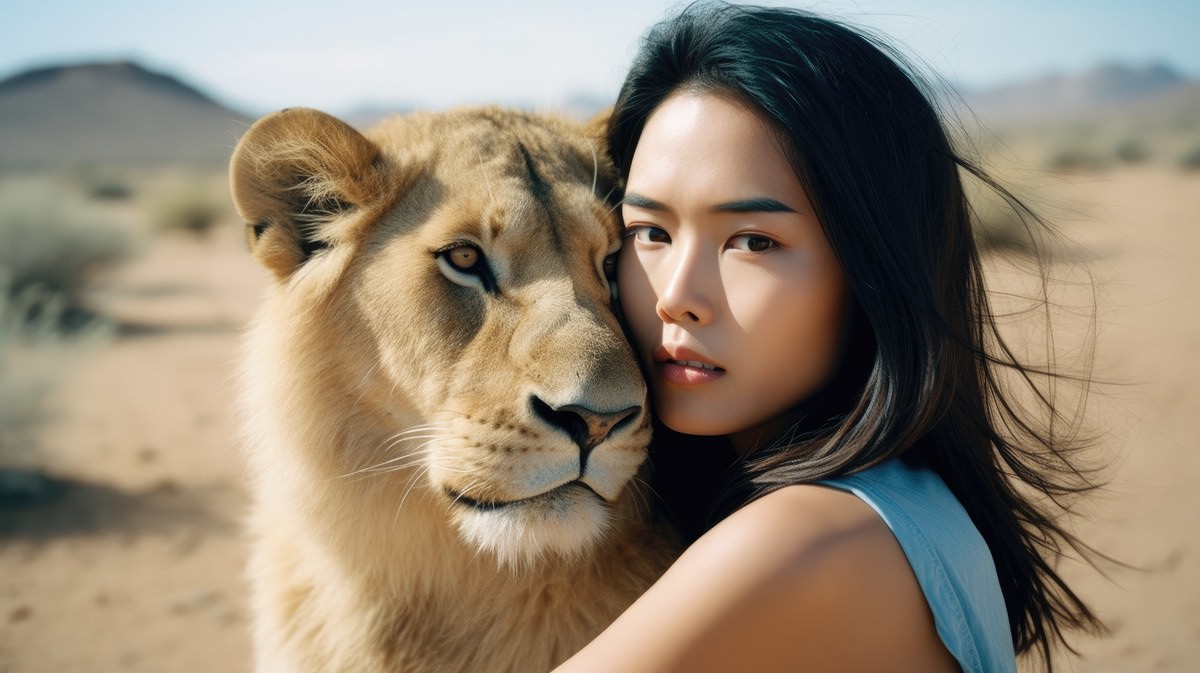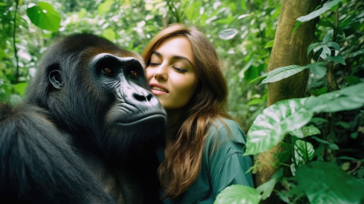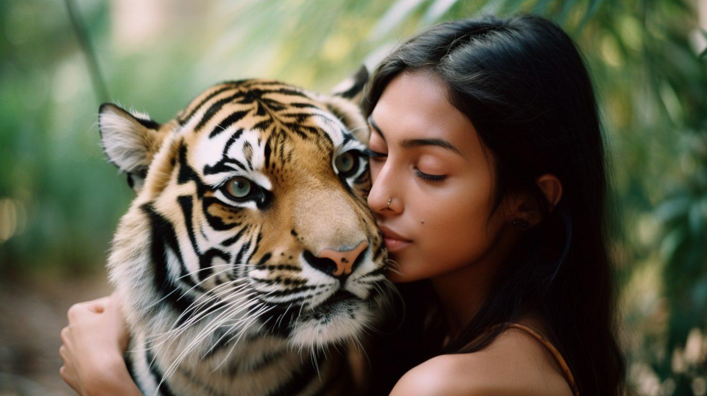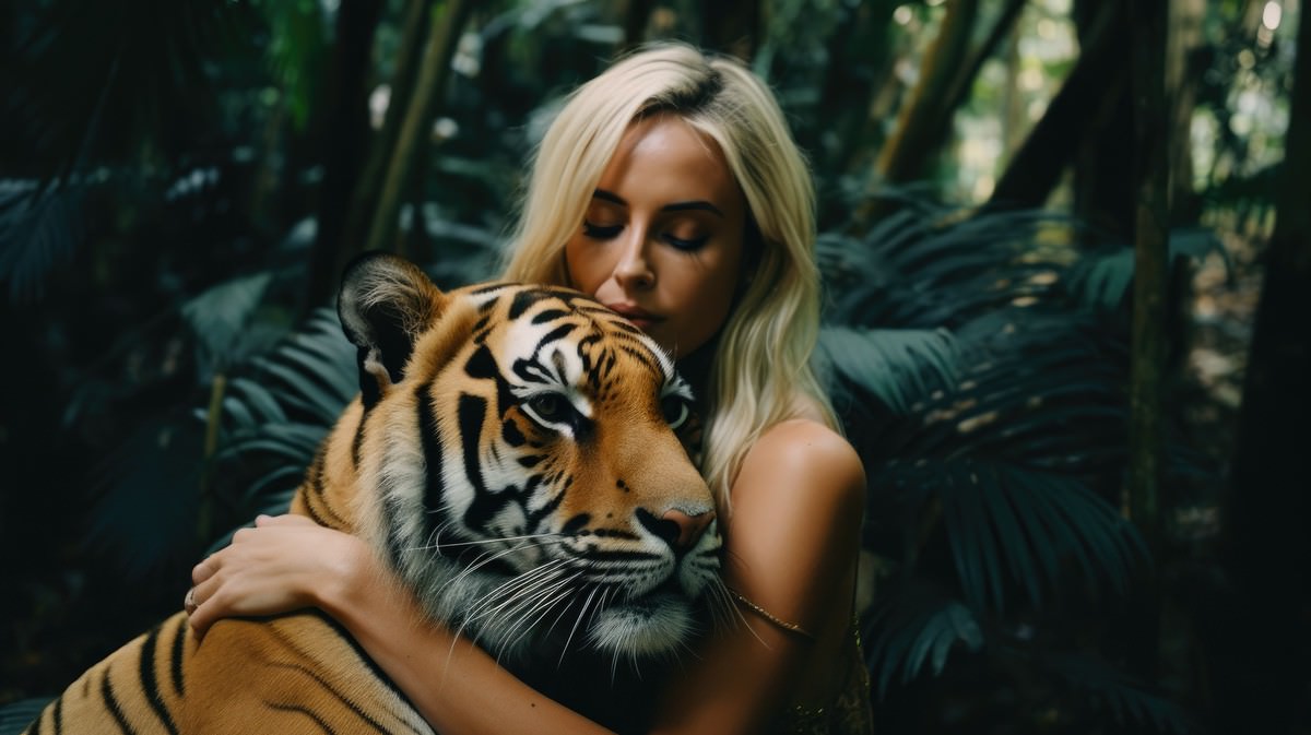 A tender moment between a woman and an apex animal, emphasizing a shared connection despite their contrasting sizes and forms.