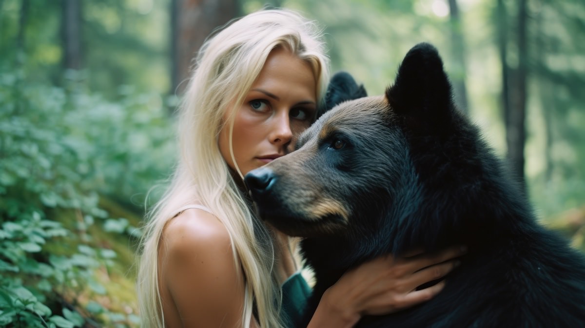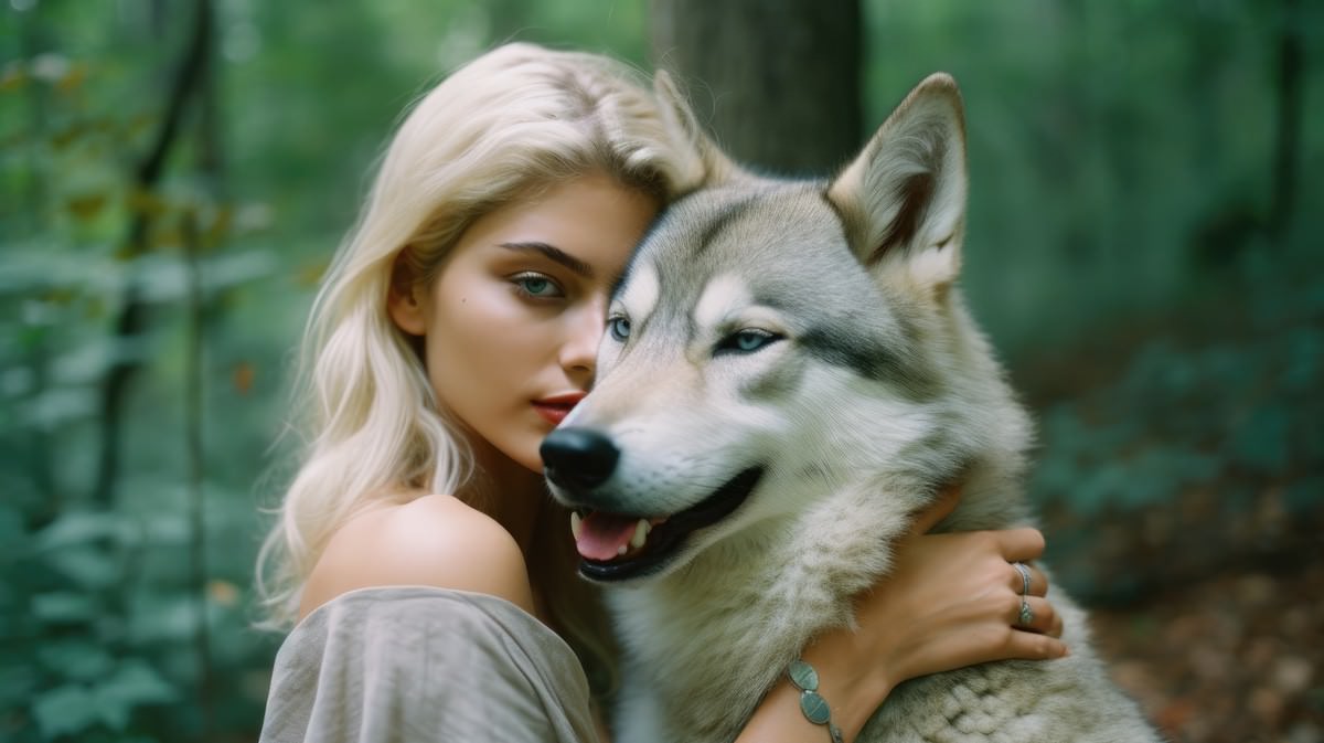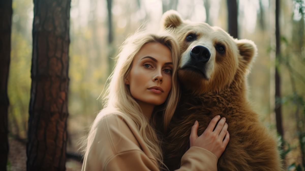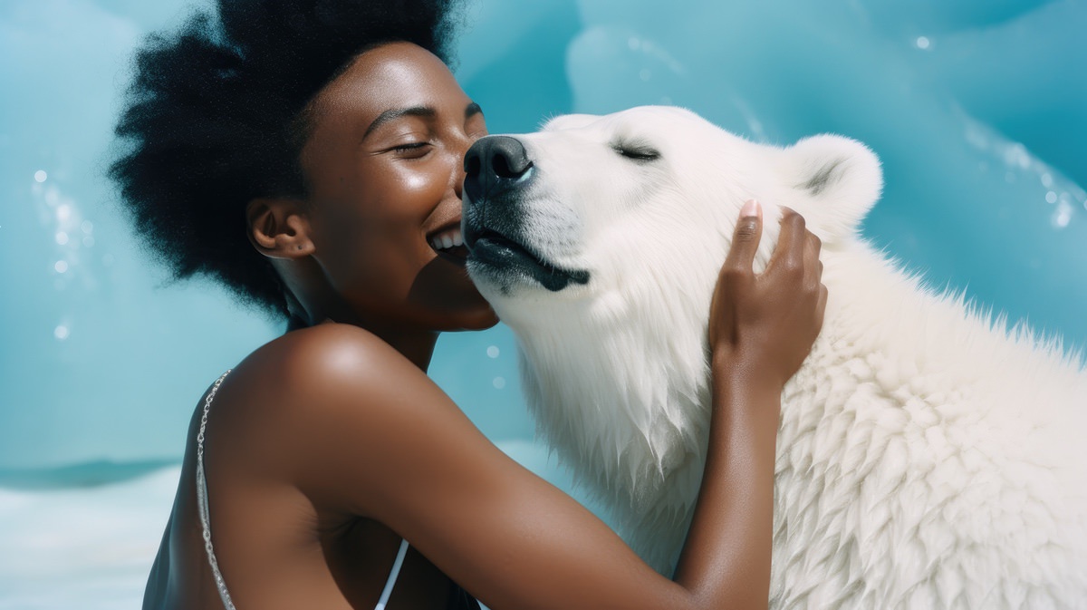 A tender moment between a woman and an apex animal, emphasizing a shared connection despite their contrasting sizes and forms.