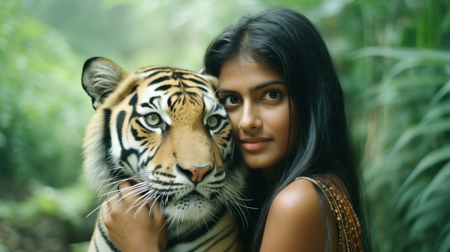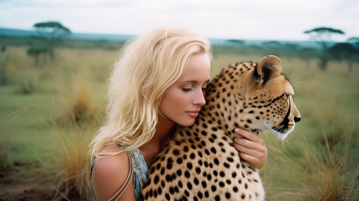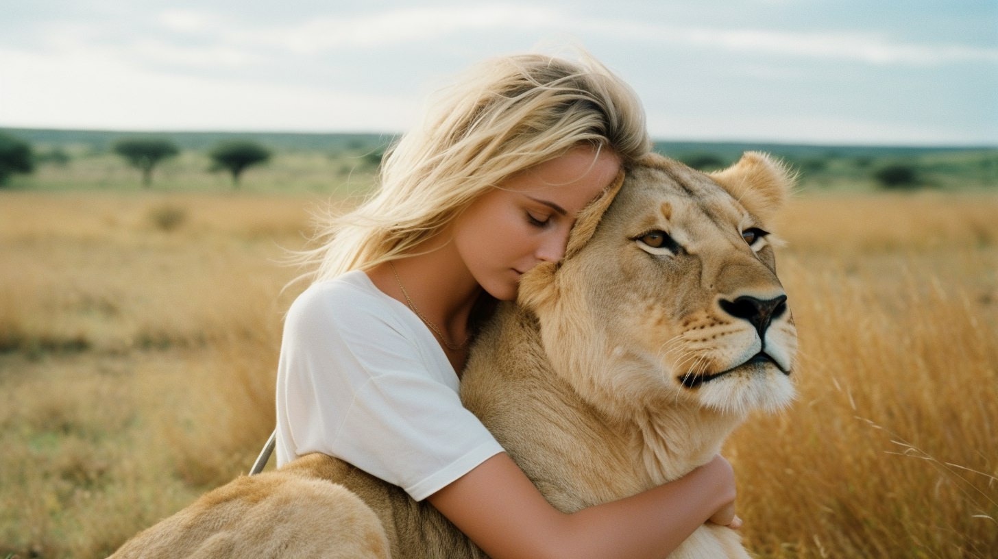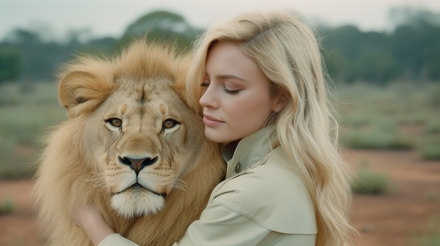 A gorgeous model in [some place], cheerful, hugging a [large animal], intense close-ups, green-core, kodak portra 800, 105 mm f1.8 --ar 16:9 --v 5