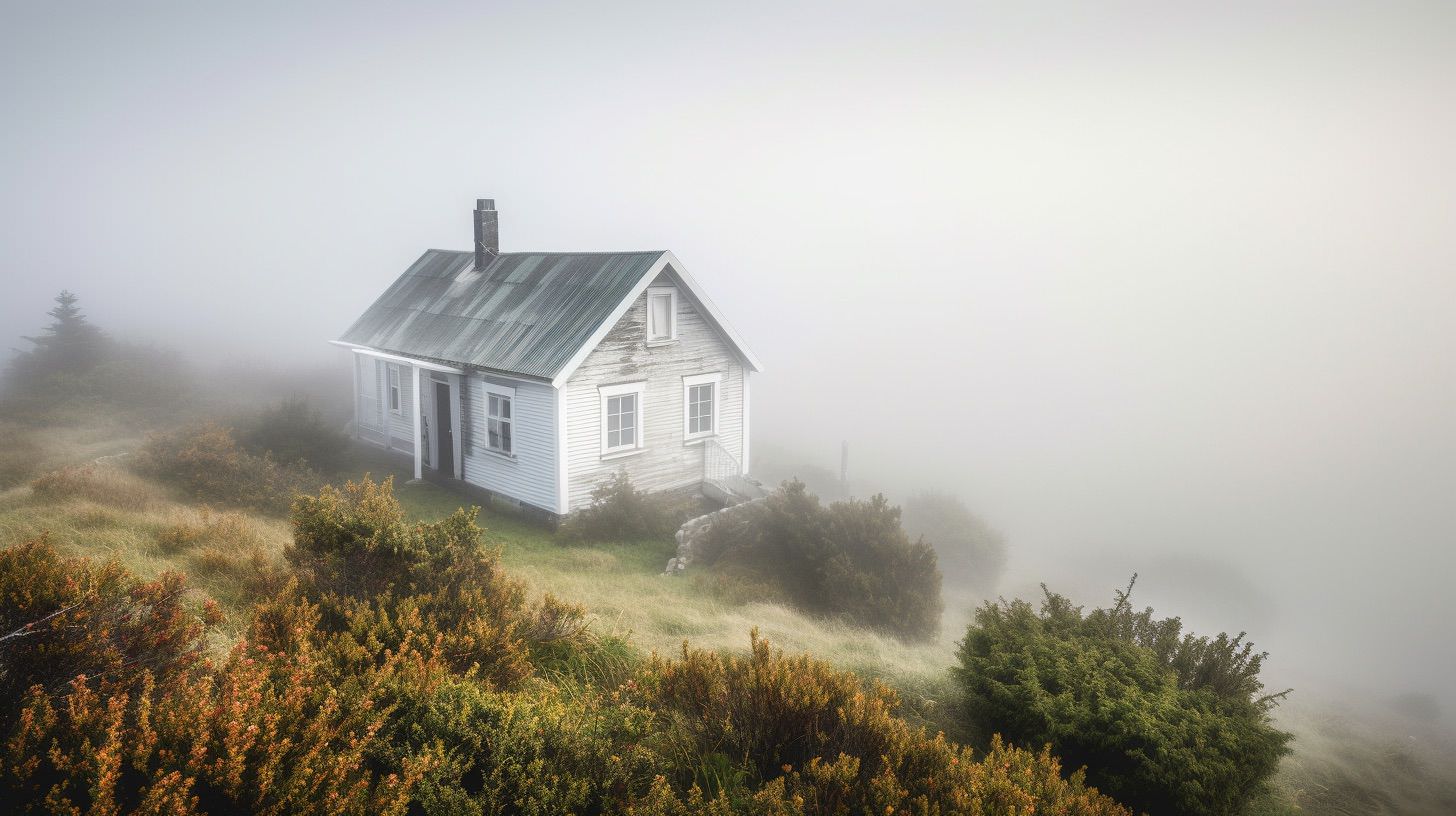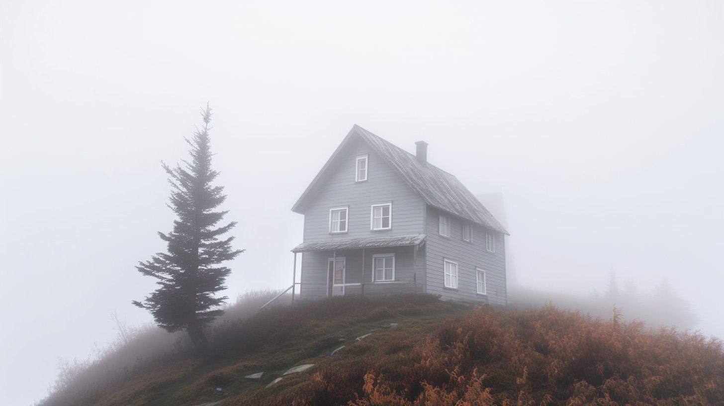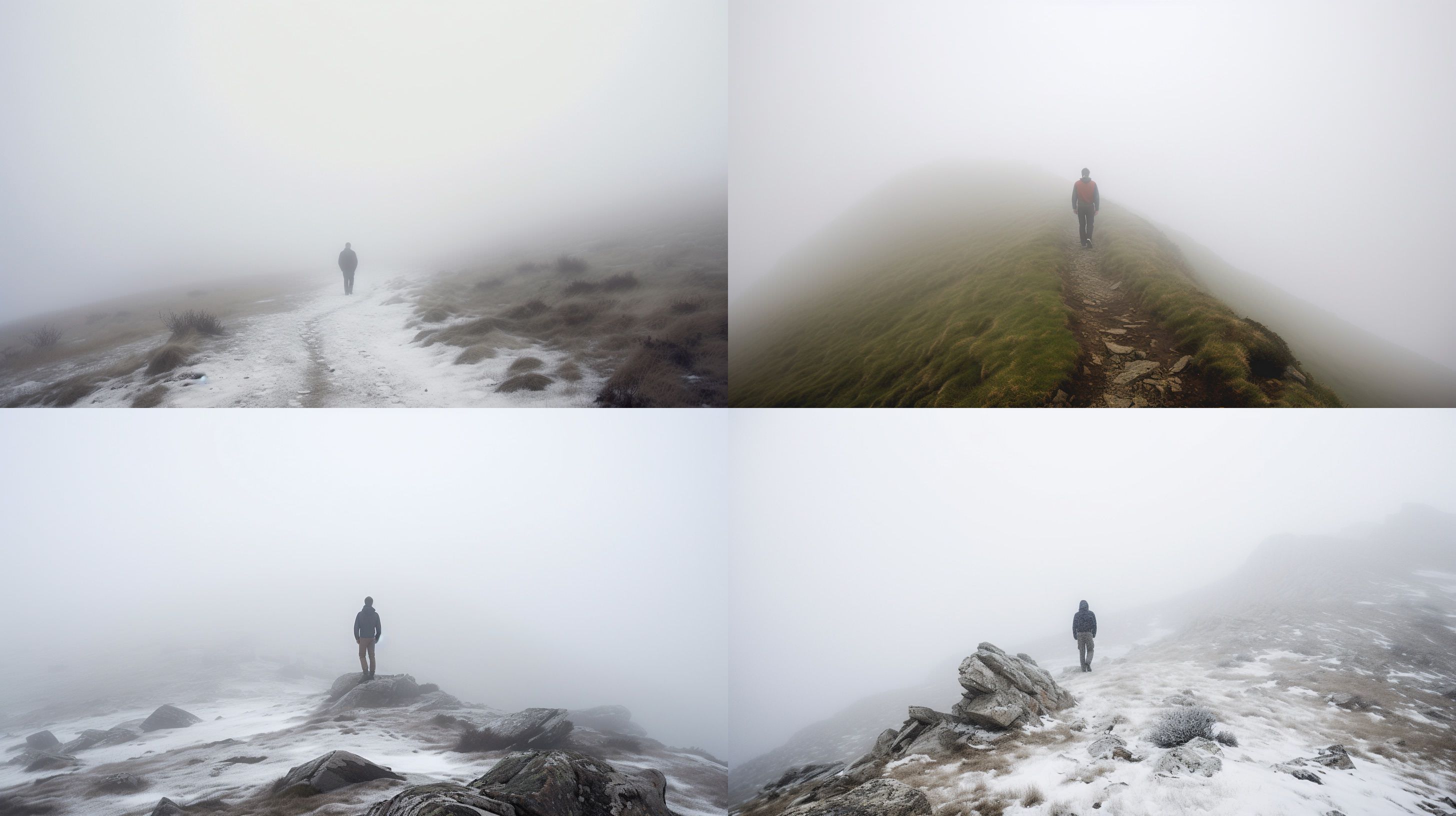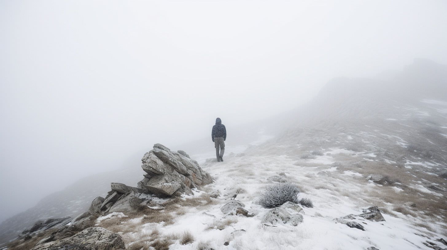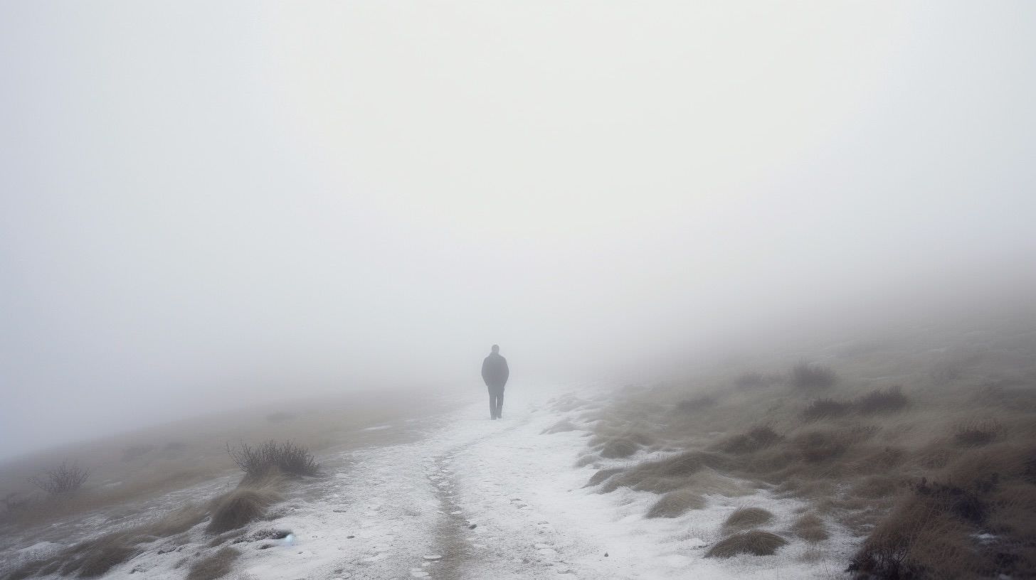 a man in the distance in dense white fog --ar 16:9 --v 5