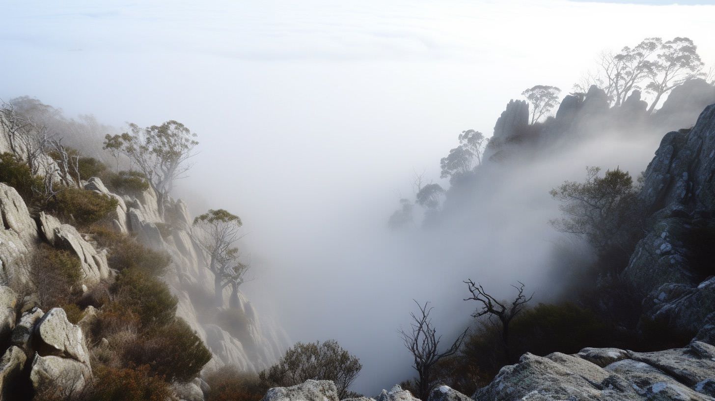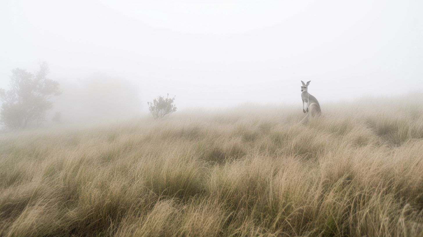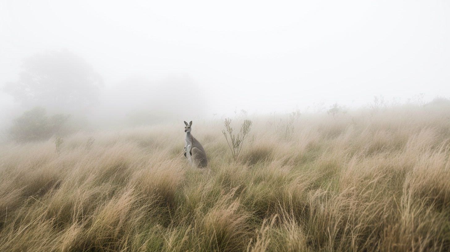 a kangaroo with in high grass in the distance in dense white fog --ar 16:9 --v 5
