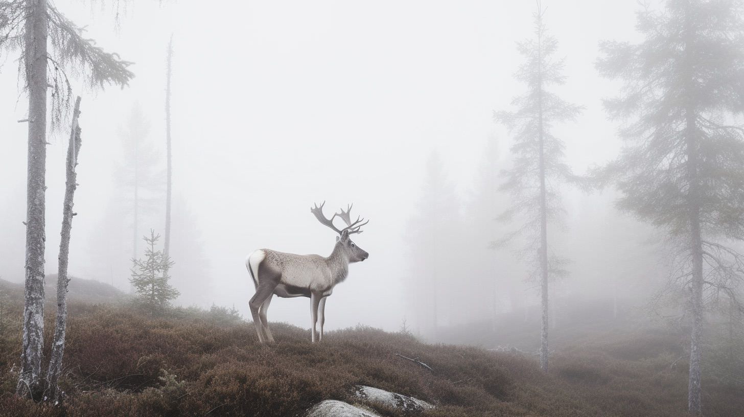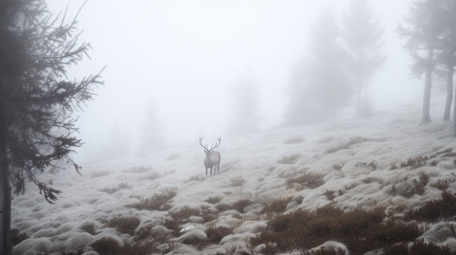 a reindeer in the distance in dense white fog. --ar 16:9 --v 5