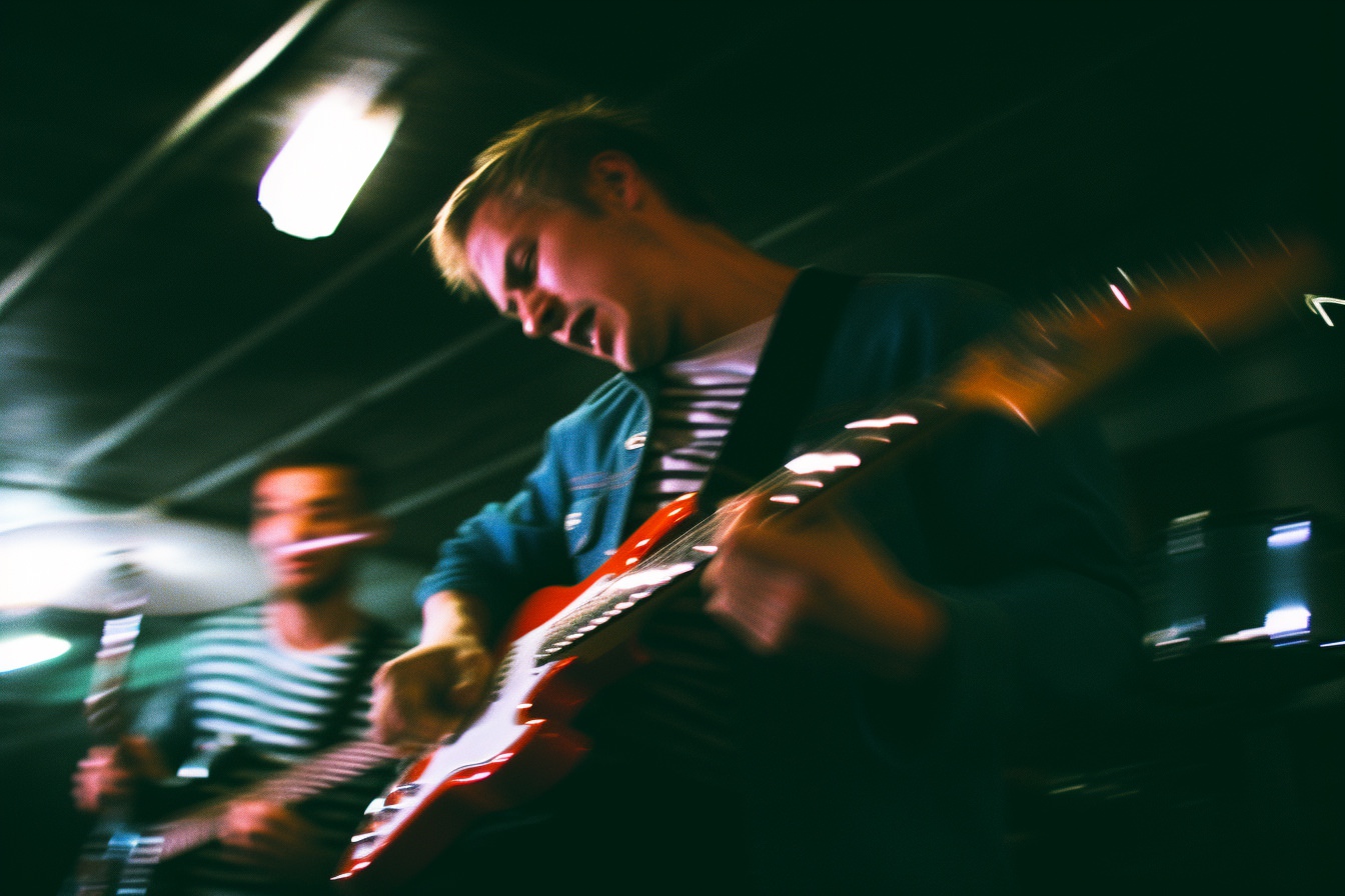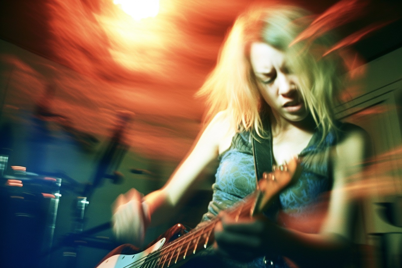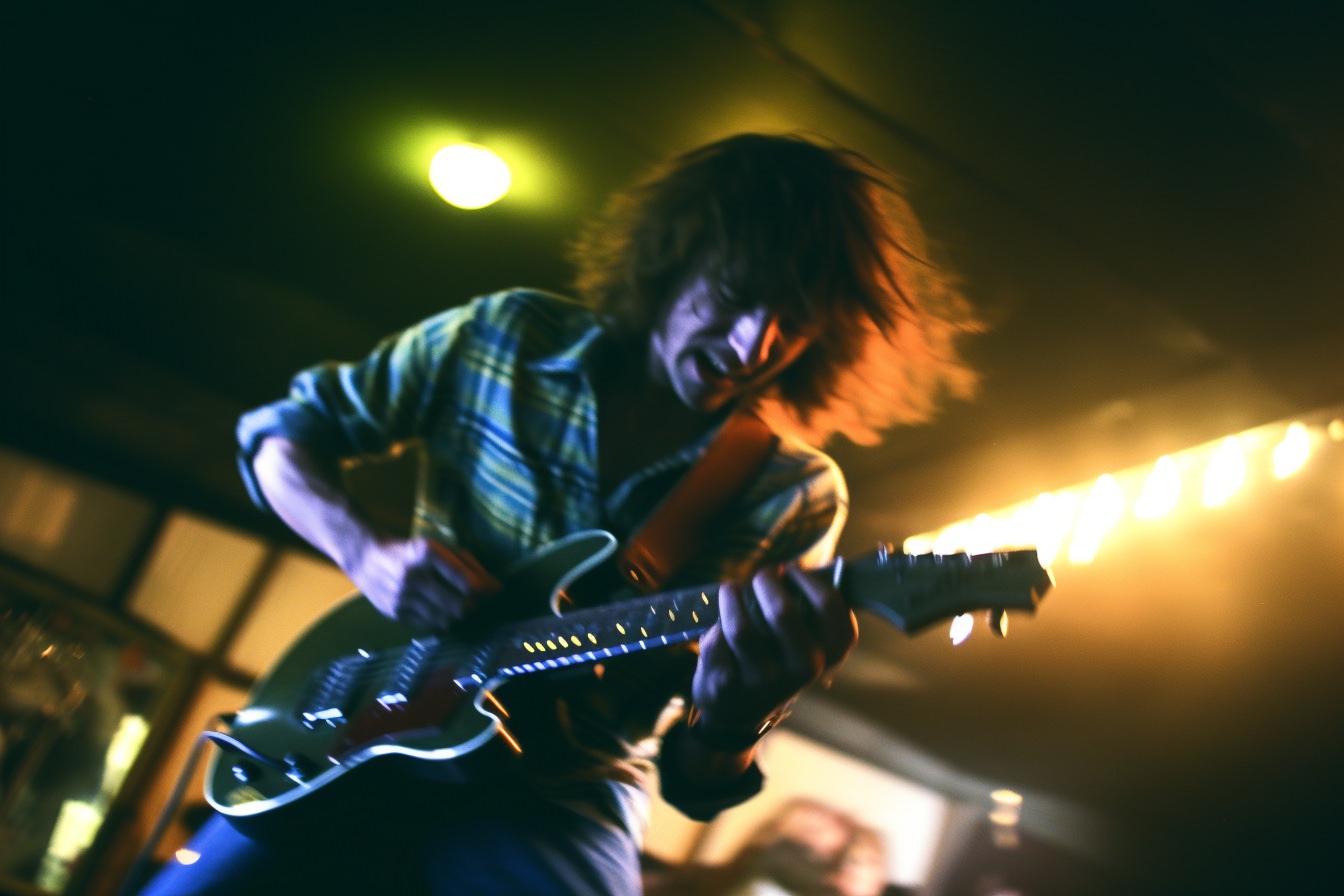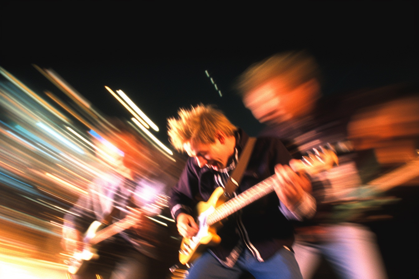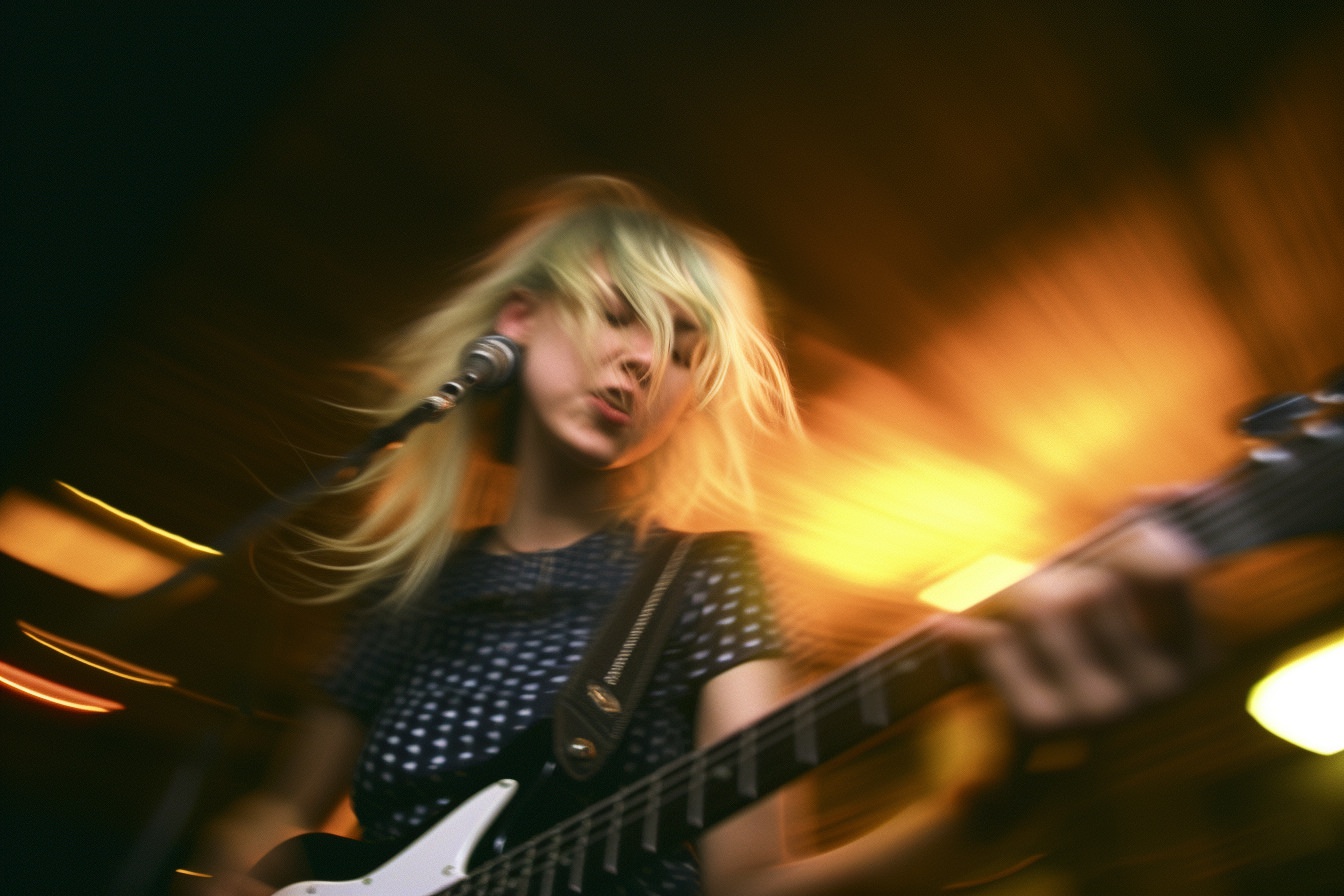 [Grunge/punk band] [singer/drummer/guitarist/Techno DJ] in a small club, color photography, intentional camera movement, flash photography, high speed sync, Contax 645, restrained forms, distorted bodies, grungewave, grindcore, slamdance --ar 3:2 --v 5.1
