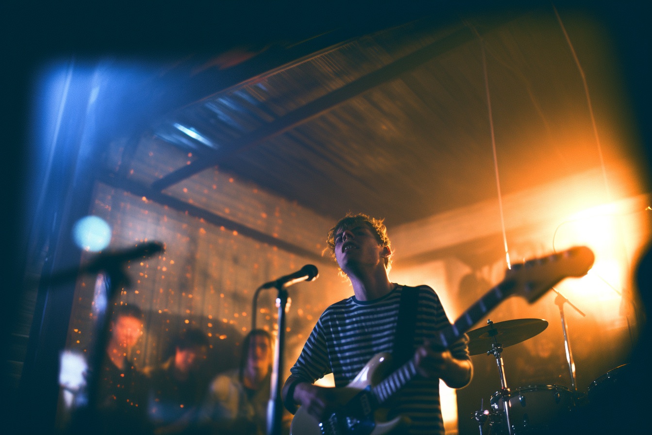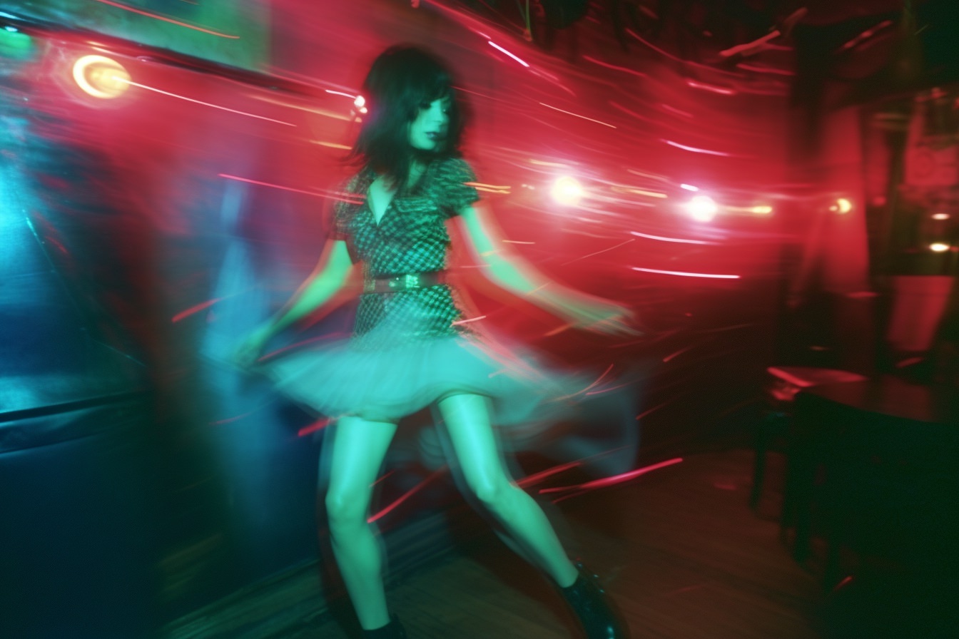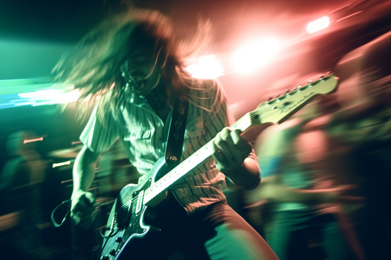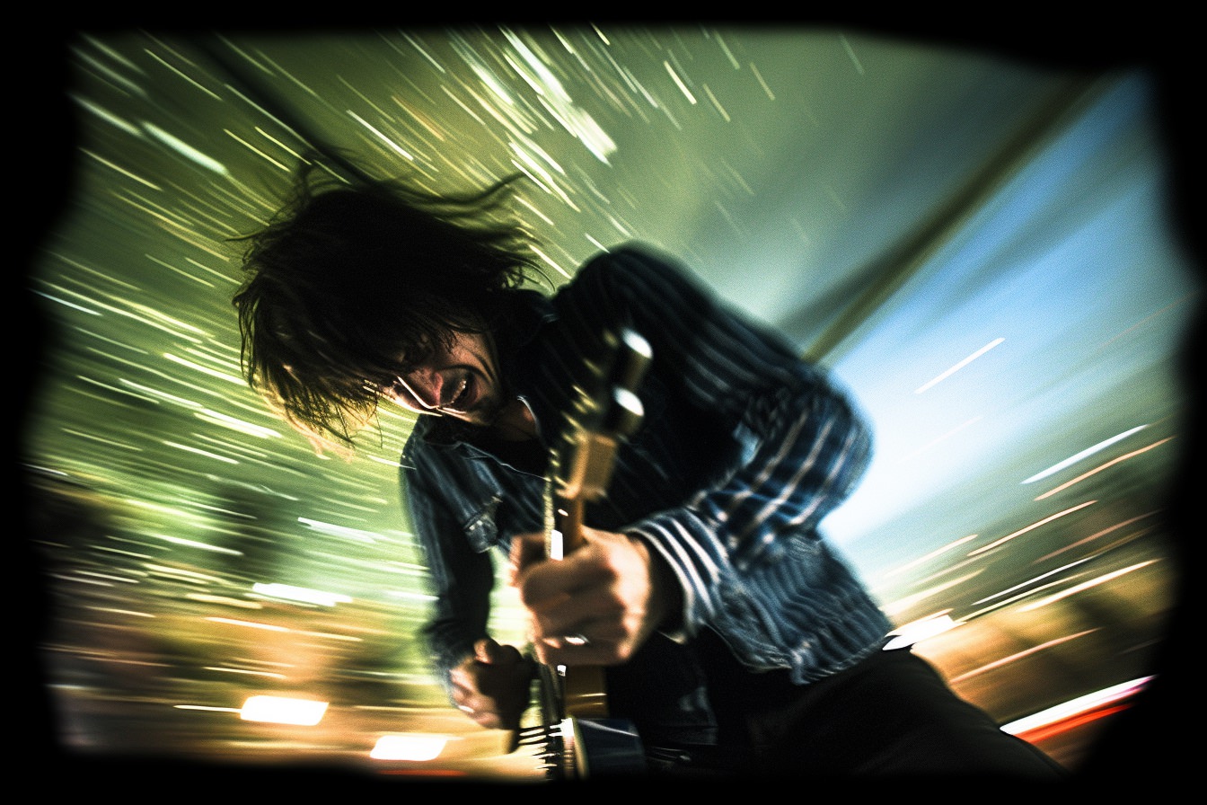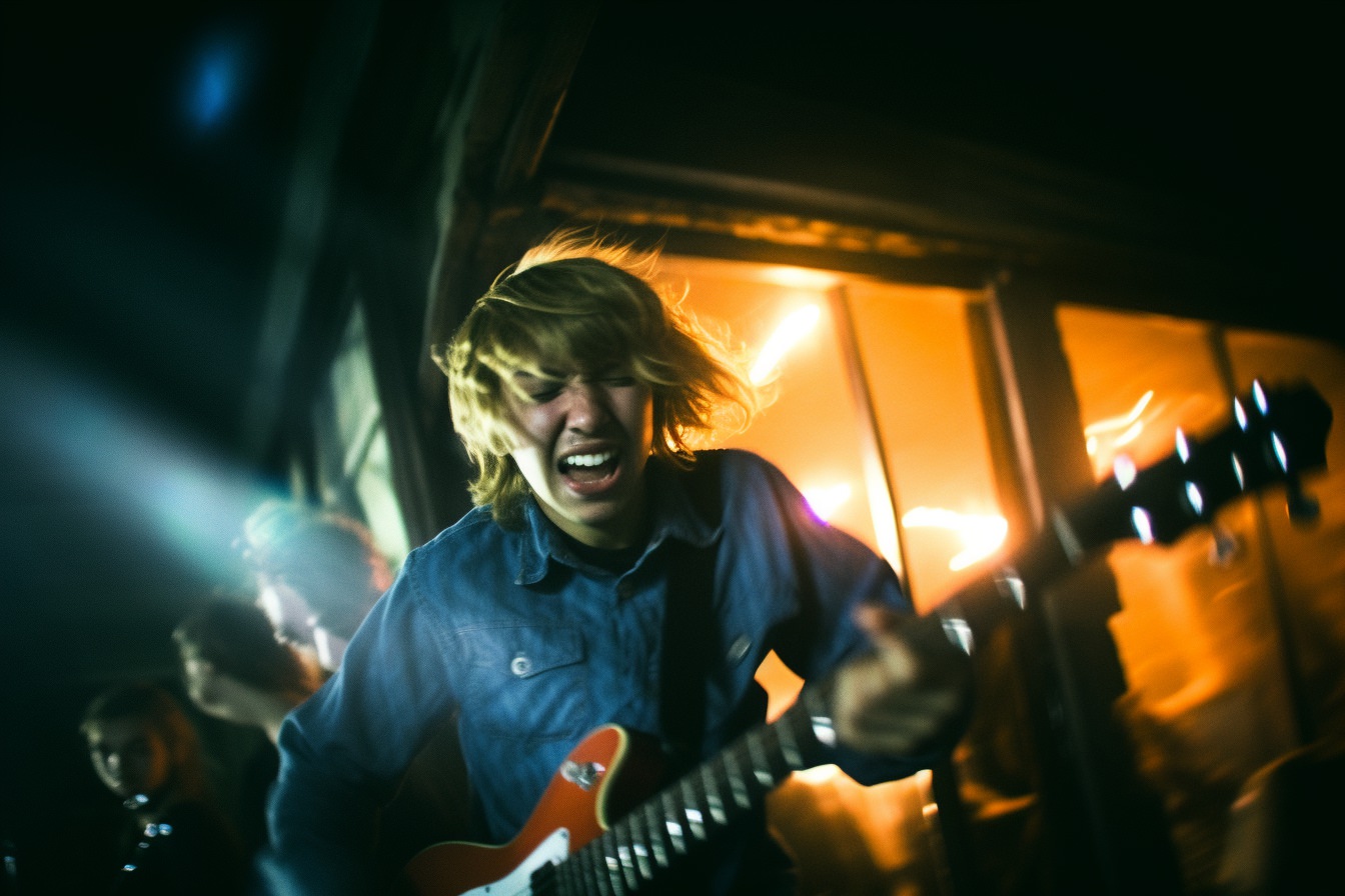 [Grunge/punk band] [singer/drummer/guitarist/Techno DJ] in a small club, color photography, intentional camera movement, flash photography, high speed sync, Contax 645, restrained forms, distorted bodies, grungewave, grindcore, slamdance --ar 3:2 --v 5.1