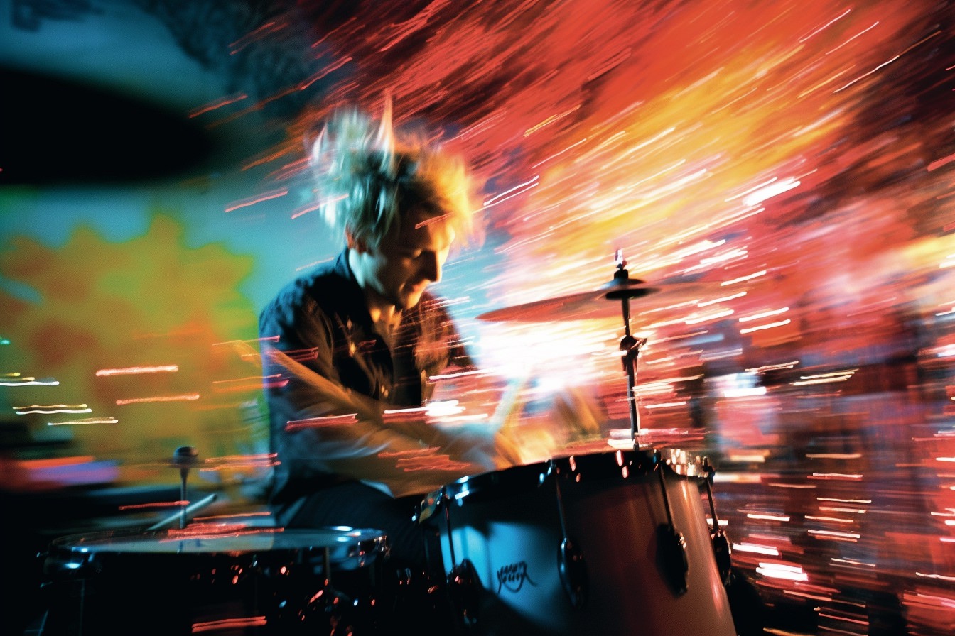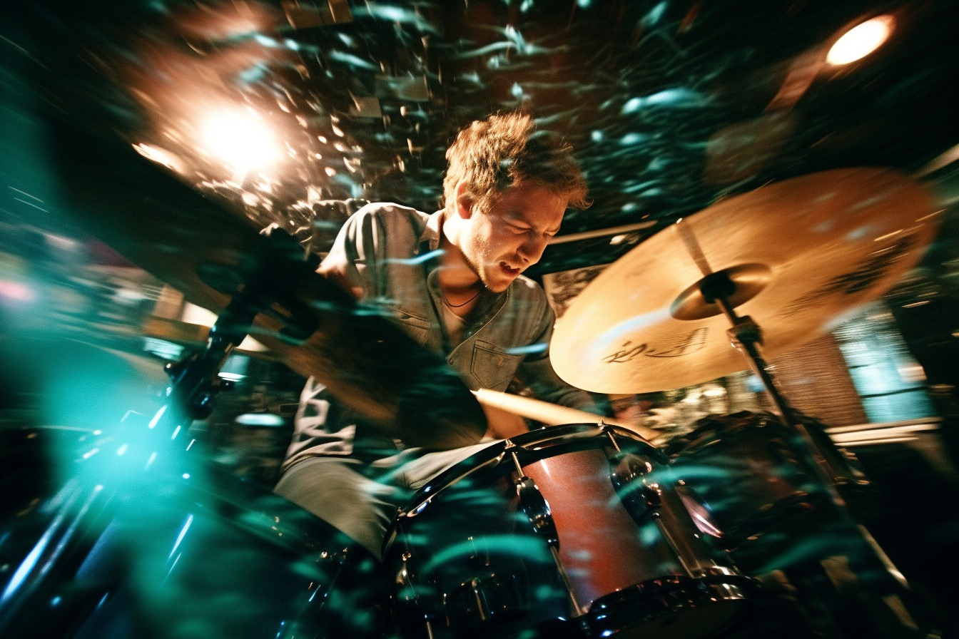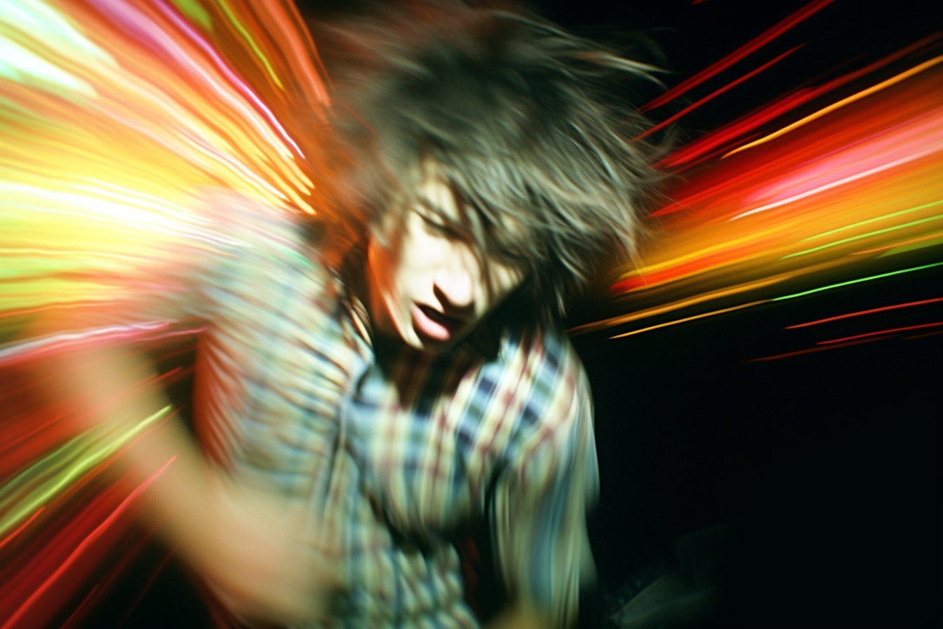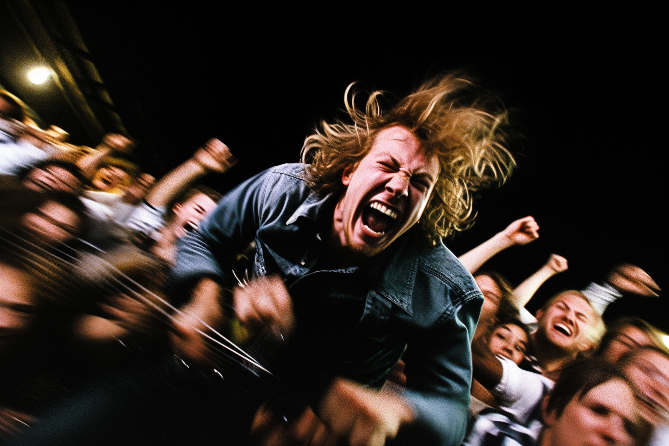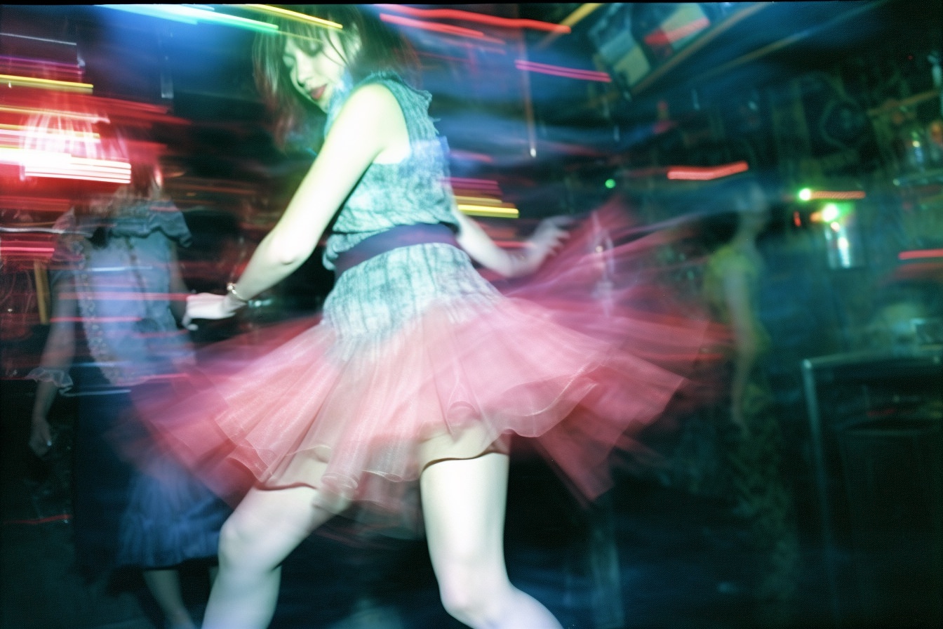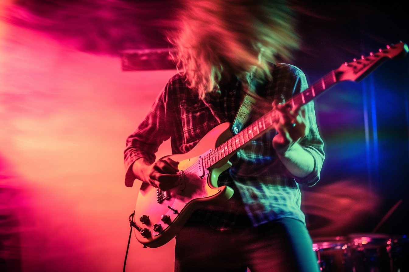[Grunge/punk band] [singer/drummer/guitarist/Techno DJ] in a small club, color photography, intentional camera movement, flash photography, high speed sync, Contax 645, restrained forms, distorted bodies, grungewave, grindcore, slamdance --ar 3:2 --v 5.1