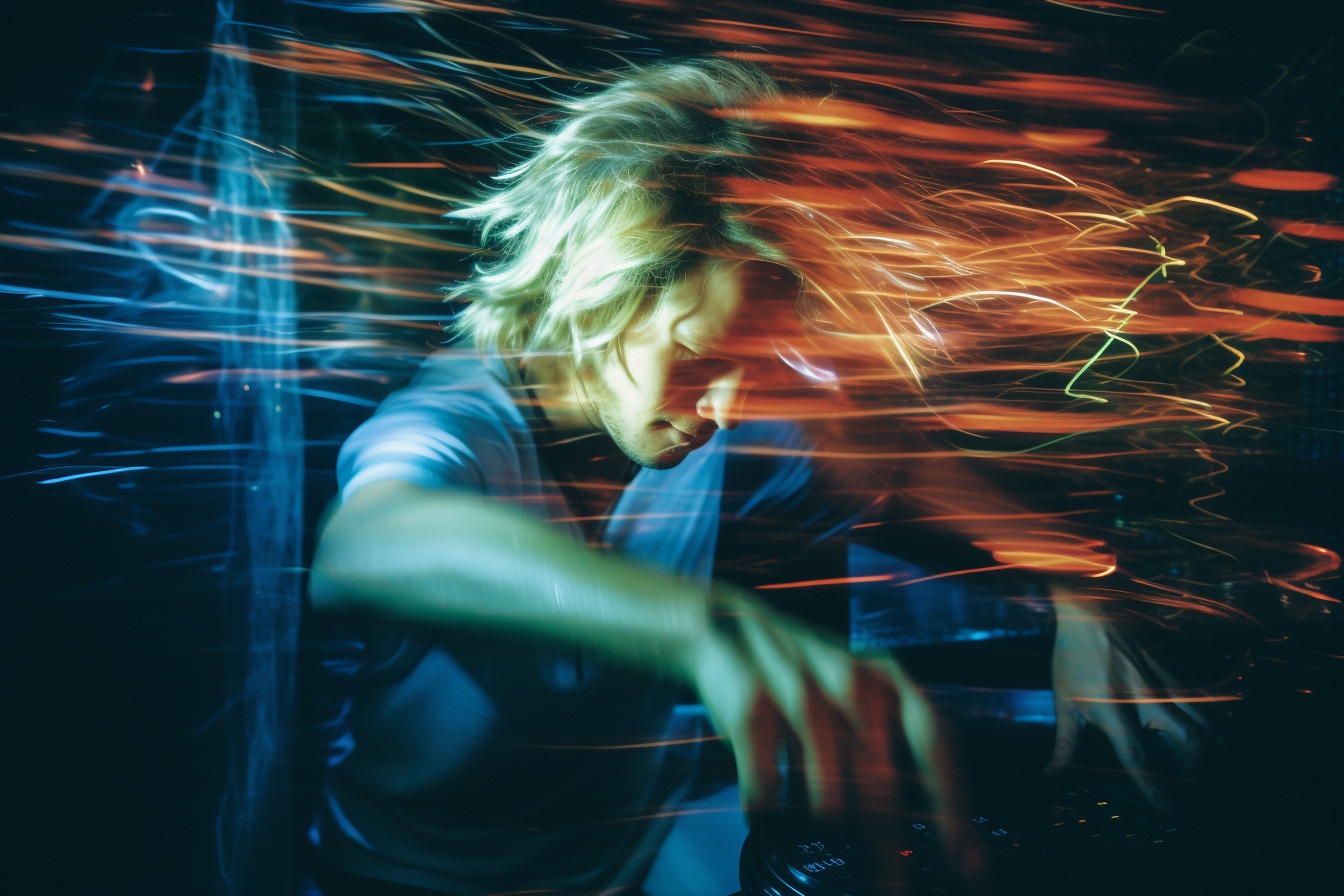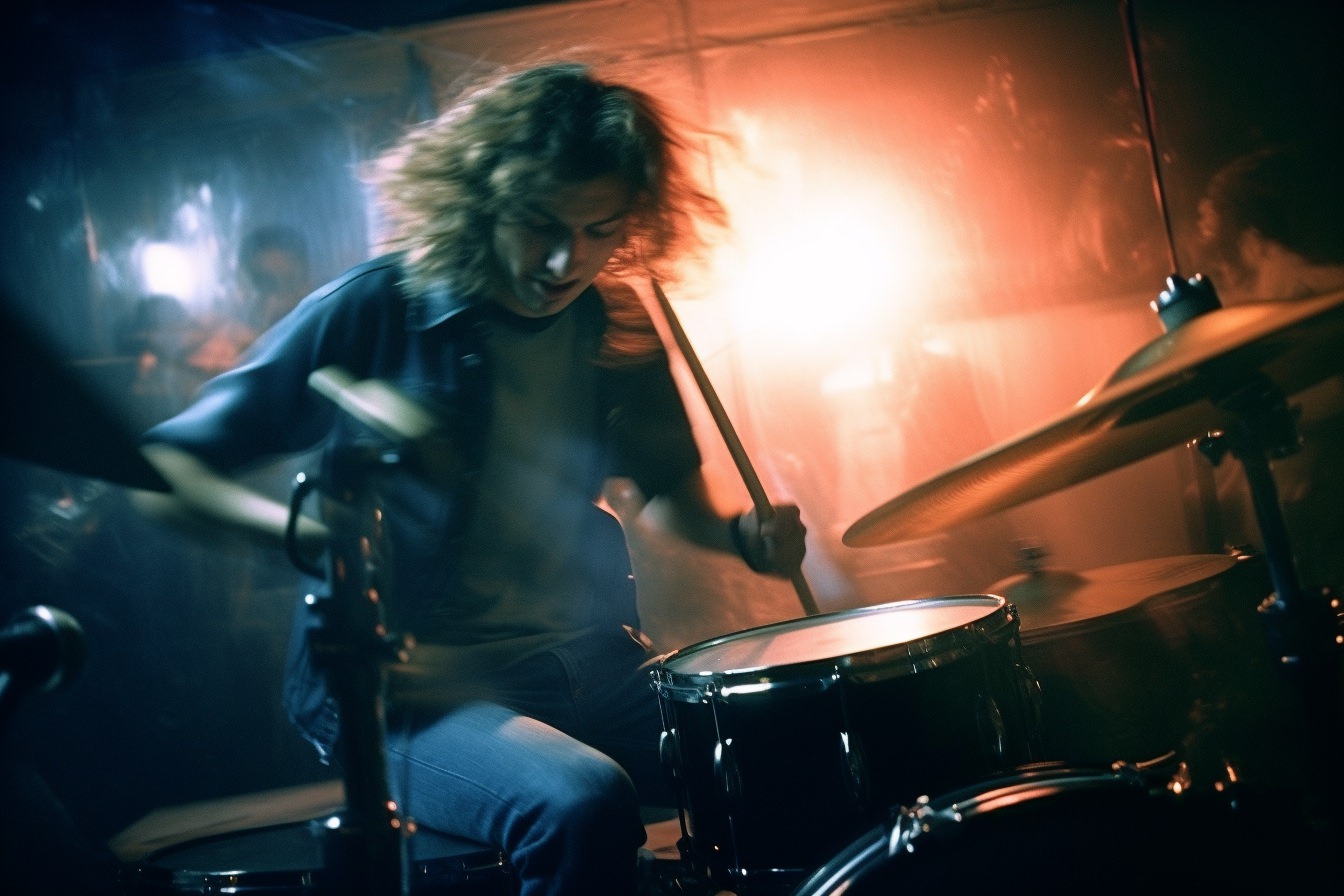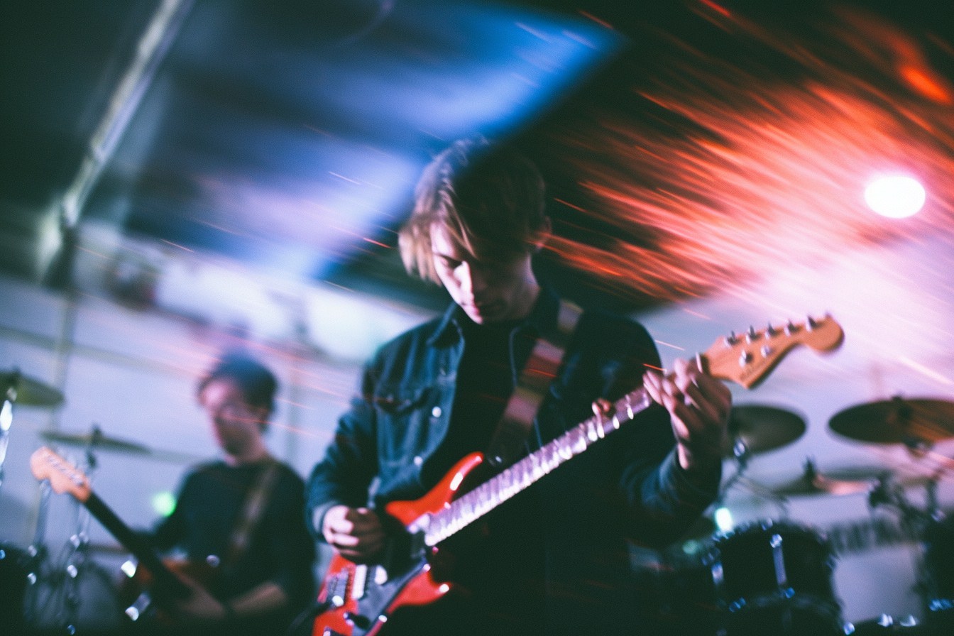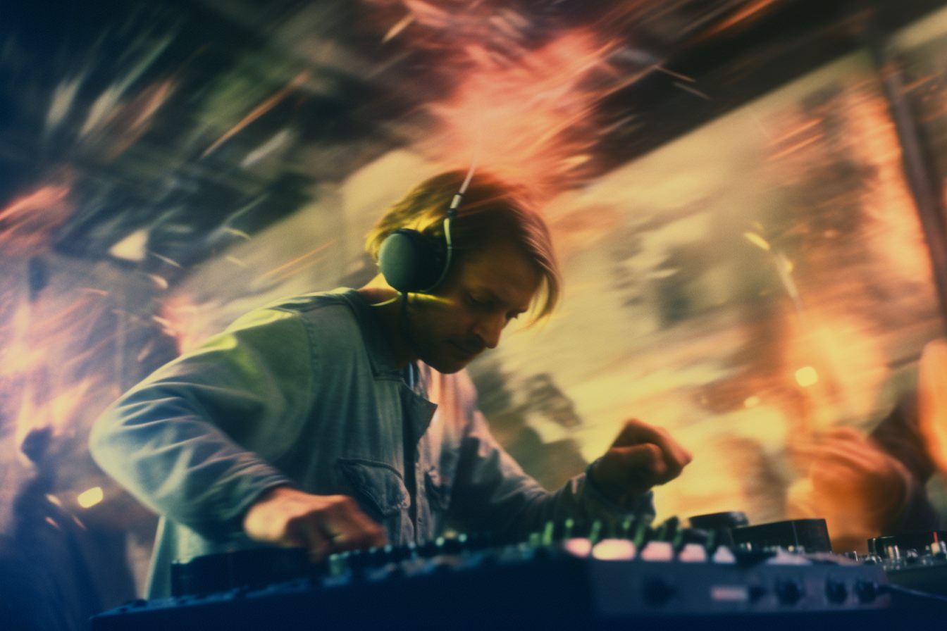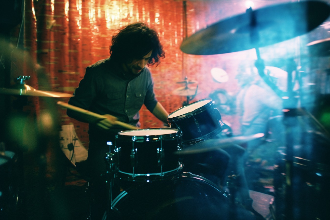 [Grunge/punk band] [singer/drummer/guitarist/Techno DJ] in a small club, color photography, intentional camera movement, flash photography, high speed sync, Contax 645, restrained forms, distorted bodies, grungewave, grindcore, slamdance --ar 3:2 --v 5.1