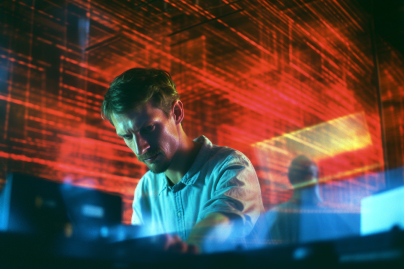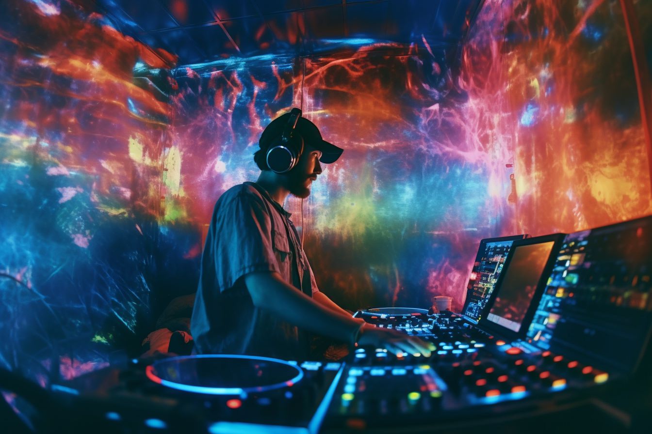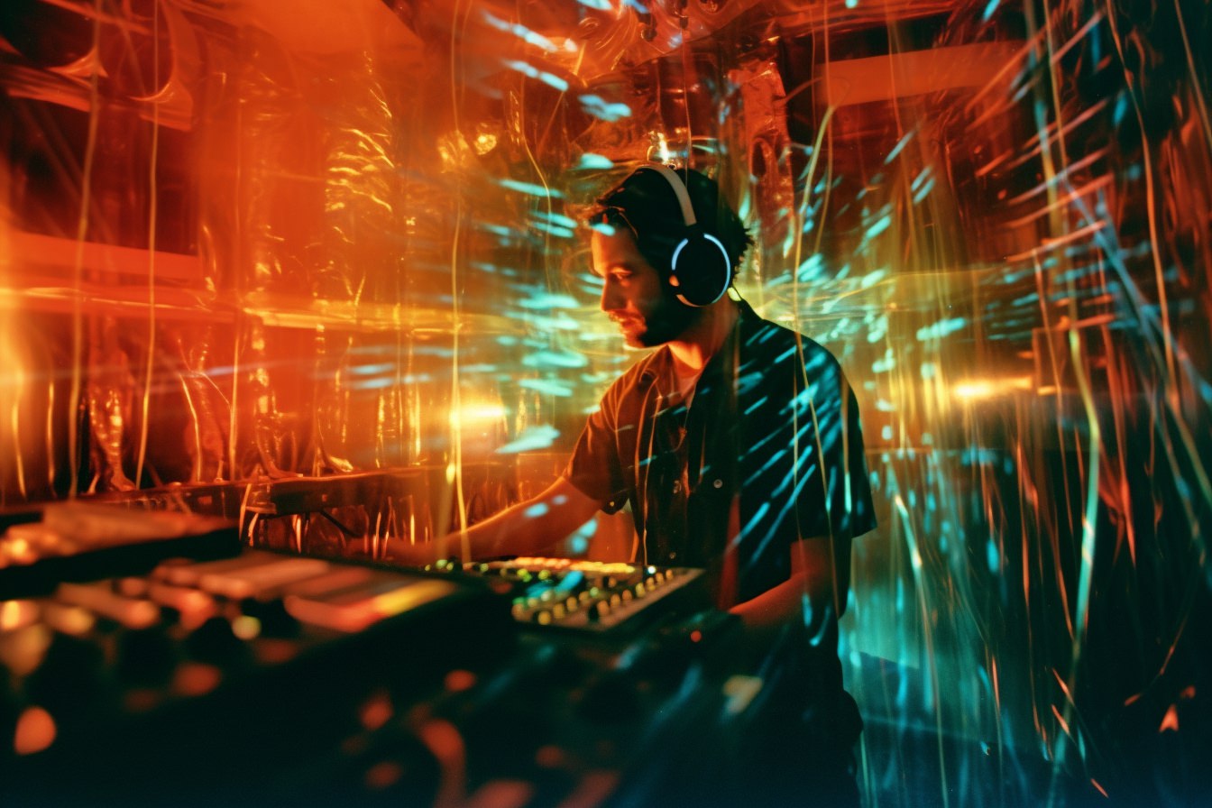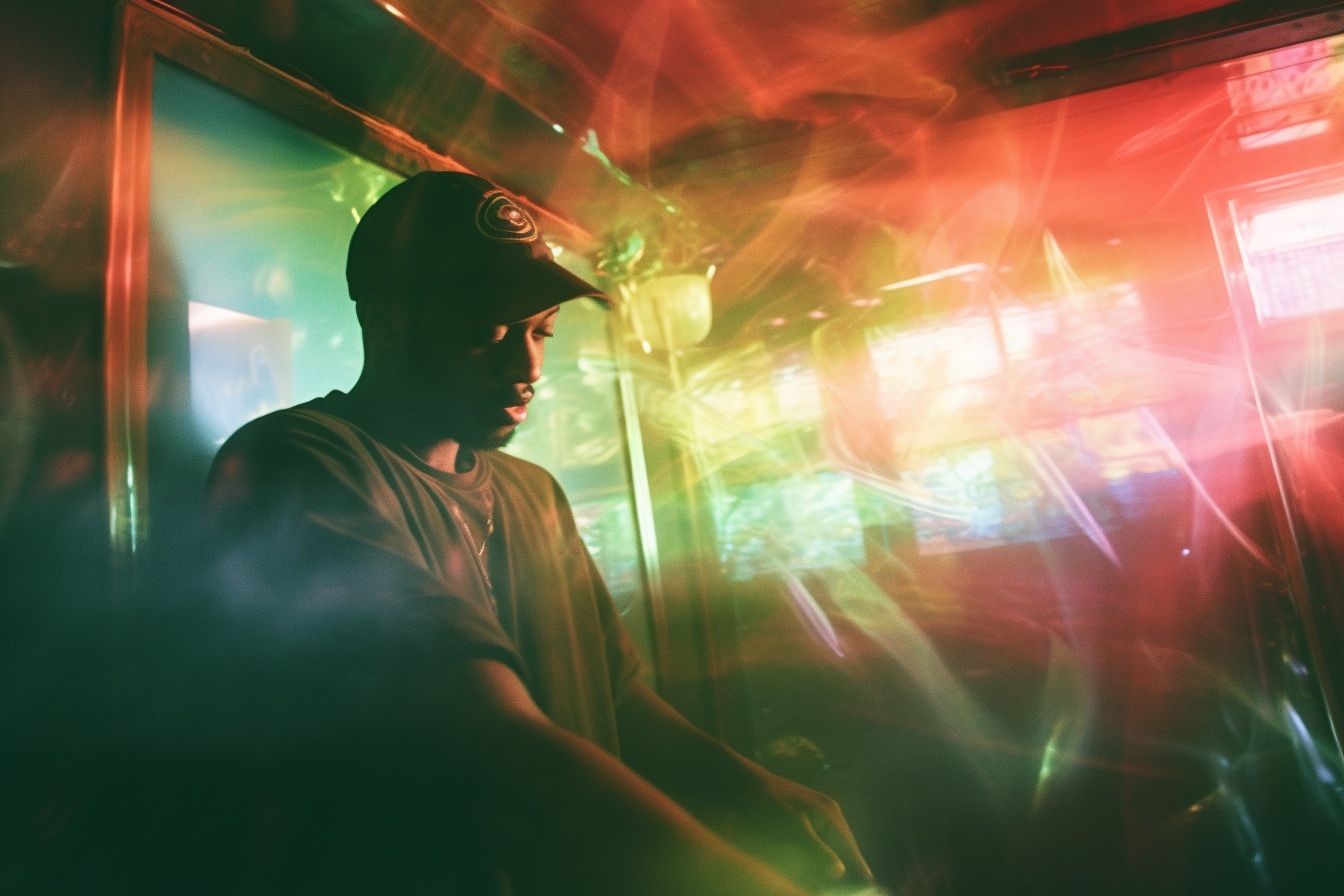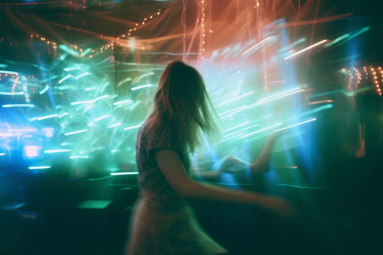 [Grunge/punk band] [singer/drummer/guitarist/Techno DJ] in a small club, color photography, intentional camera movement, flash photography, high speed sync, Contax 645, restrained forms, distorted bodies, grungewave, grindcore, slamdance --ar 3:2 --v 5.1