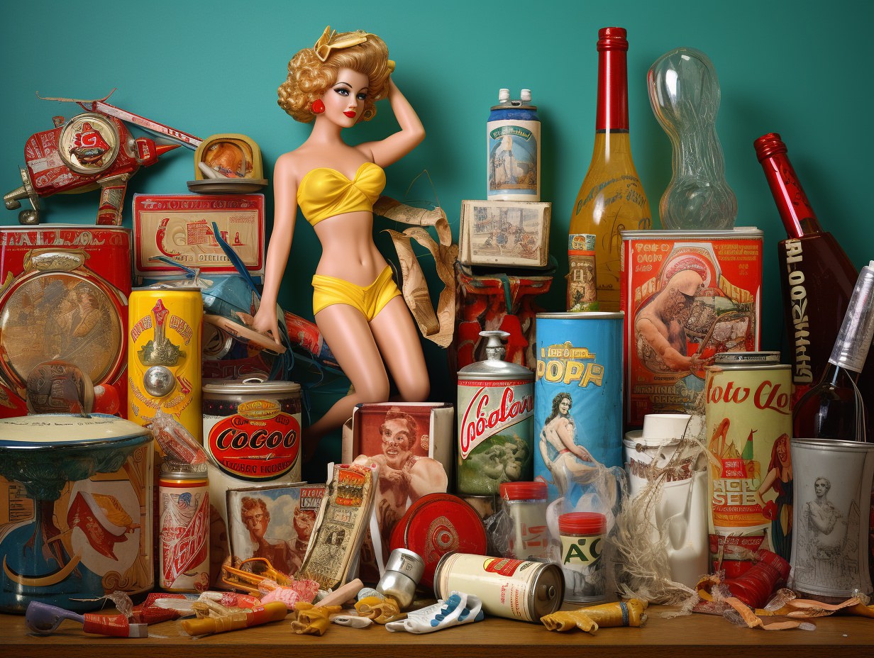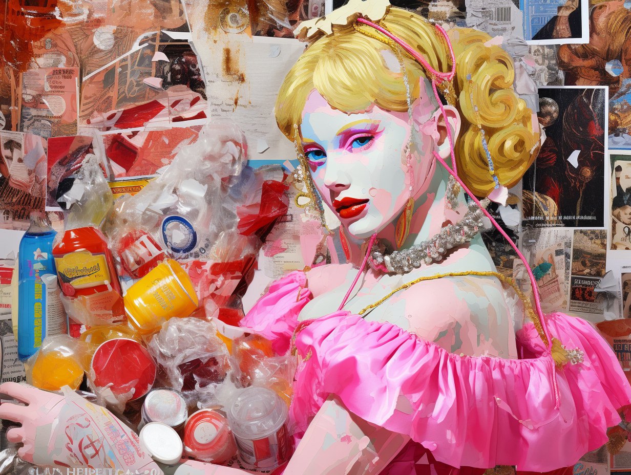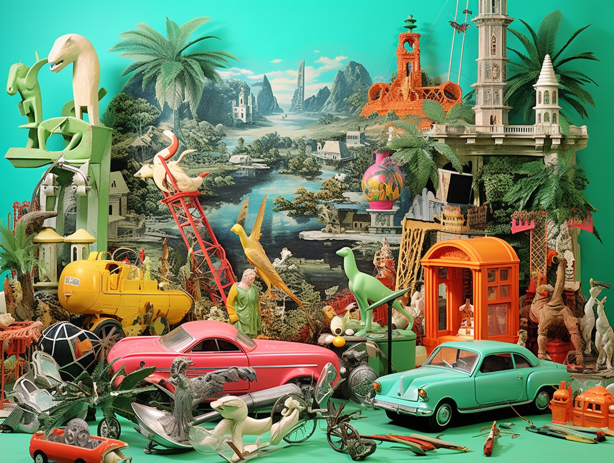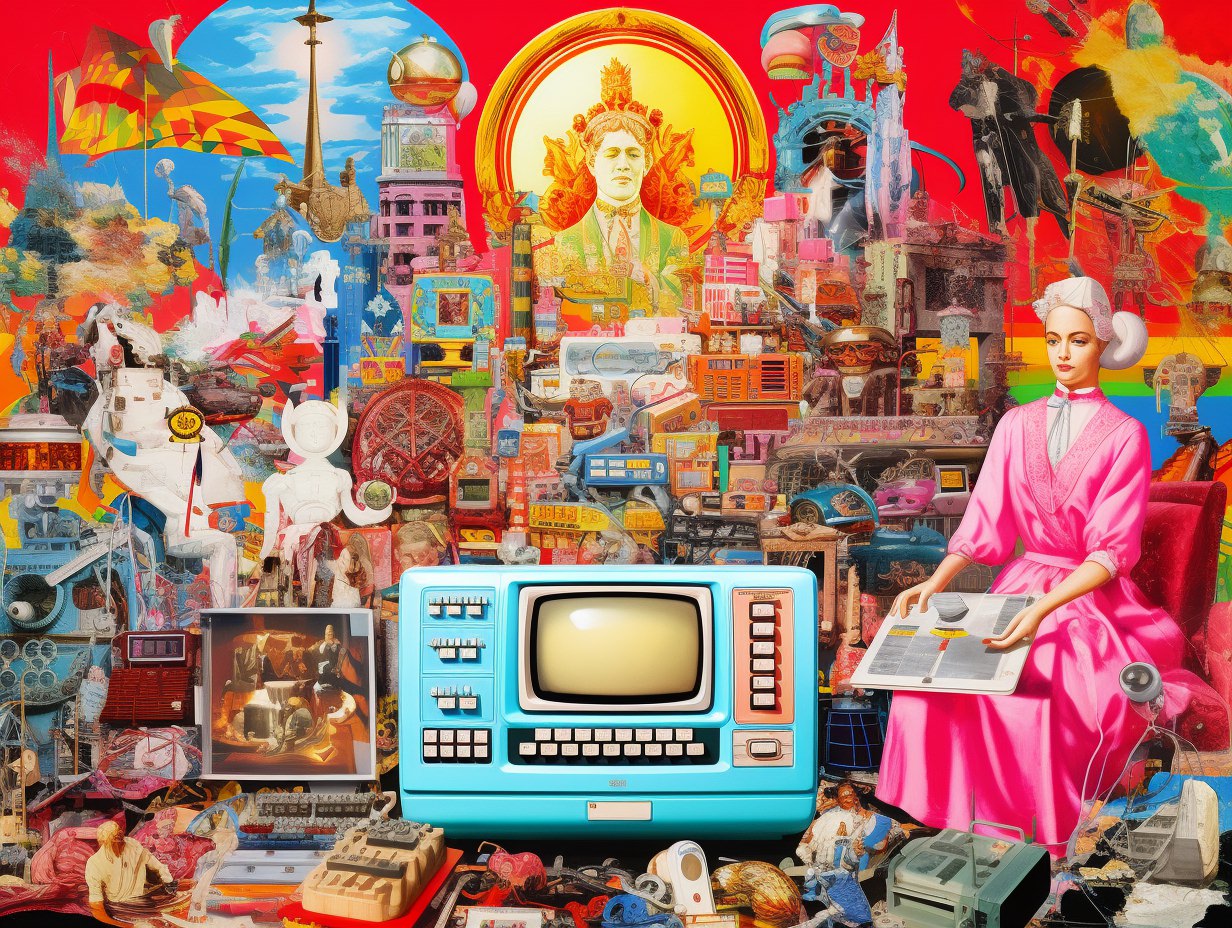 Nostalgic kitsch collage depicting [subject], popular culture, poor taste, mass-produced, gaudy, sentimental, high art vs low art, irony, garish, repurposed, vibrant colors (of [COLOR]), plastic finishes, faux finishes, consumer culture and mass production, authenticity, artistic value, boundaries of taste —ar 4:3