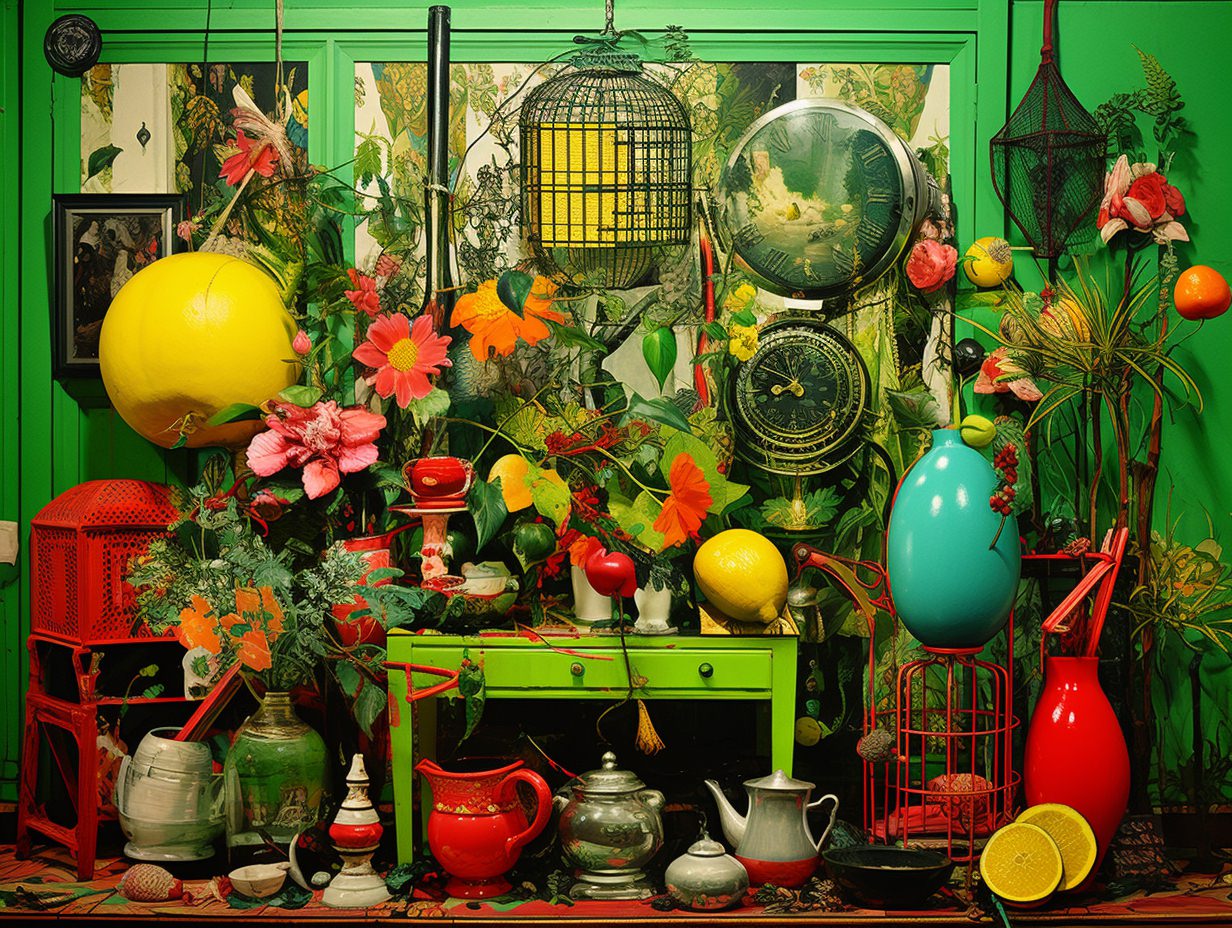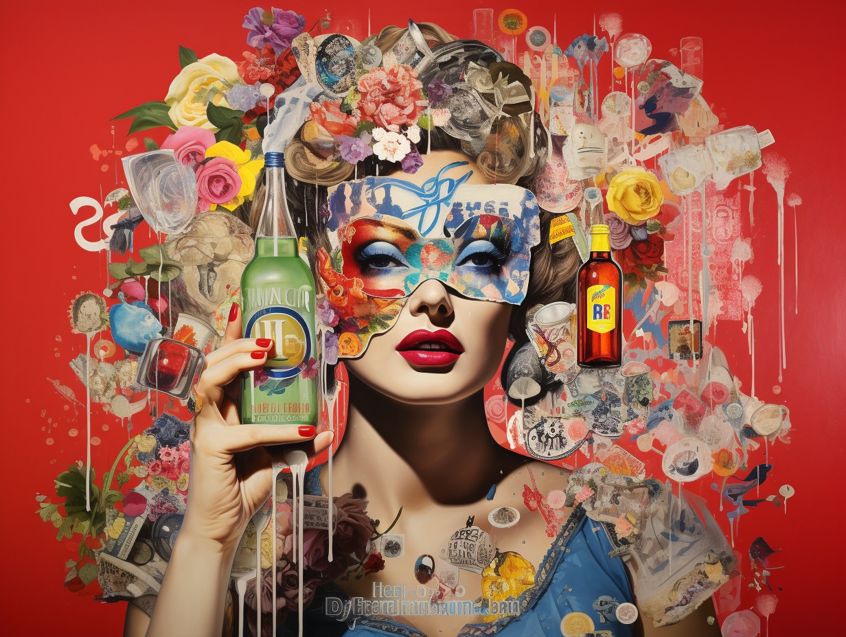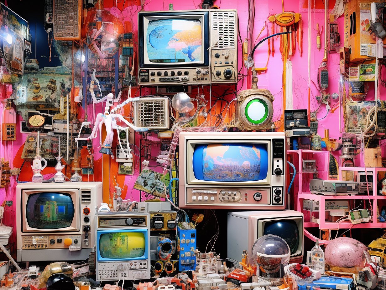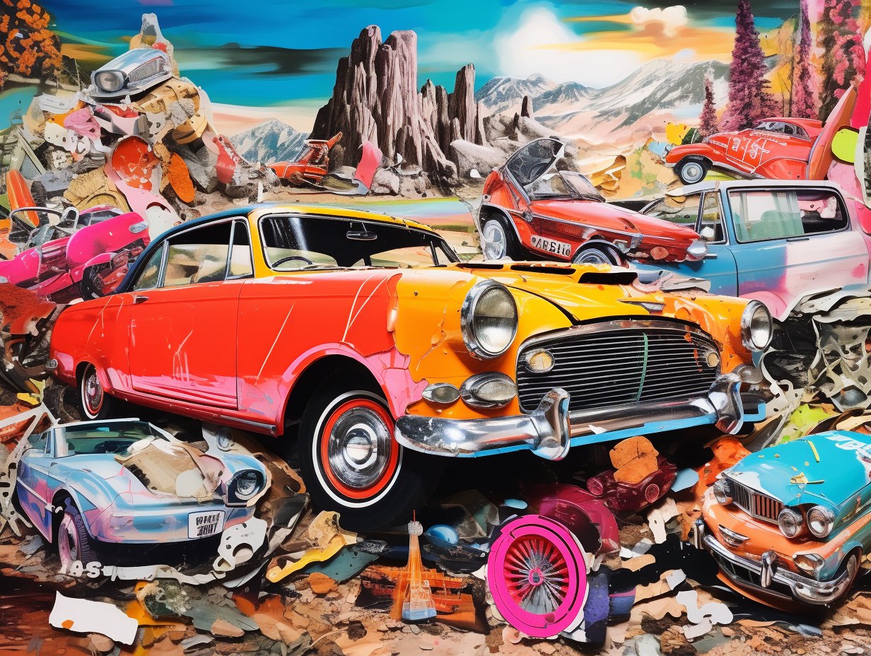 Nostalgic kitsch collage depicting [subject], popular culture, poor taste, mass-produced, gaudy, sentimental, high art vs low art, irony, garish, repurposed, vibrant colors (of [COLOR]), plastic finishes, faux finishes, consumer culture and mass production, authenticity, artistic value, boundaries of taste —ar 4:3