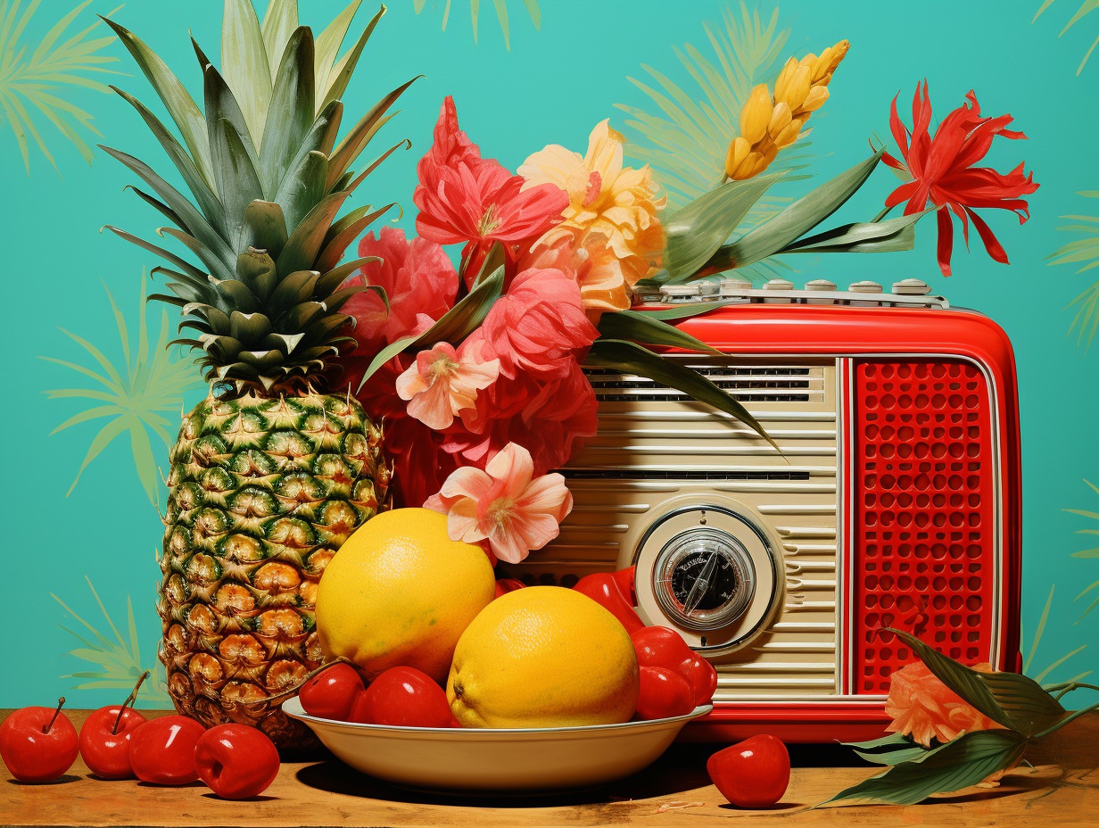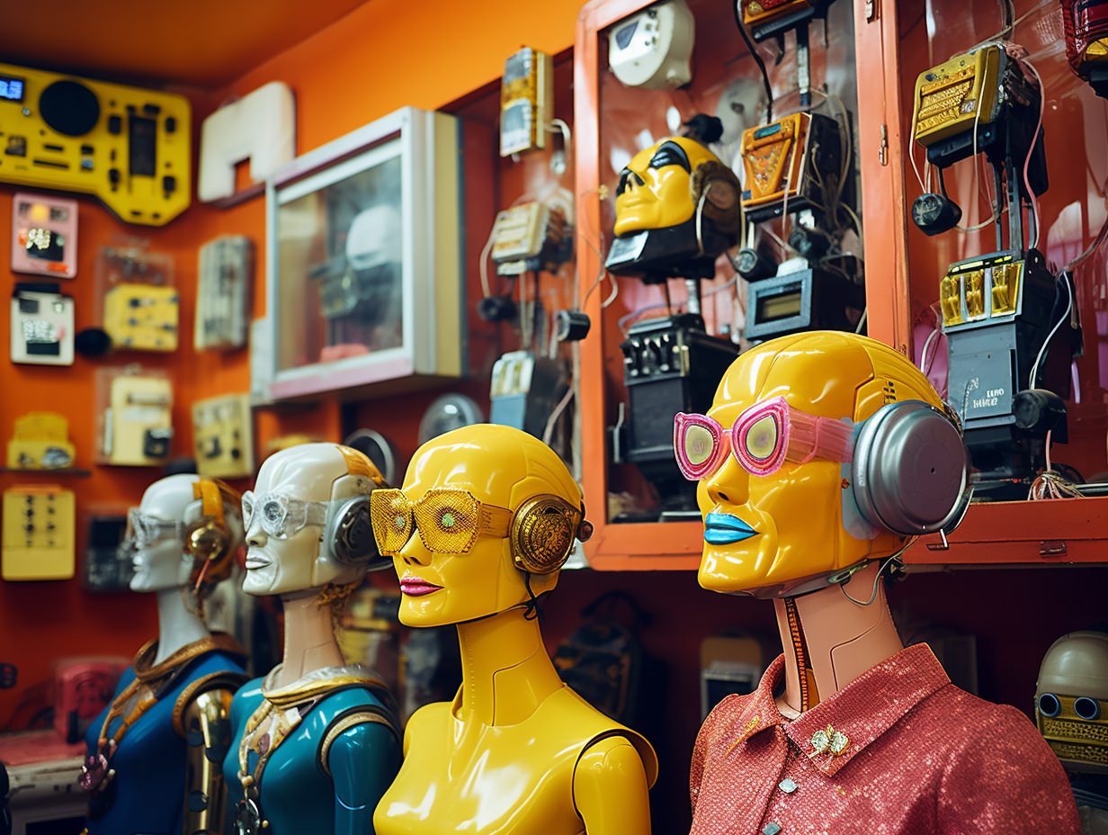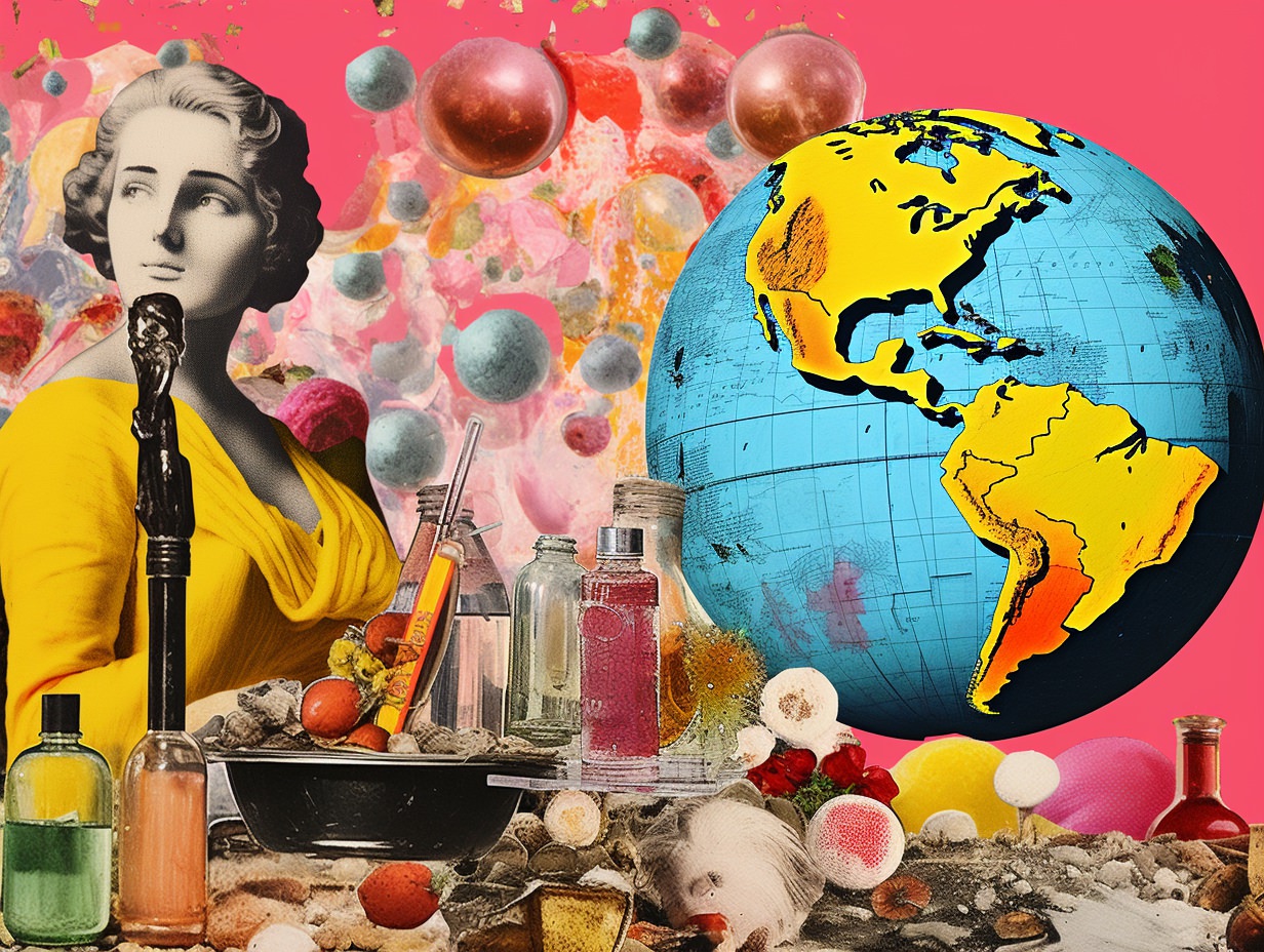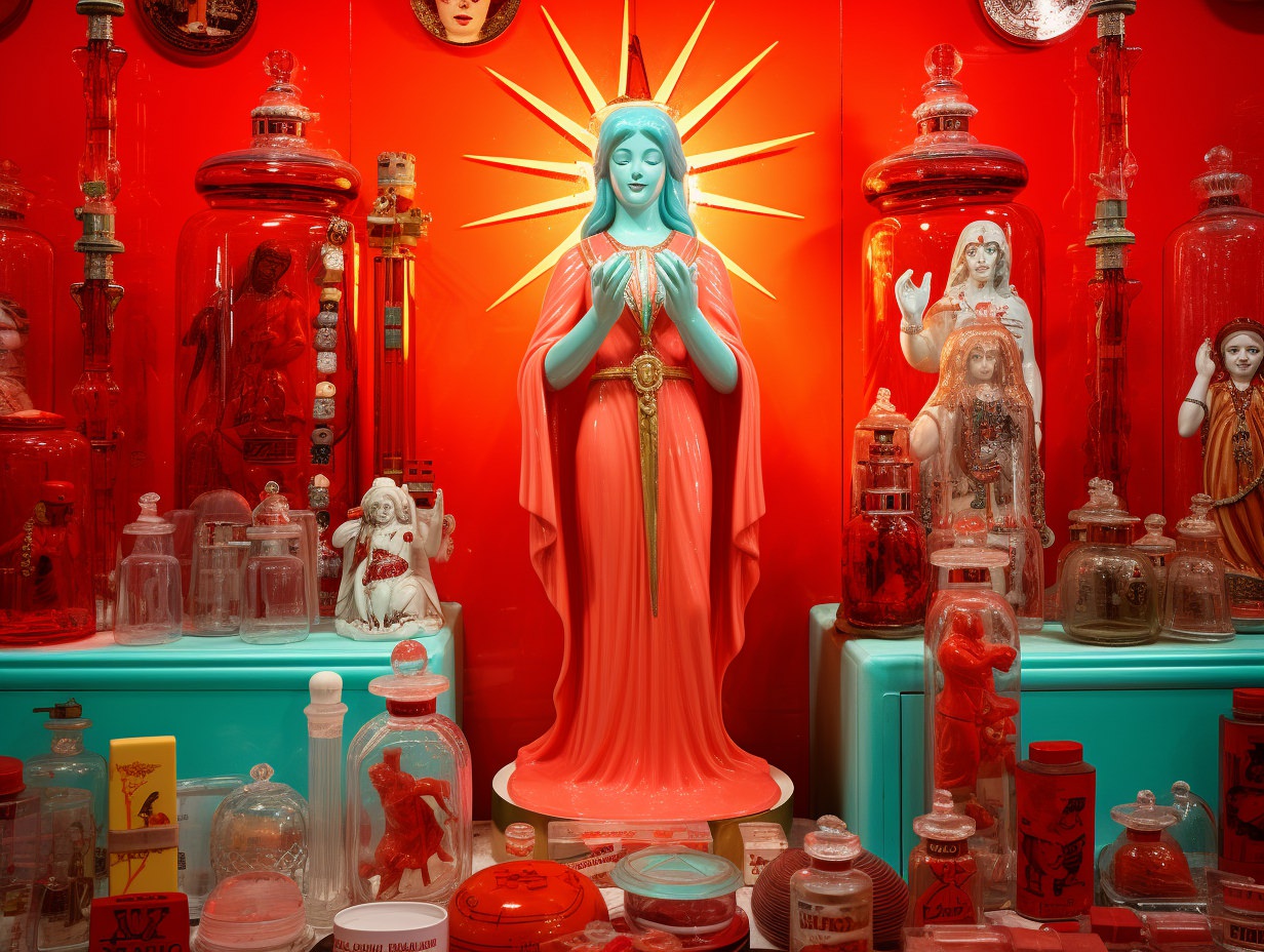 Nostalgic kitsch collage depicting [subject], popular culture, poor taste, mass-produced, gaudy, sentimental, high art vs low art, irony, garish, repurposed, vibrant colors (of [COLOR]), plastic finishes, faux finishes, consumer culture and mass production, authenticity, artistic value, boundaries of taste —ar 4:3
