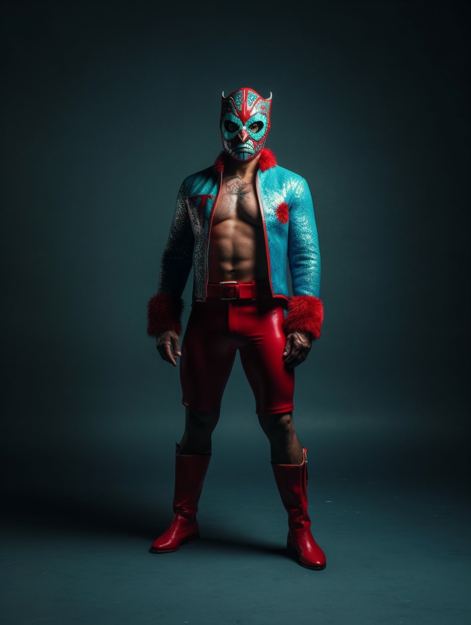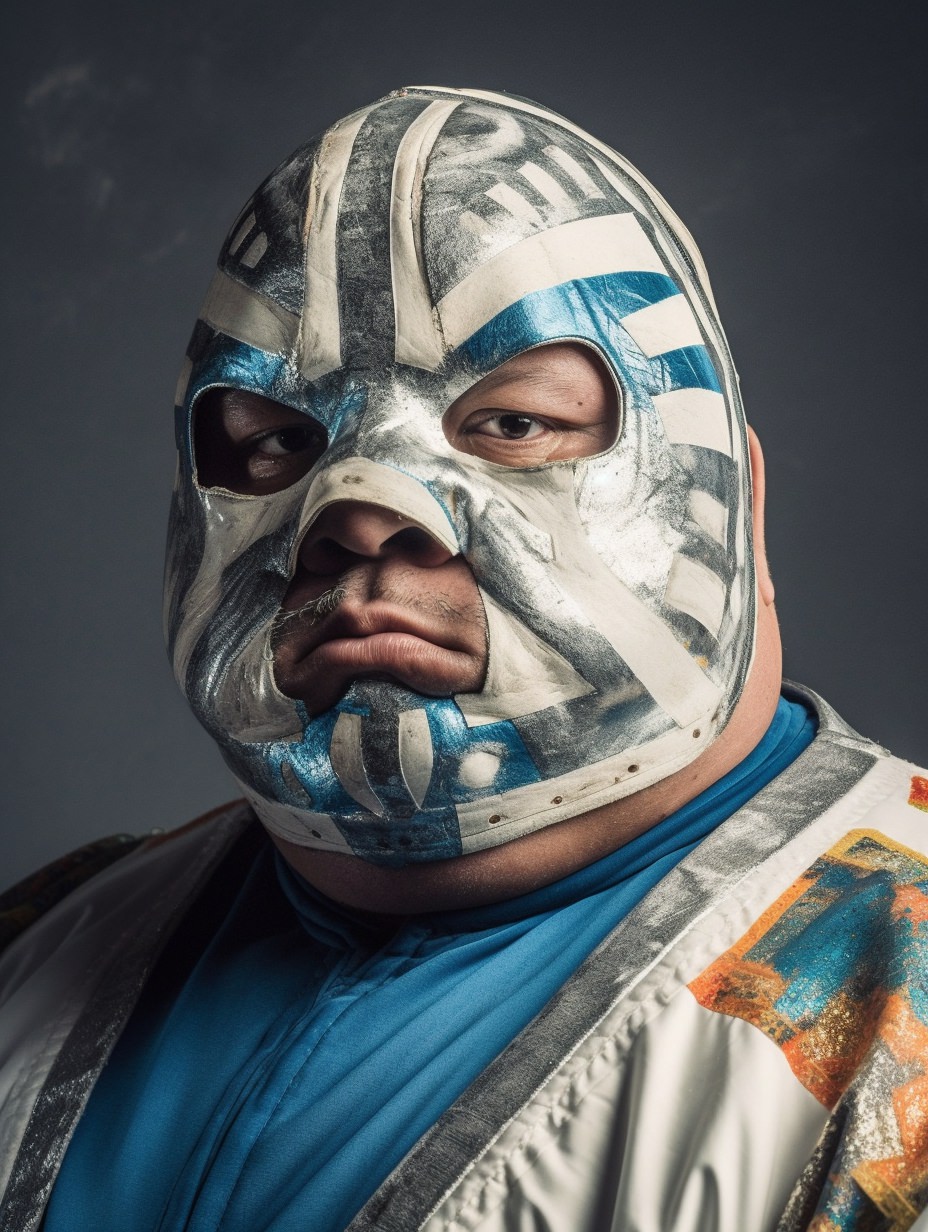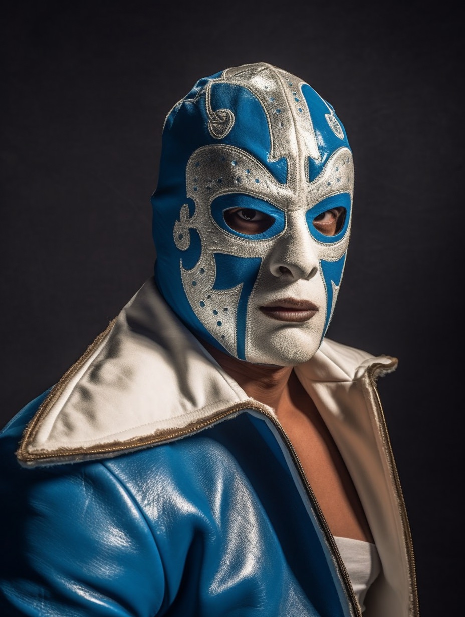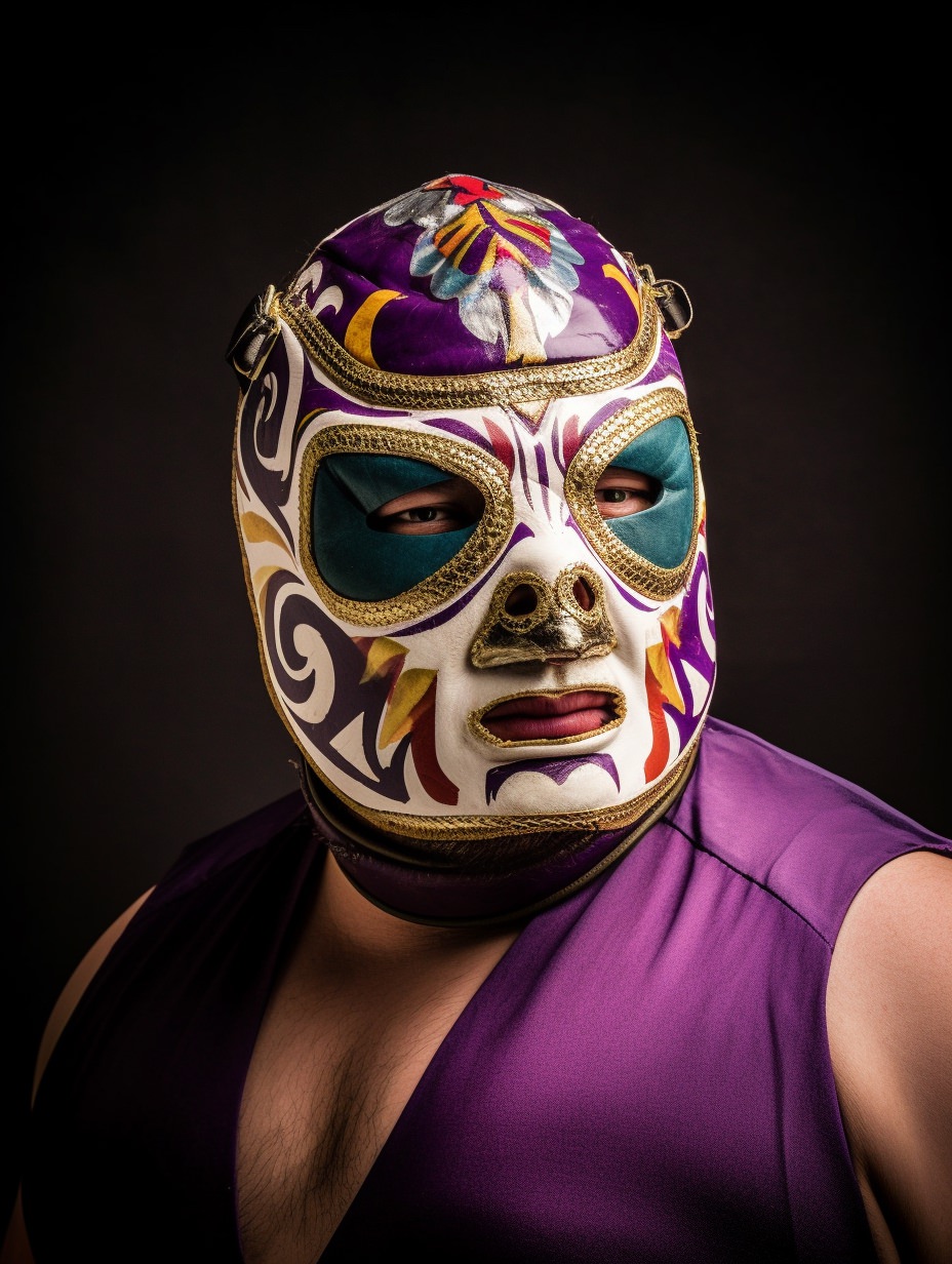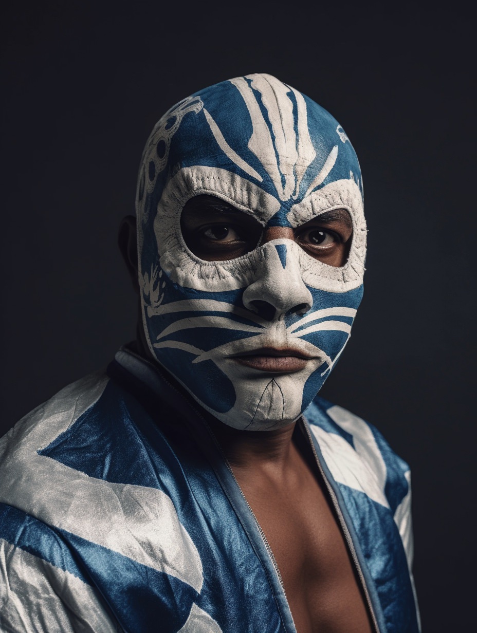 studio portrait shot of {chubby,muscular,lean} luchador with white and {blue,red,purple} leather mask, luchadores, Mexico, masked wrestlers, lucha libre, athleticism, theatricality, tradition, iconic masks, personas, storylines, high-flying acrobatics, cultural heritage, colorful spectacle, passionate spirit --v 5 --ar 3:4 --c 8 --s 750