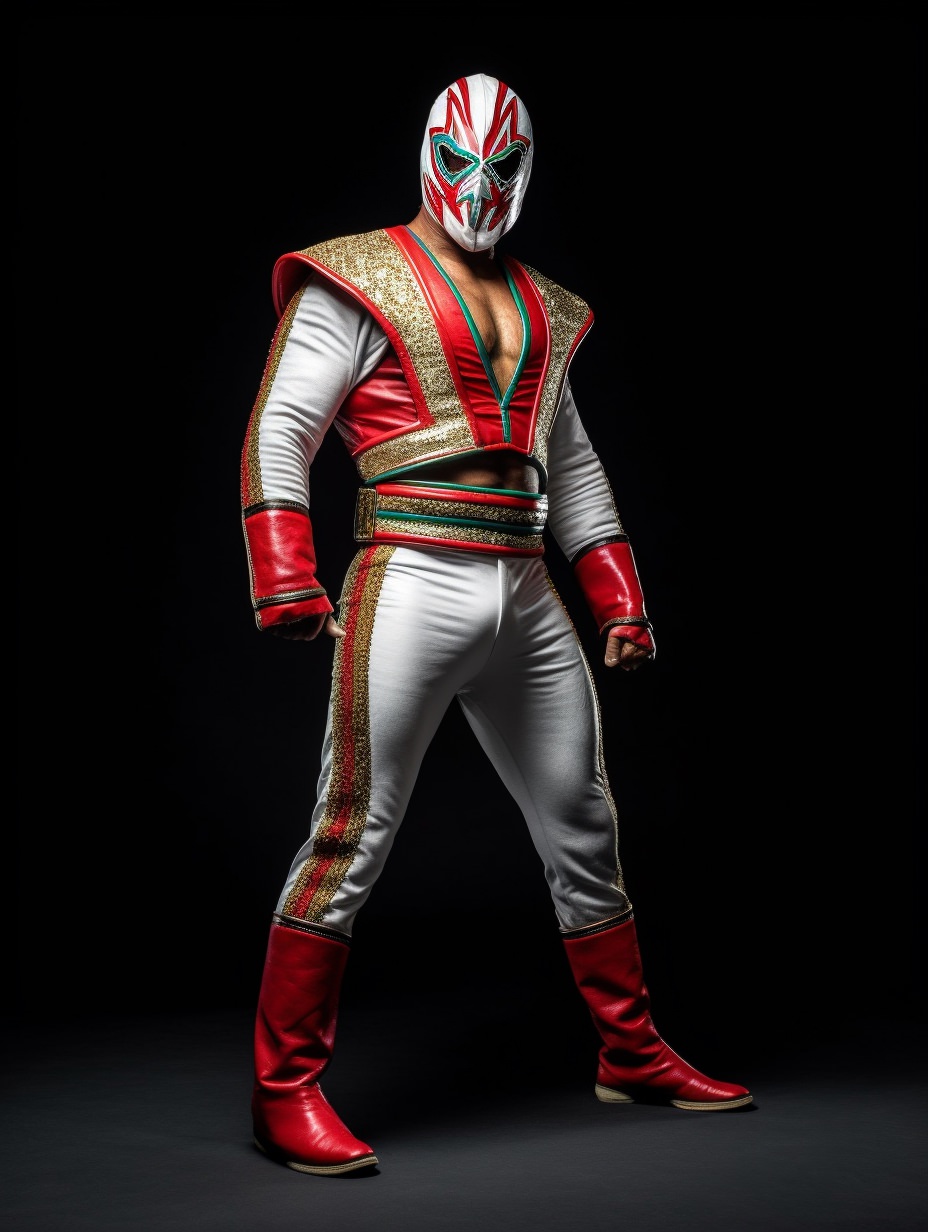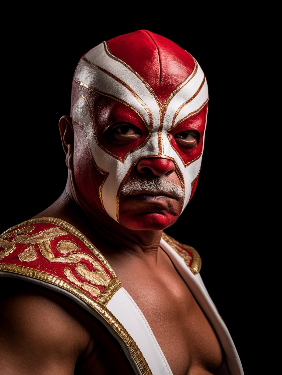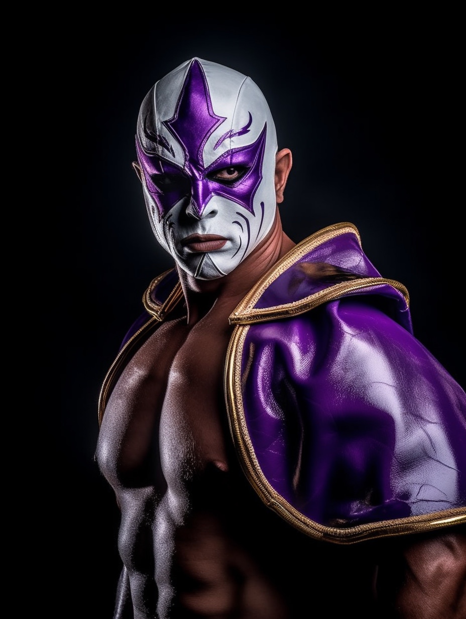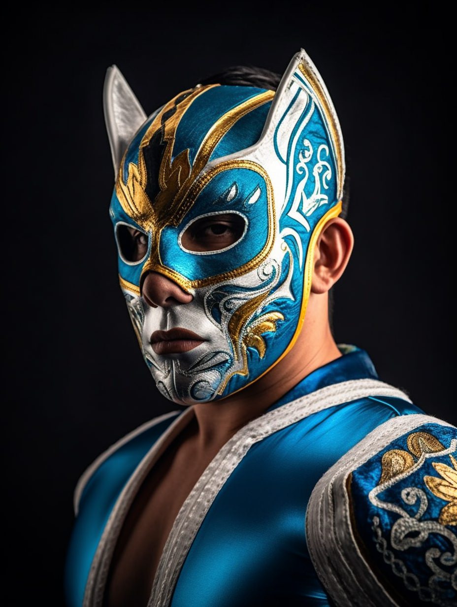studio portrait shot of {chubby,muscular,lean} luchador with white and {blue,red,purple} leather mask, luchadores, Mexico, masked wrestlers, lucha libre, athleticism, theatricality, tradition, iconic masks, personas, storylines, high-flying acrobatics, cultural heritage, colorful spectacle, passionate spirit --v 5 --ar 3:4 --c 8 --s 750