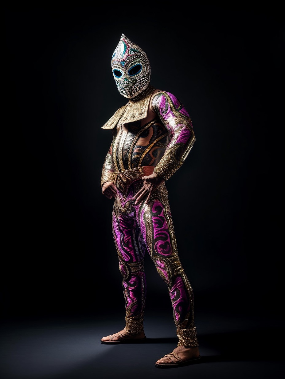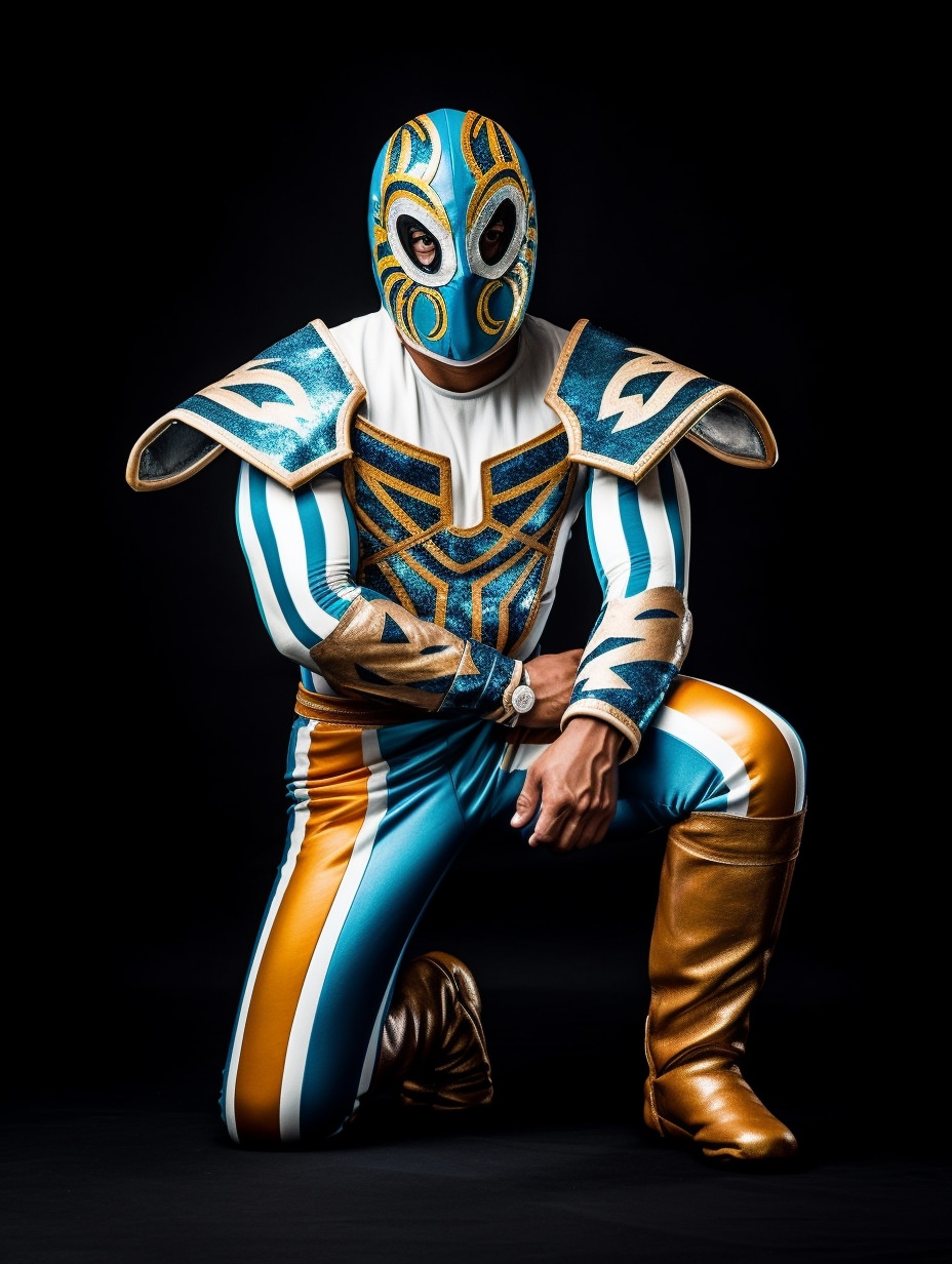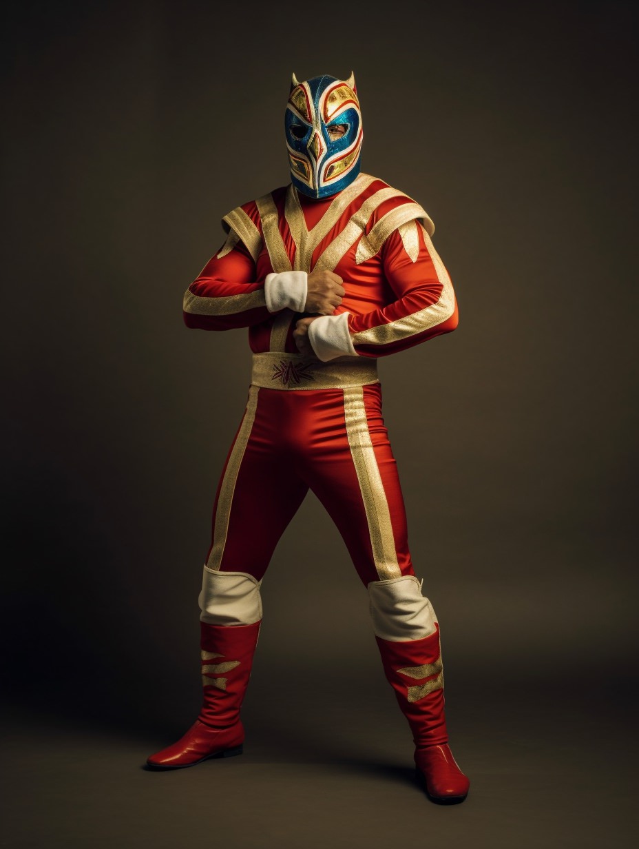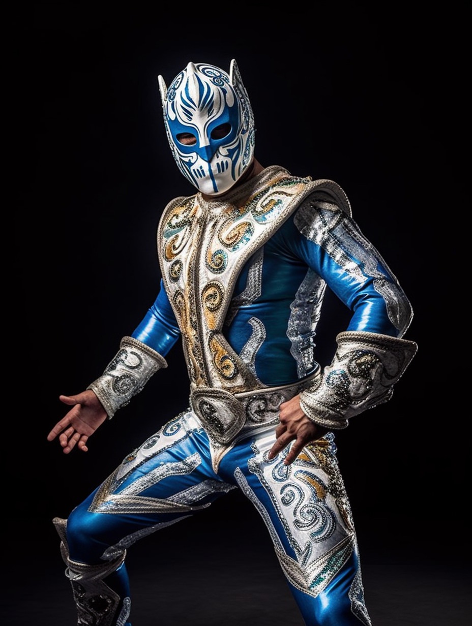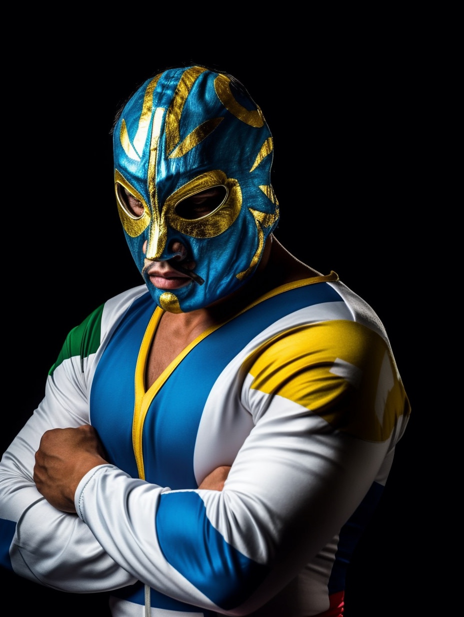 studio portrait shot of {chubby,muscular,lean} luchador with white and {blue,red,purple} leather mask, luchadores, Mexico, masked wrestlers, lucha libre, athleticism, theatricality, tradition, iconic masks, personas, storylines, high-flying acrobatics, cultural heritage, colorful spectacle, passionate spirit --v 5 --ar 3:4 --c 8 --s 750
