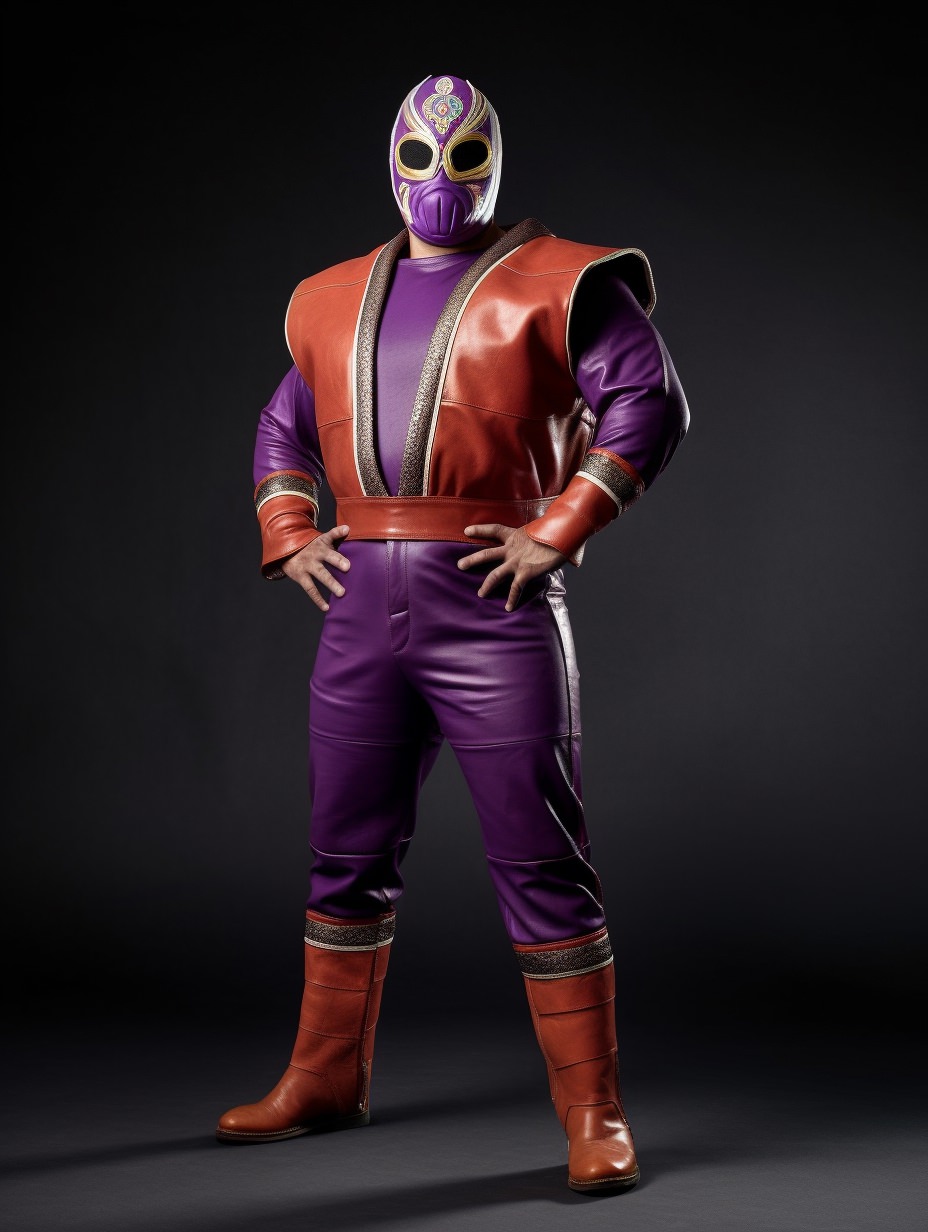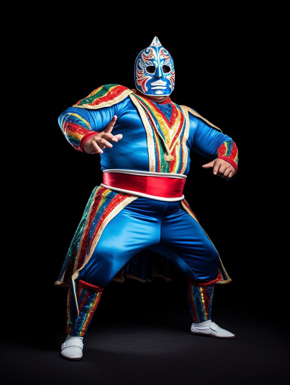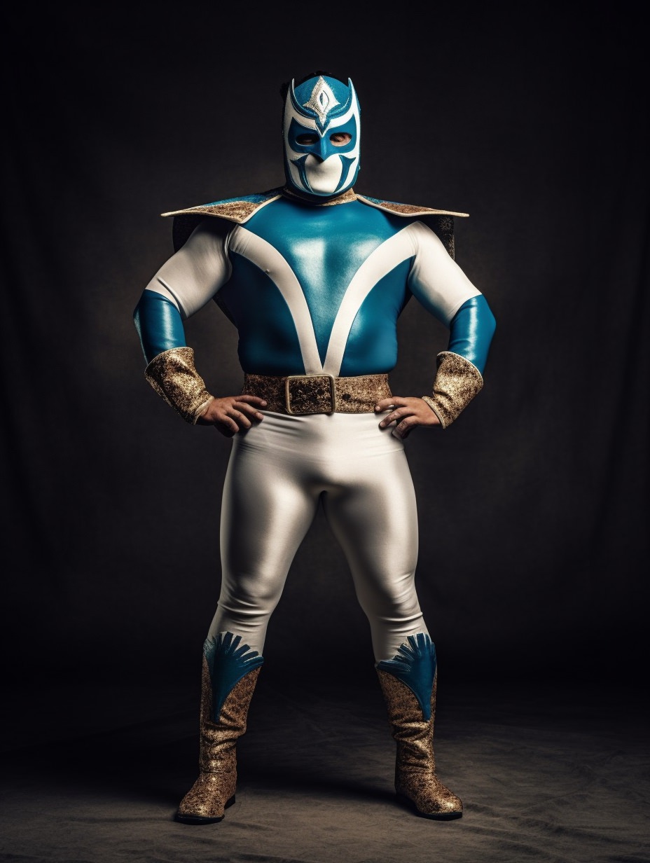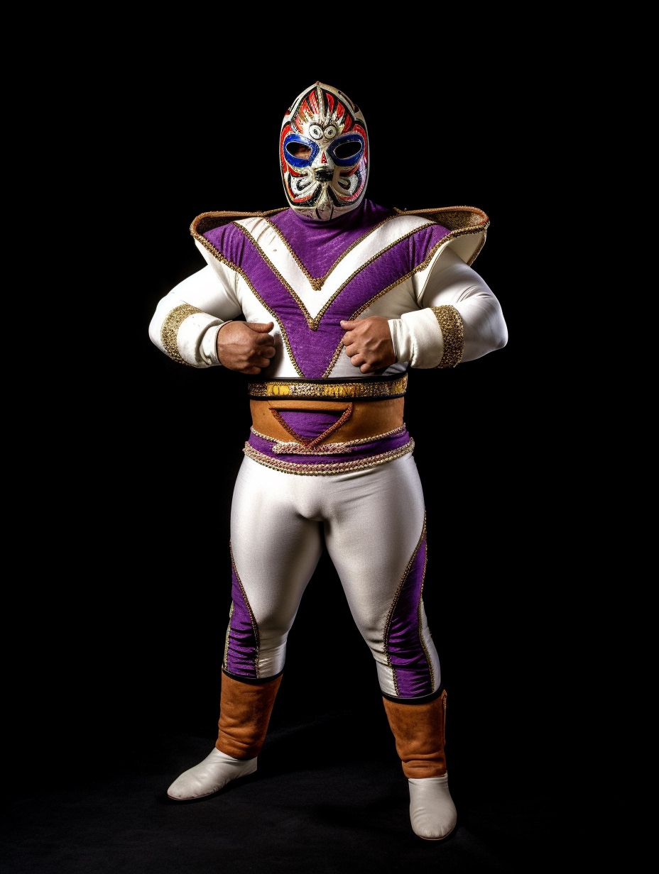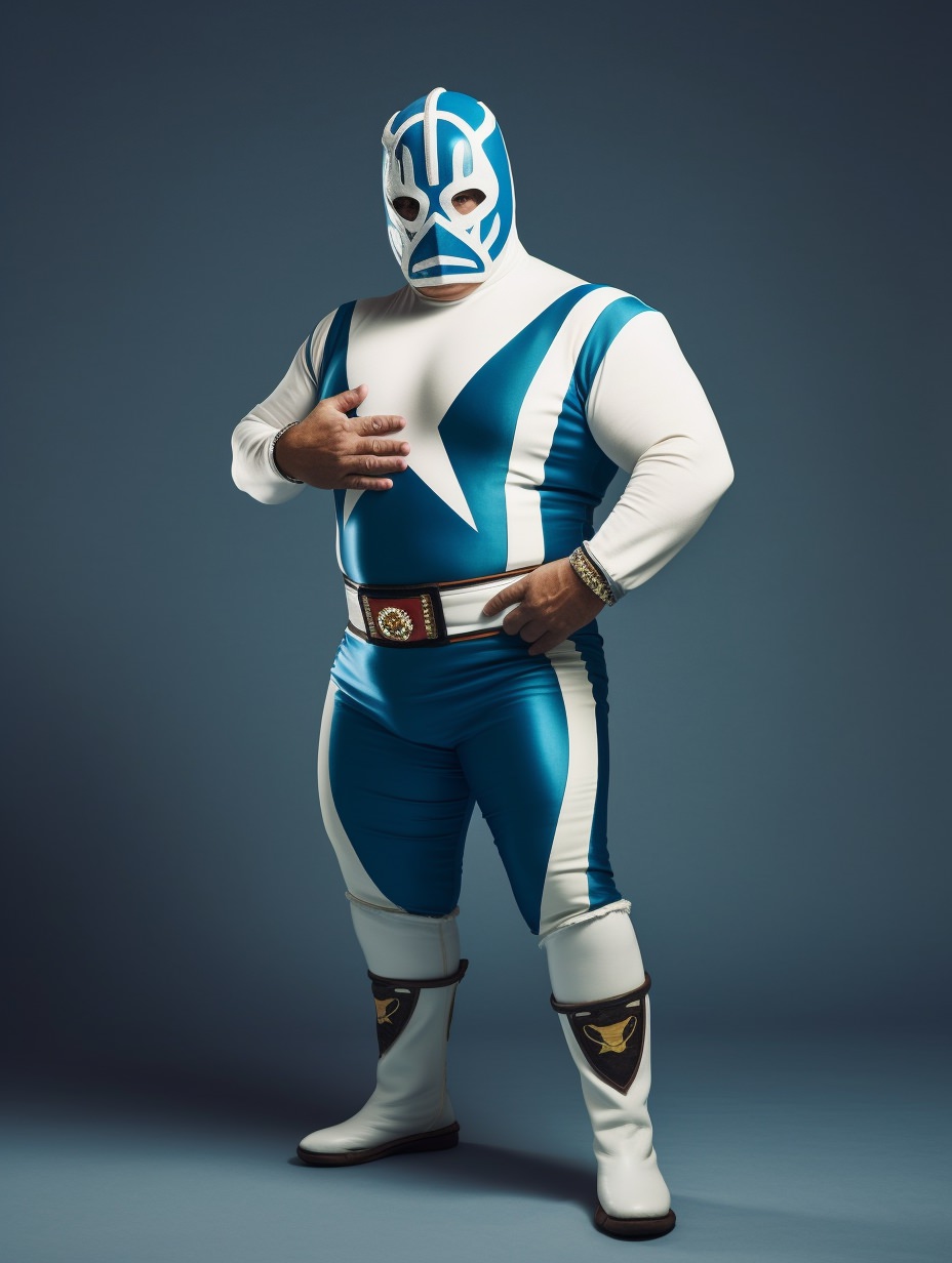 full-body studio shot of {chubby,muscular,lean} luchador with white and {blue,red,purple} leather mask and spandex wrestling suite, luchadores, Mexico, masked wrestlers, lucha libre, athleticism, theatricality, tradition, iconic masks, personas, storylines, high-flying acrobatics, cultural heritage, colorful spectacle, passionate spirit --v 5 --ar 3:4 --c 8 --s 750