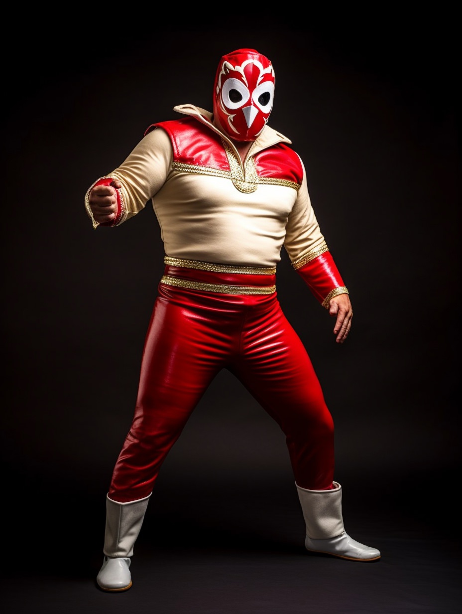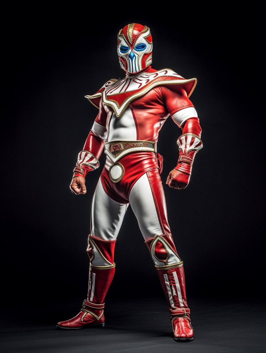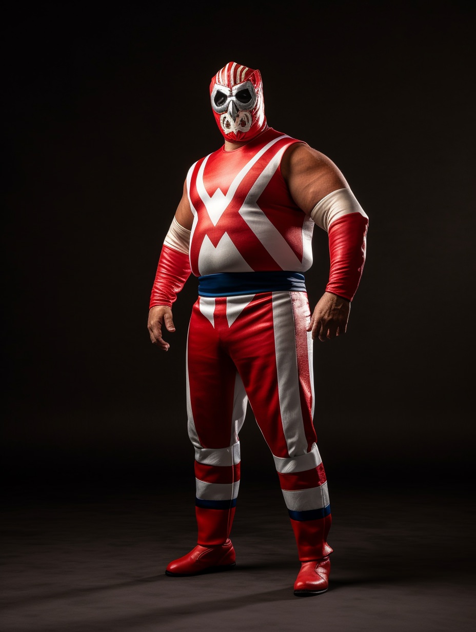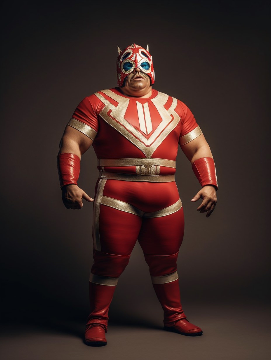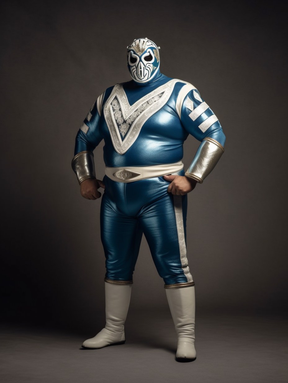 full-body studio shot of {chubby,muscular,lean} luchador with white and {blue,red,purple} leather mask and spandex wrestling suite, luchadores, Mexico, masked wrestlers, lucha libre, athleticism, theatricality, tradition, iconic masks, personas, storylines, high-flying acrobatics, cultural heritage, colorful spectacle, passionate spirit --v 5 --ar 3:4 --c 8 --s 750