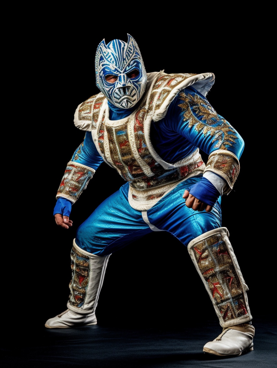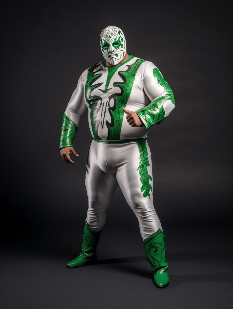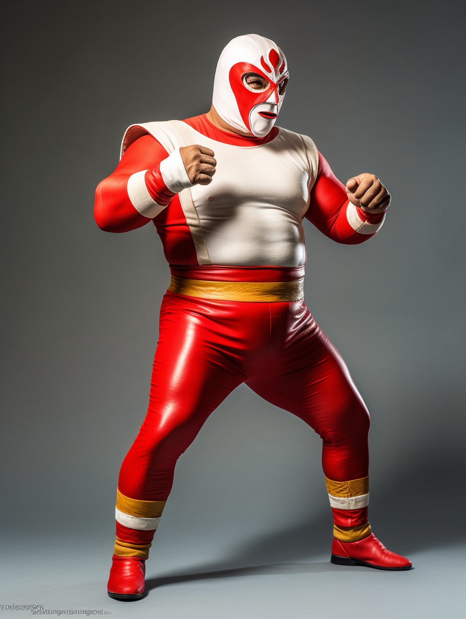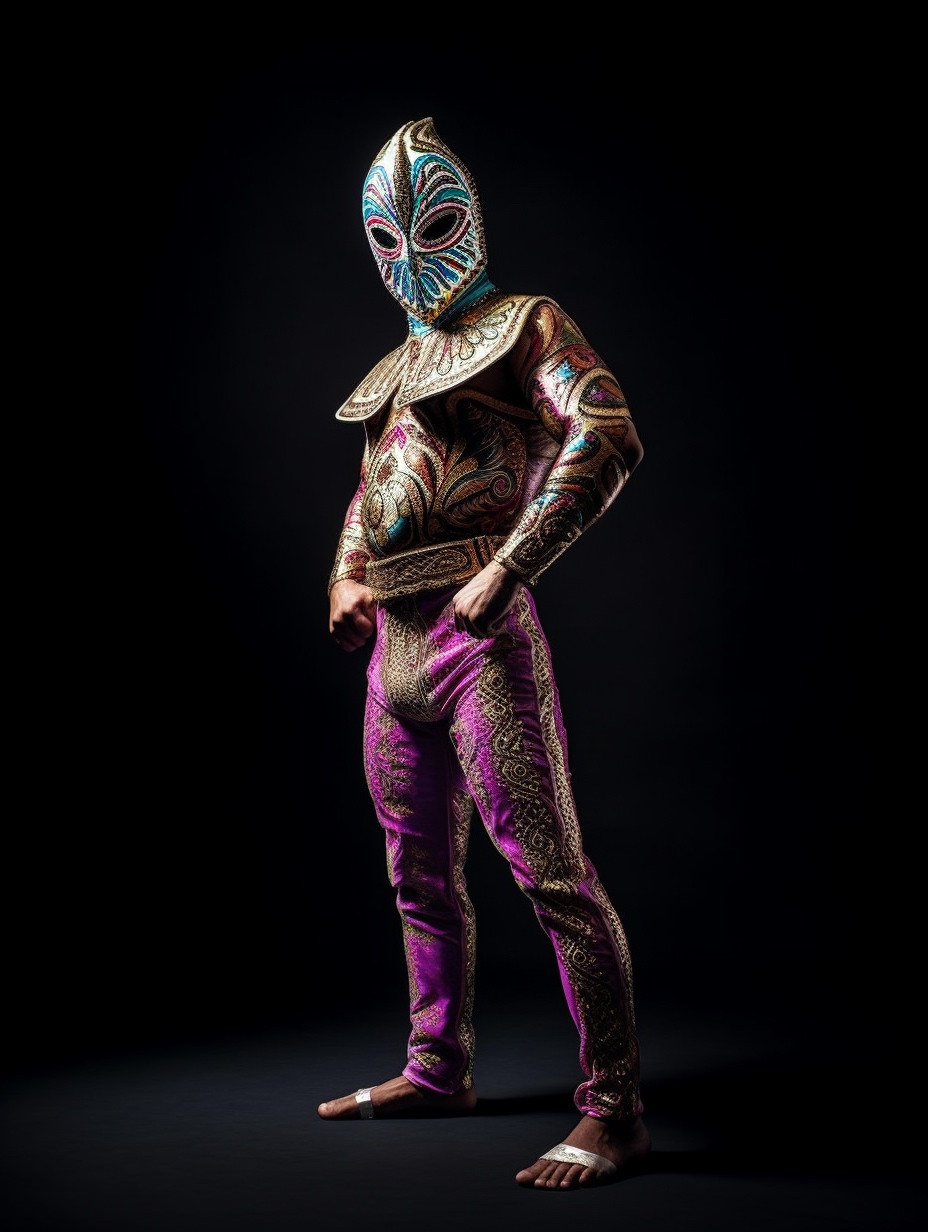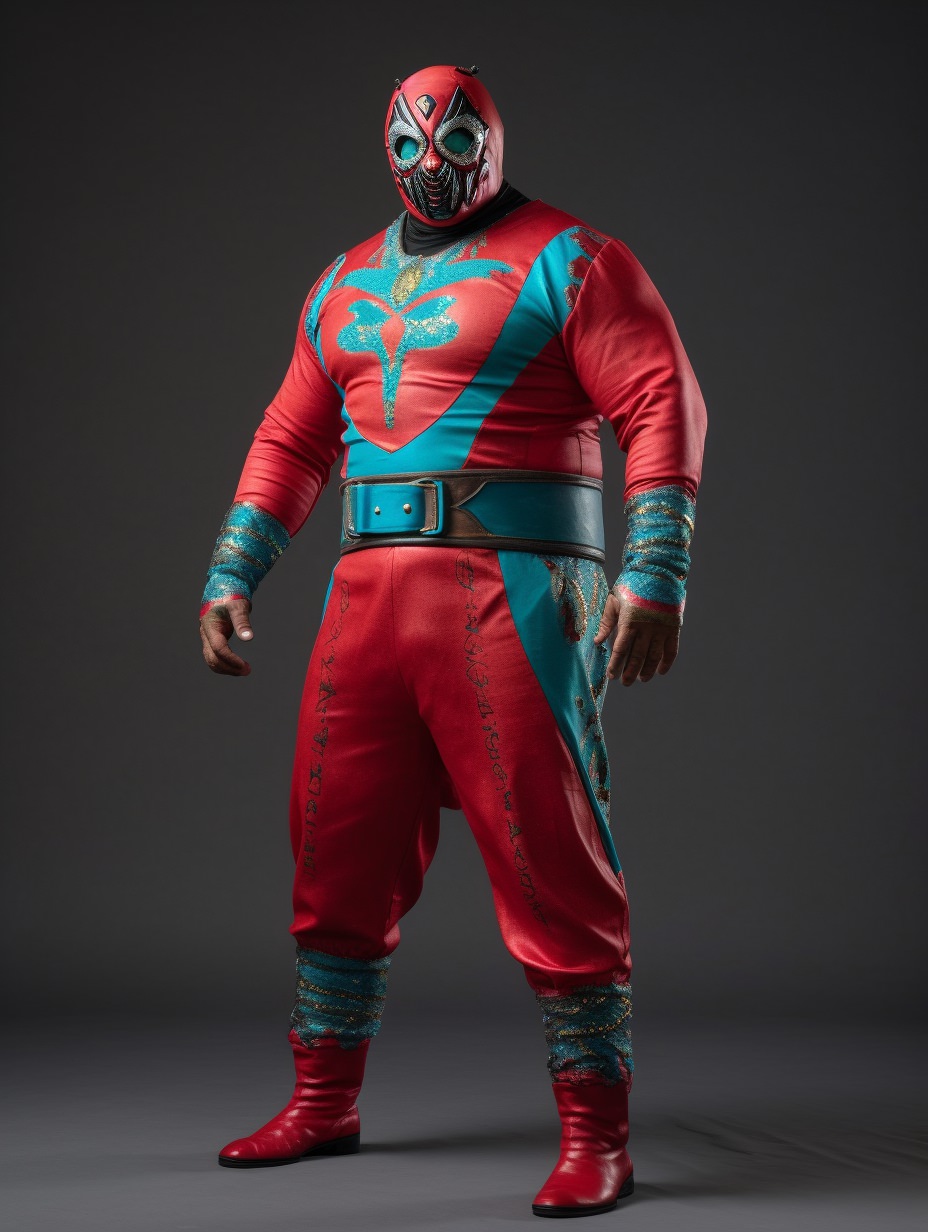 full-body studio shot of {chubby,muscular,lean} luchador with white and {blue,red,purple} leather mask and spandex wrestling suite, luchadores, Mexico, masked wrestlers, lucha libre, athleticism, theatricality, tradition, iconic masks, personas, storylines, high-flying acrobatics, cultural heritage, colorful spectacle, passionate spirit --v 5 --ar 3:4 --c 8 --s 750