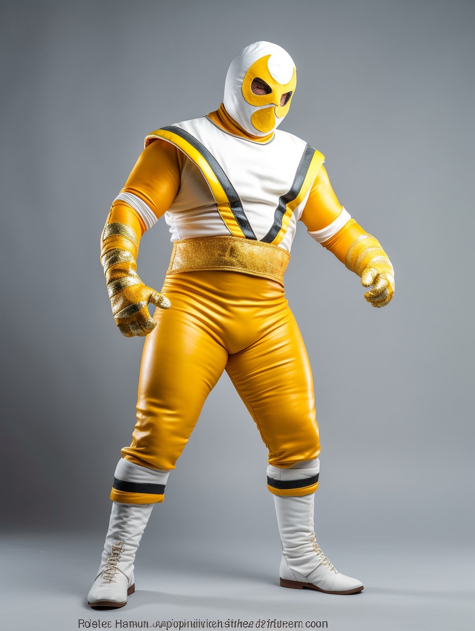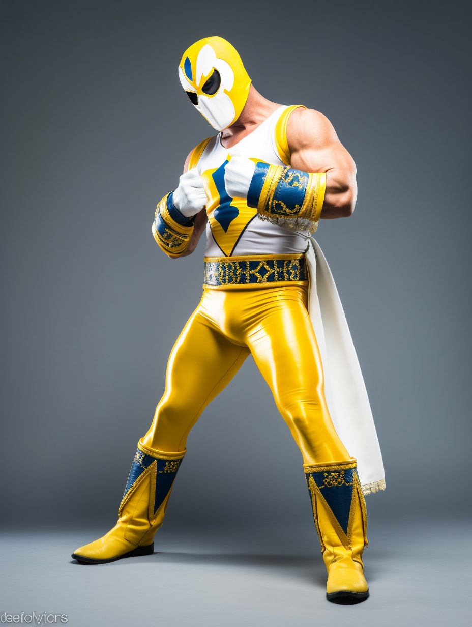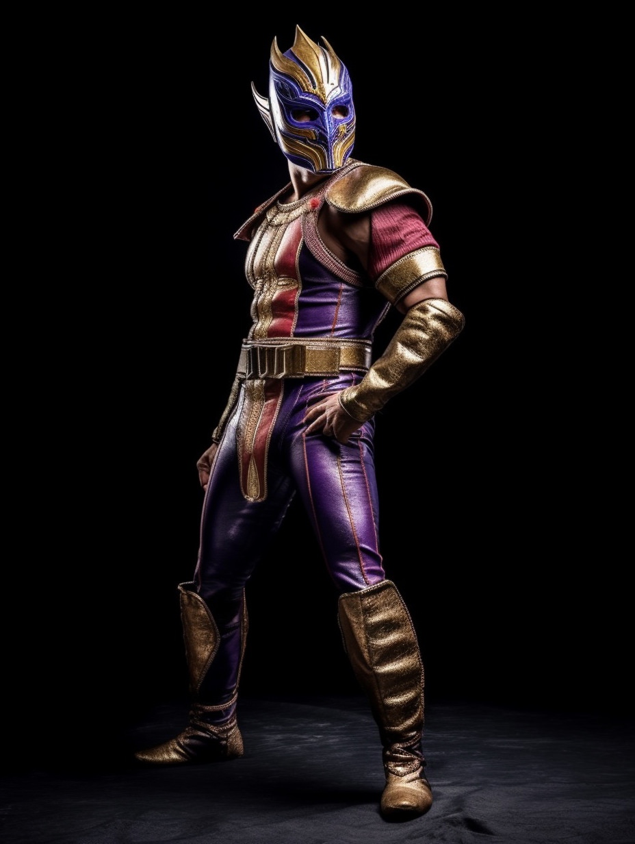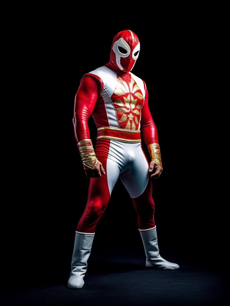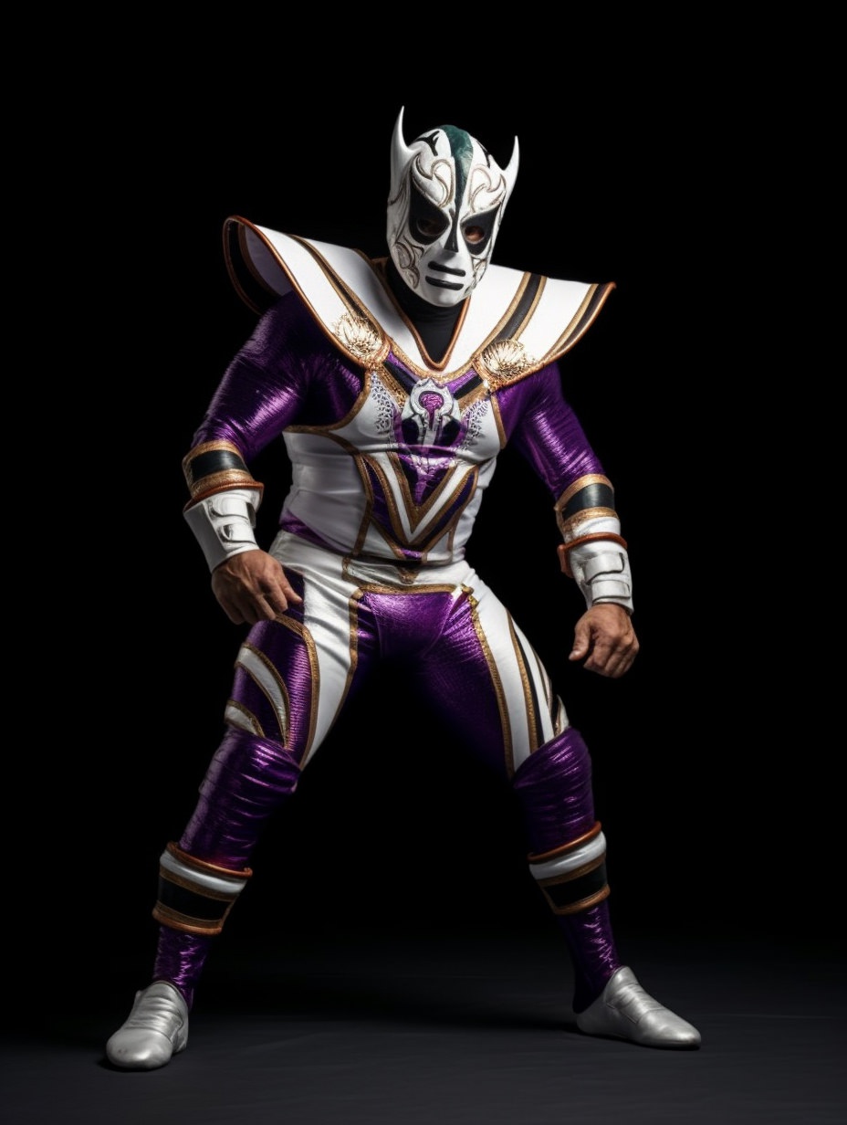 full-body studio shot of {chubby,muscular,lean} luchador with white and {blue,red,purple} leather mask and spandex wrestling suite, luchadores, Mexico, masked wrestlers, lucha libre, athleticism, theatricality, tradition, iconic masks, personas, storylines, high-flying acrobatics, cultural heritage, colorful spectacle, passionate spirit --v 5 --ar 3:4 --c 8 --s 750