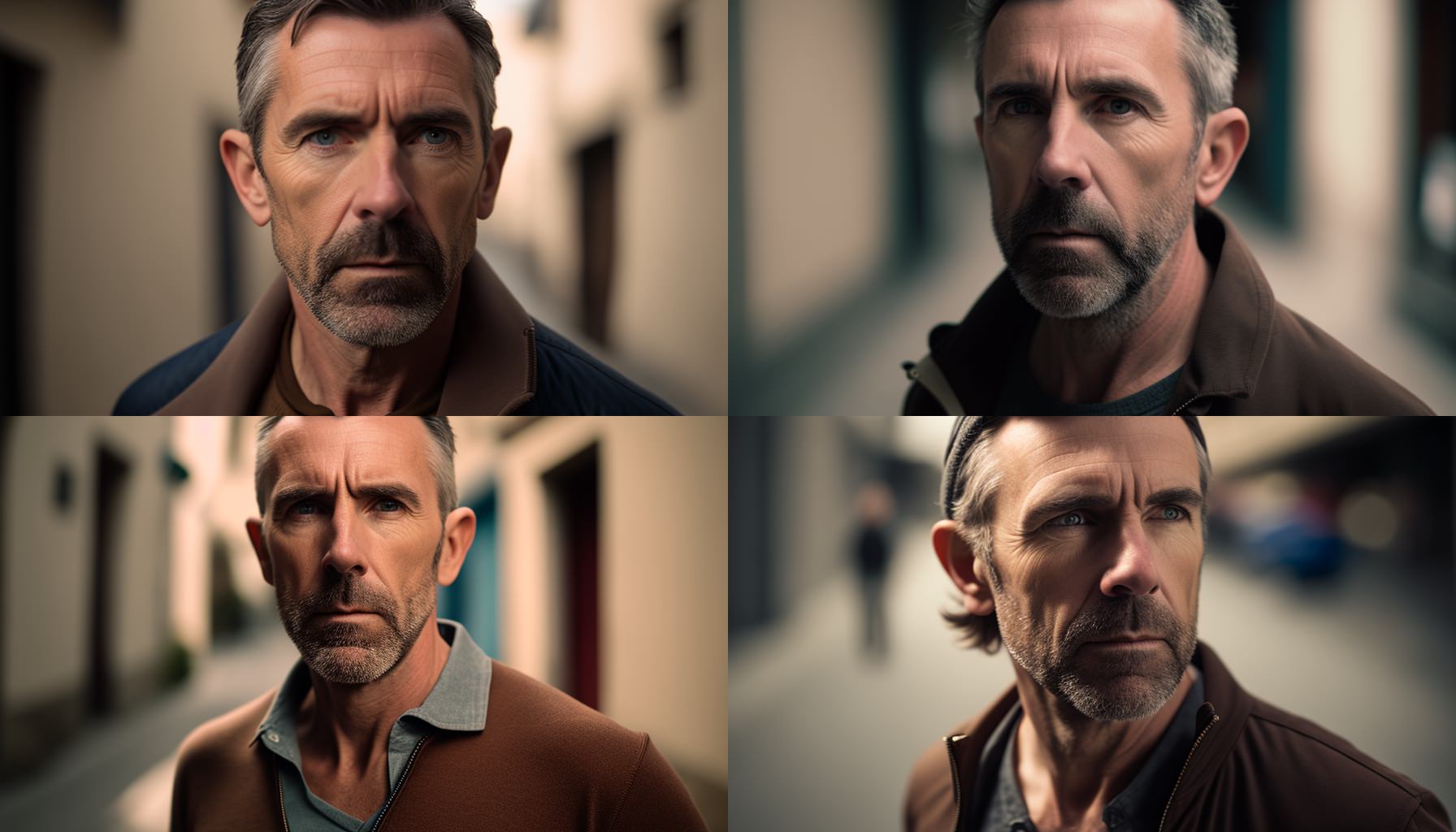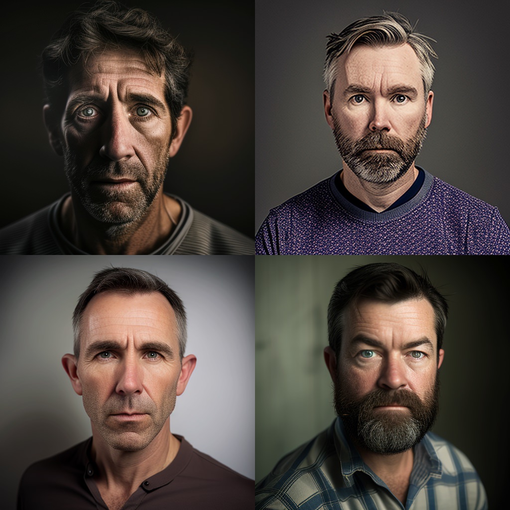 Here –c 10 gives a lot of variation in the four generated previews. –c stands for “chaos”, while –v is the version of Midjourney. And yes Midjourney gives me 4 very different males, all white caucasian. Personally, I think they look 10 years older? When I tried middle aged, I feel I got more of 60 year olds.
