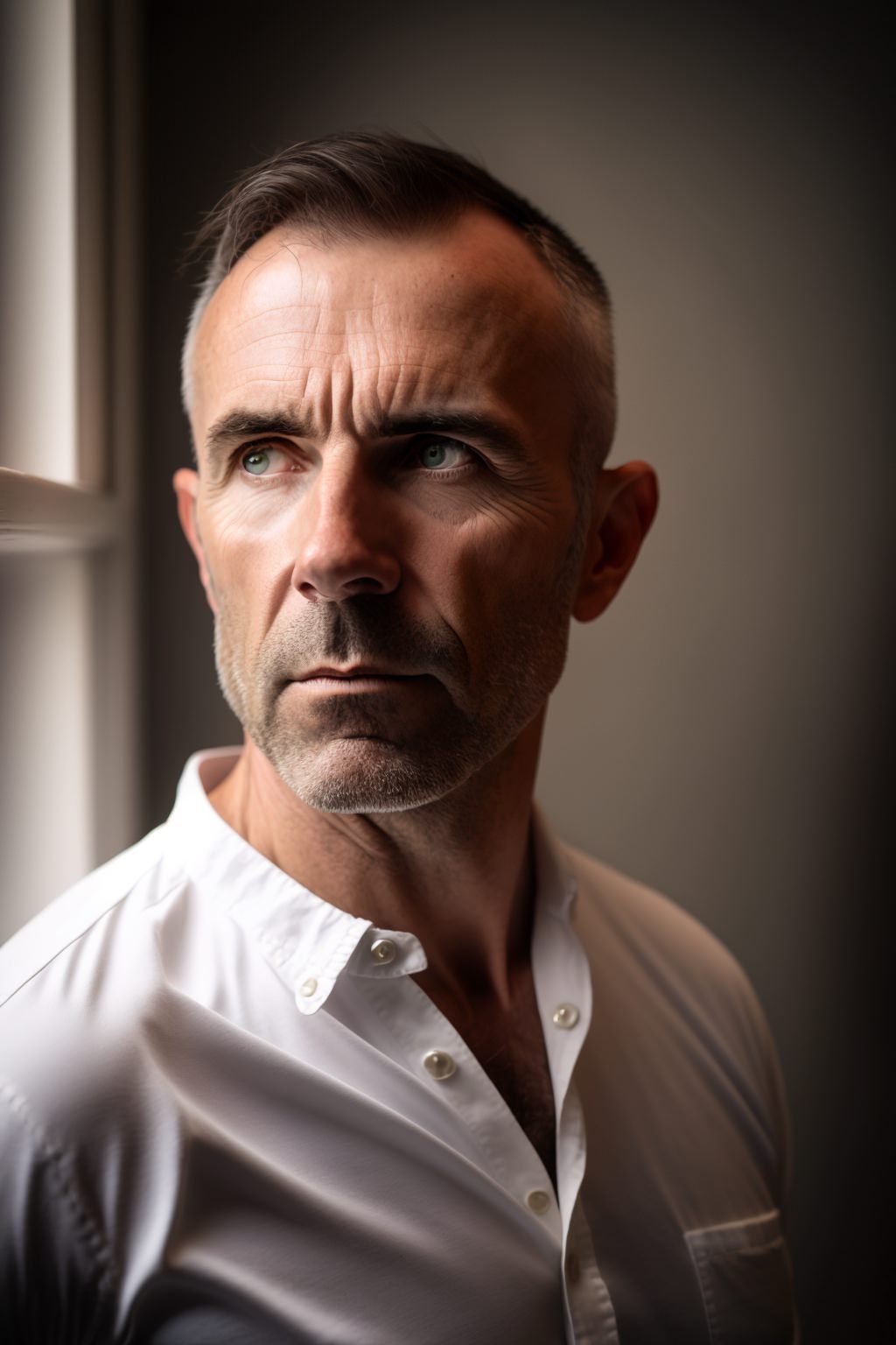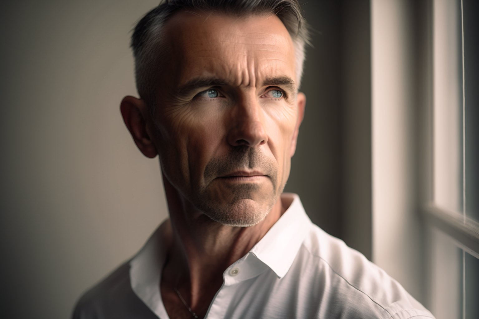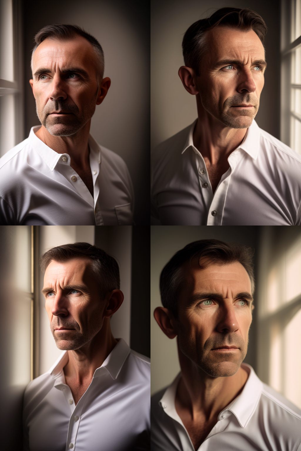 40 year old European man, wearing a white shirt, standing next to a window, professional color grading, soft shadows, no contrast, clean sharp focus, glamour photography, photo realistic --ar 3:2 --seed 405852131 --v 4