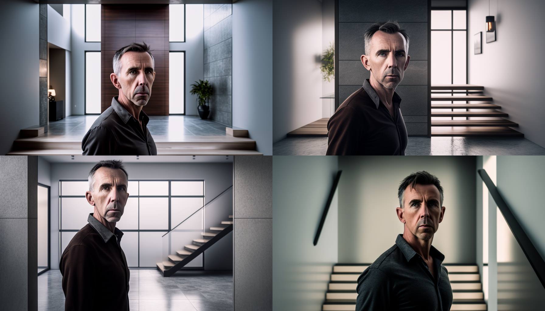 [with a give portrait link] Editorial style photo medium shot, Straight On, a man standing in Minimalist Foyer, Floating Staircase Concrete, Glass, Metal Minimalist Console Neutral Palette Design Within Reach Recessed Lighting Apartment Morning Clean Contemporary Modern 4k, --ar 16:9