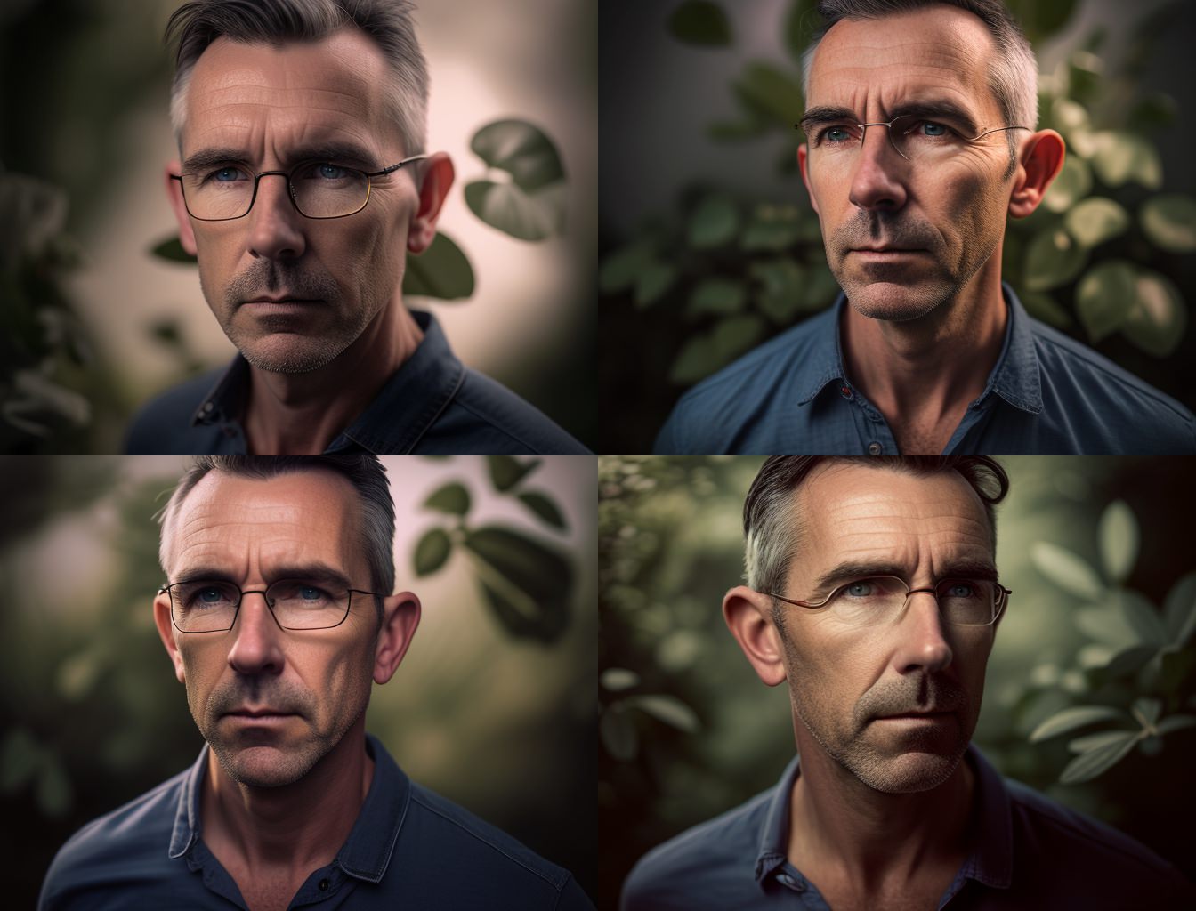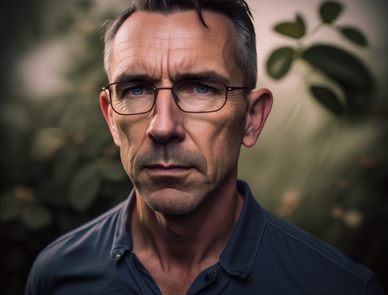 [with a give portrait link] 40 year old European man with glasses, wearing a navy blue buttoned shirt, in an overgrown garden, morning light, clean sharp focus, off - center, 24mm, wide shoulder shot, photo realistic --ar 4:3