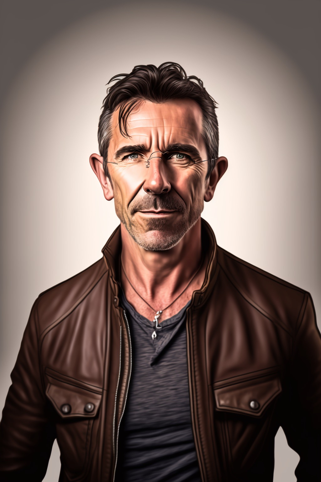 40 year old European man with sunglasses, full body smiling and wearing sunglasses and wearing brown leather jacket --ar 2:3