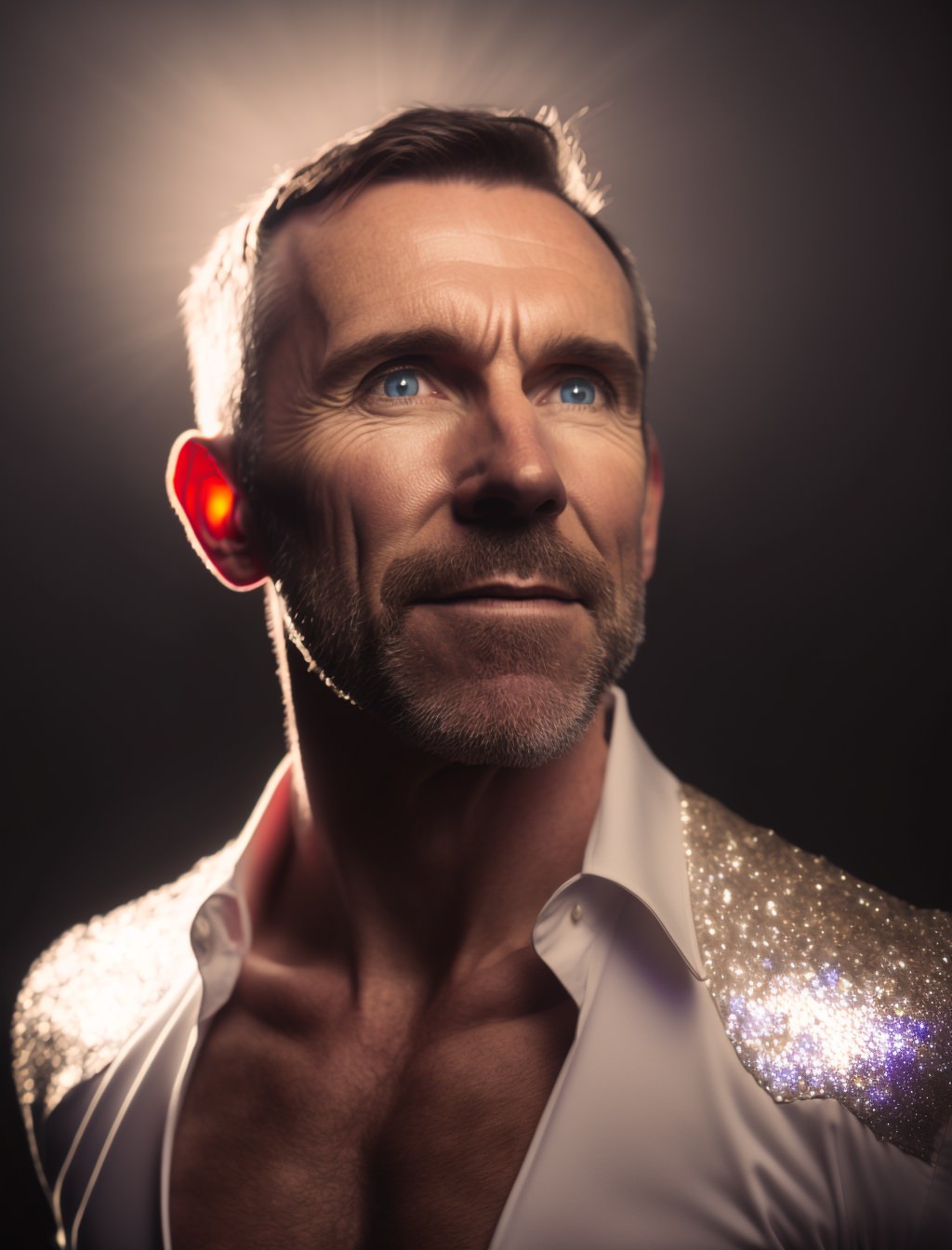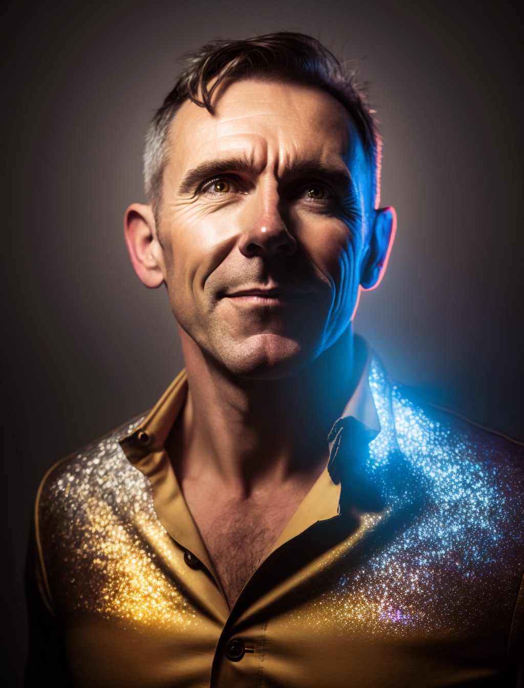 40 year old European man, full body smiling, glitter, opalescent, iridescent, pearlescent, cinematic color scheme, cinematic lighting, dramatic lighting, hyper realistic, hyper detailed, Leica MP Leica SUMMICRON - M 35mm f/ 2 ASPH Cinestill 800T --ar 3:4