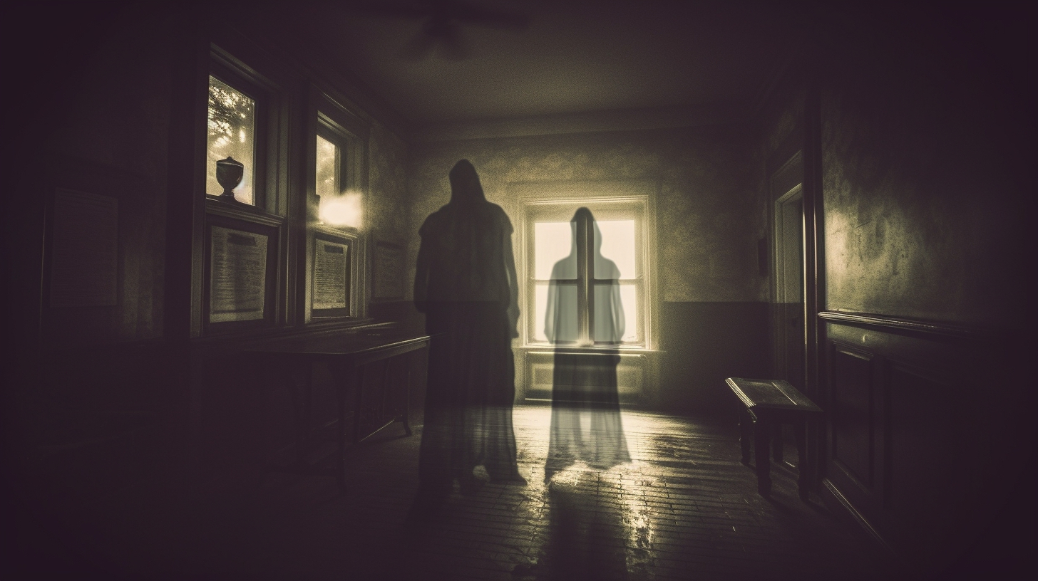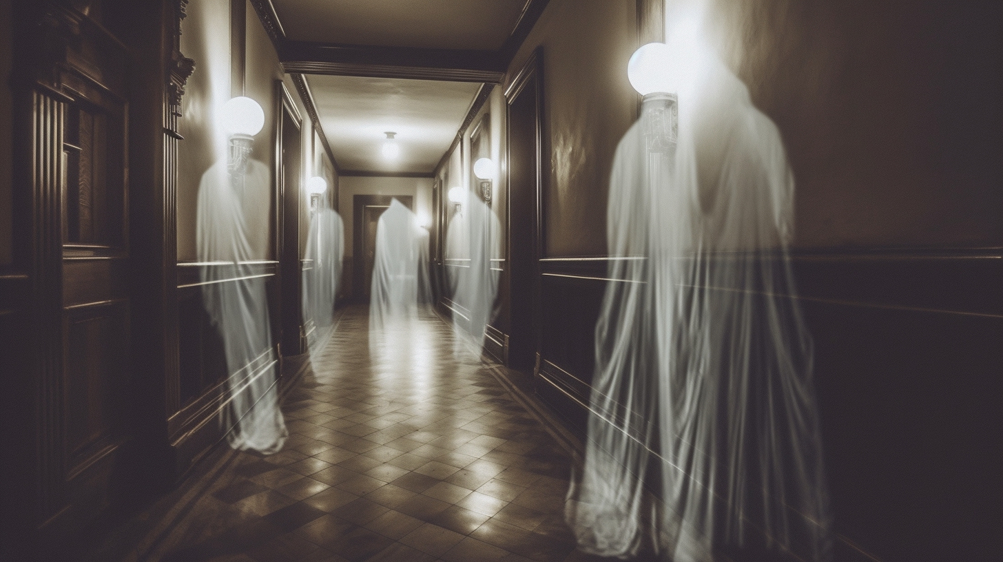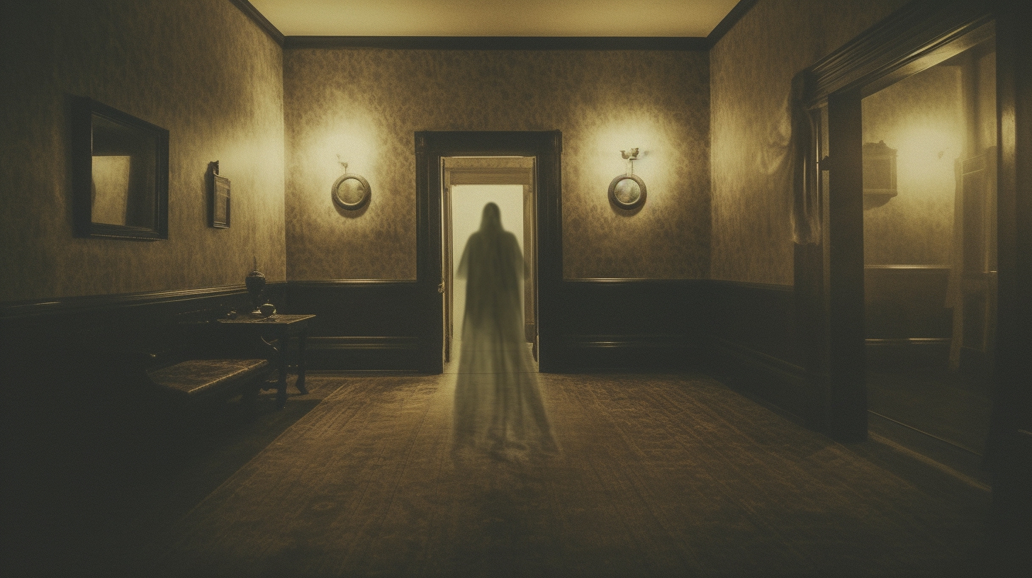A grainy, vintage photo of a spectral figure standing in the hallway of an old mansion at night. The photo should be taken with a cheap camera, giving it an authentic 80s feel. The ghost should be subtly visible among the trees, adding achilling element to the scene --ar 16:9
