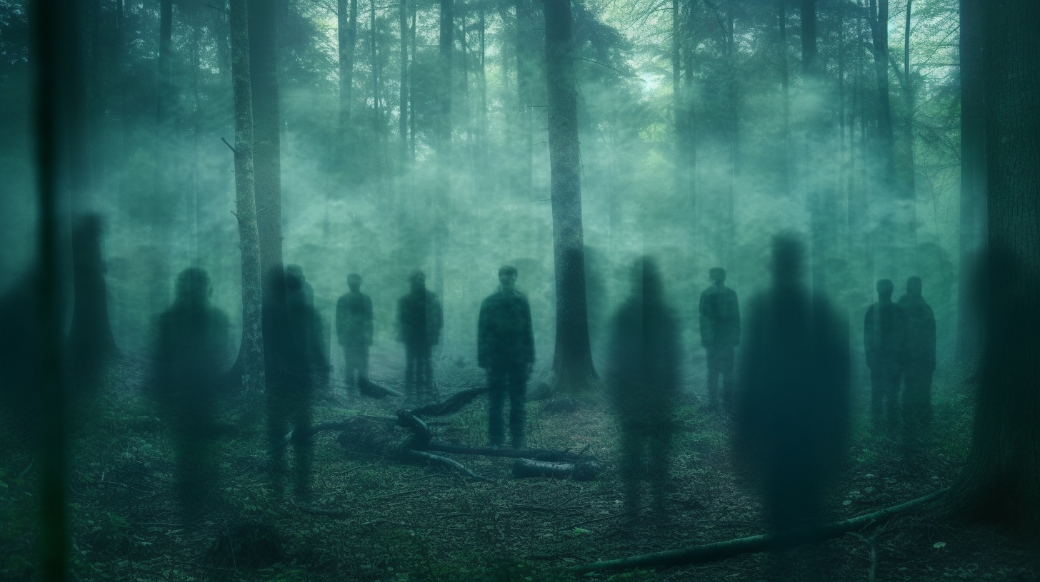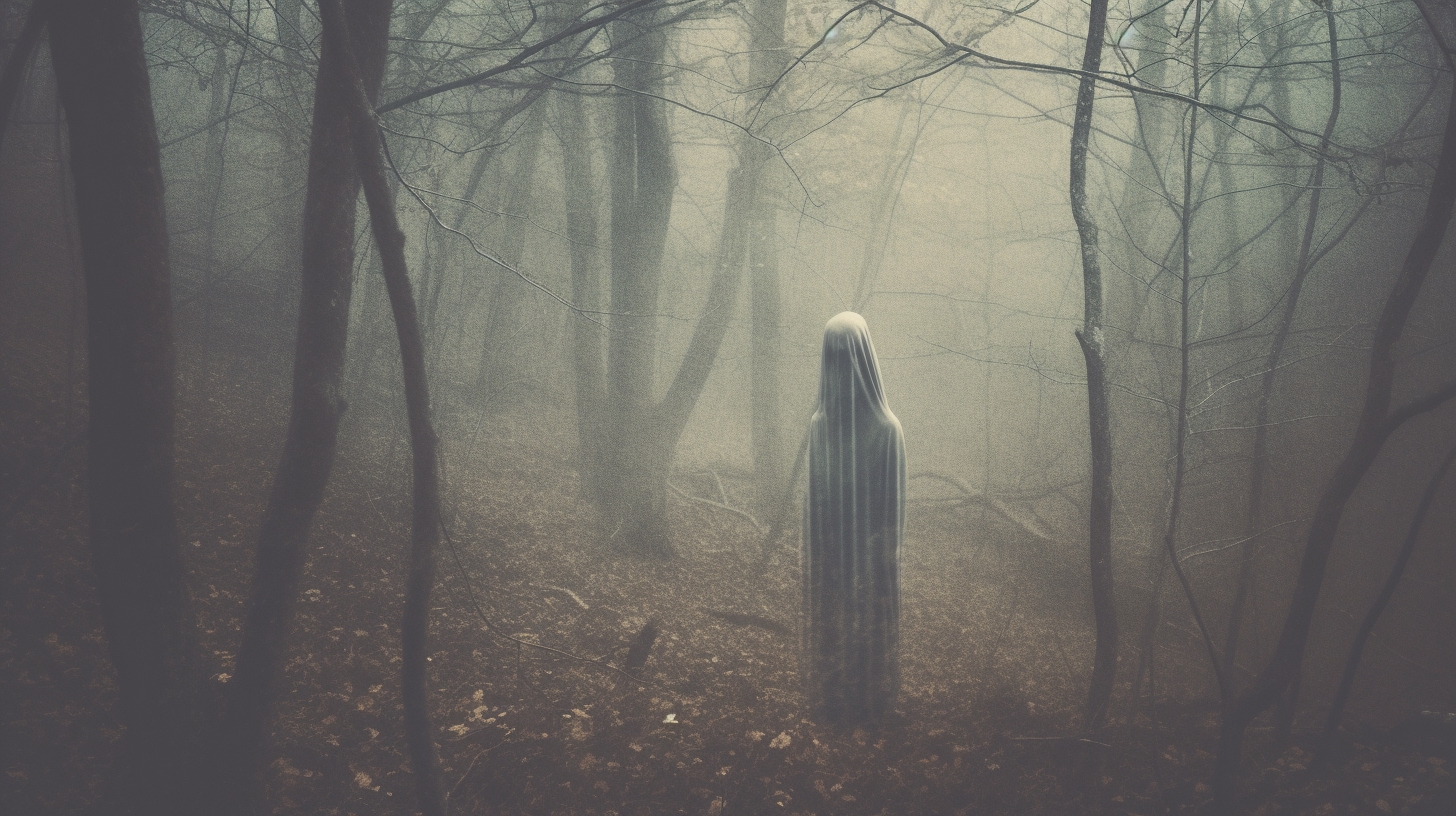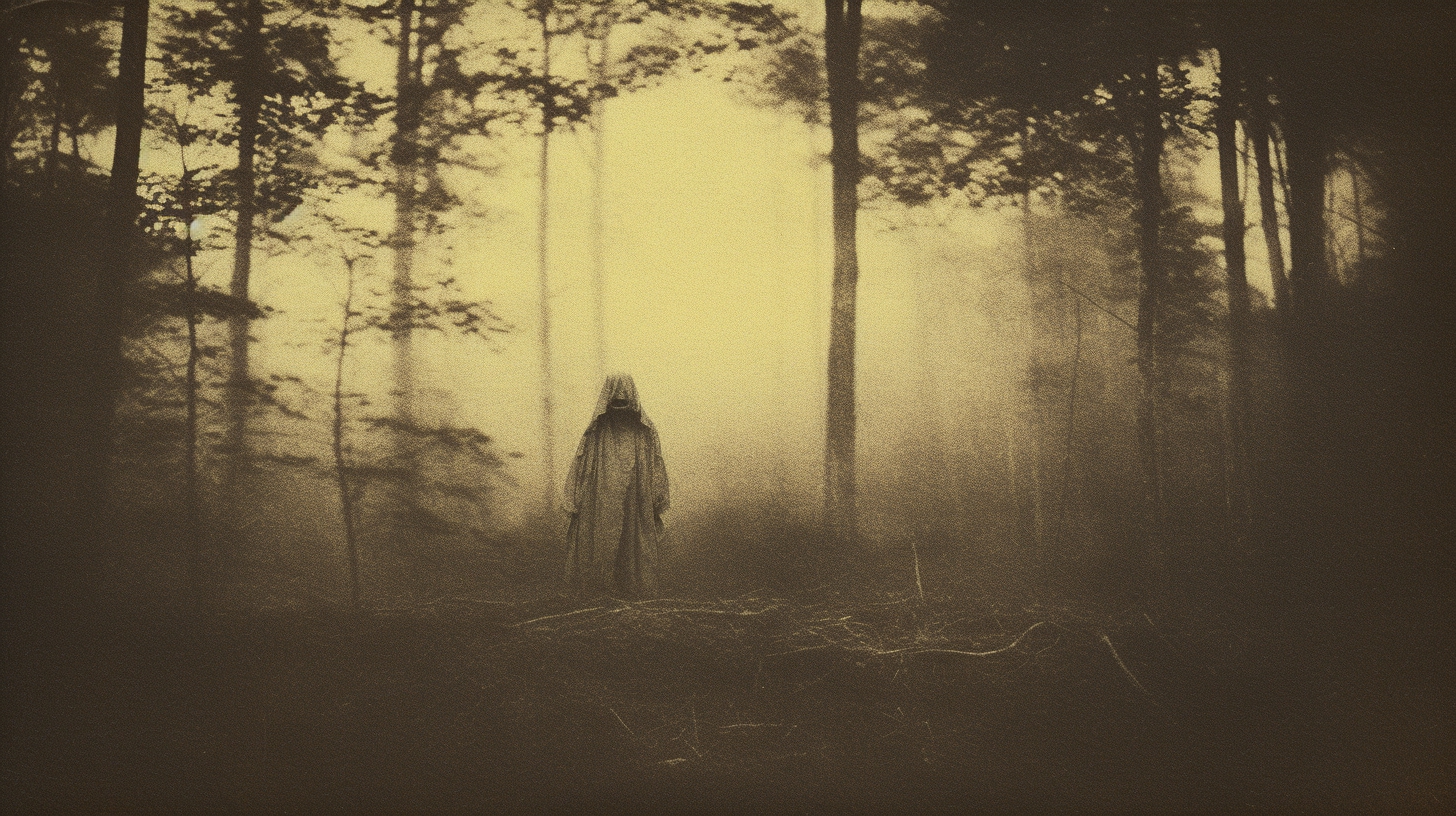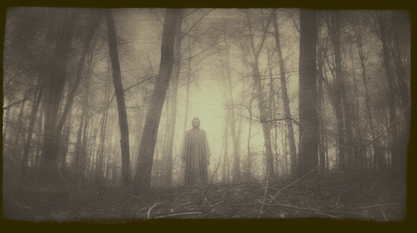 A grainy, vintage photo of a spectral figure standing in the woods at night. The photo should be taken with a Polaroid camera, giving it an authentic 80s feel. The ghost should be subtly visible among the trees, adding achilling element to the scene --ar 16:9