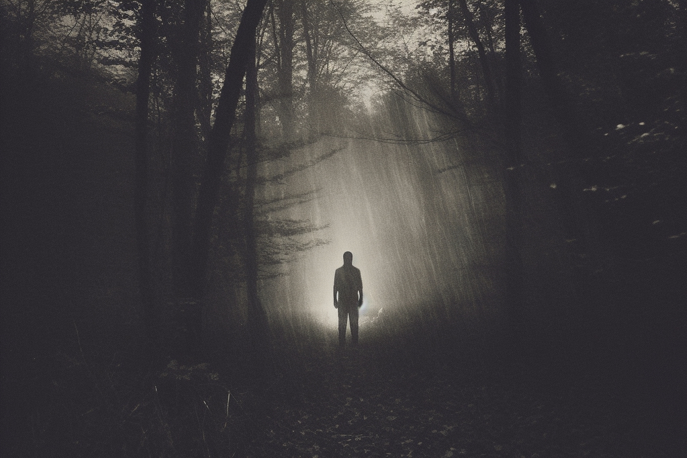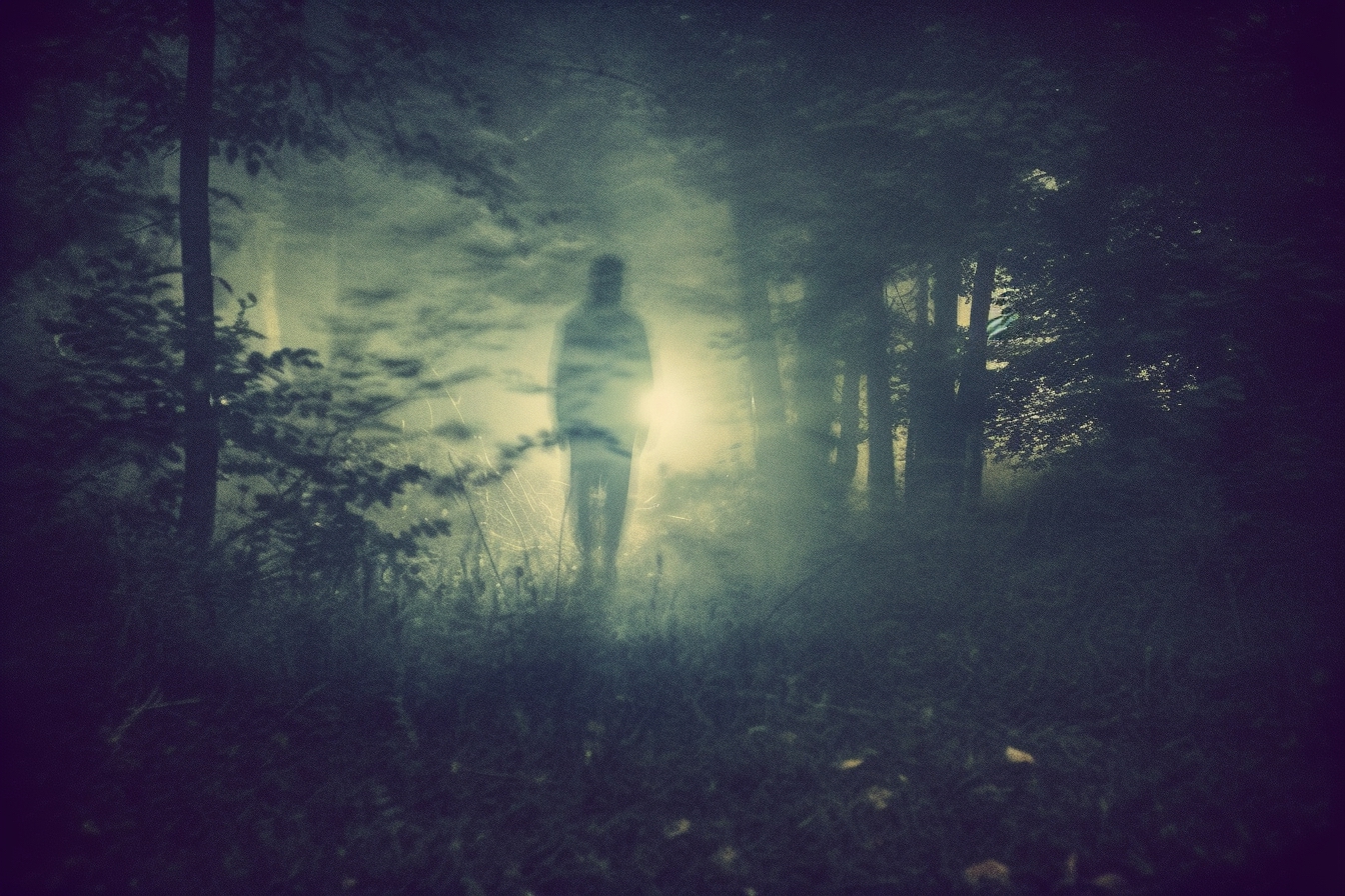 A grainy, vintage photo of a spectral figure standing in the woods at night. The photo should be taken with a cheap camera, giving it an authentic 80s feel. The ghost should be subtly visible among the trees, adding achilling element to the scene --ar 3:2