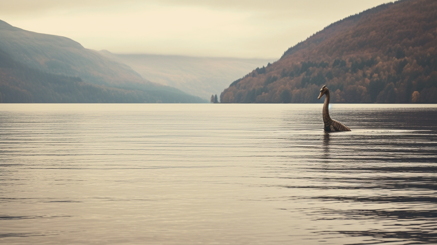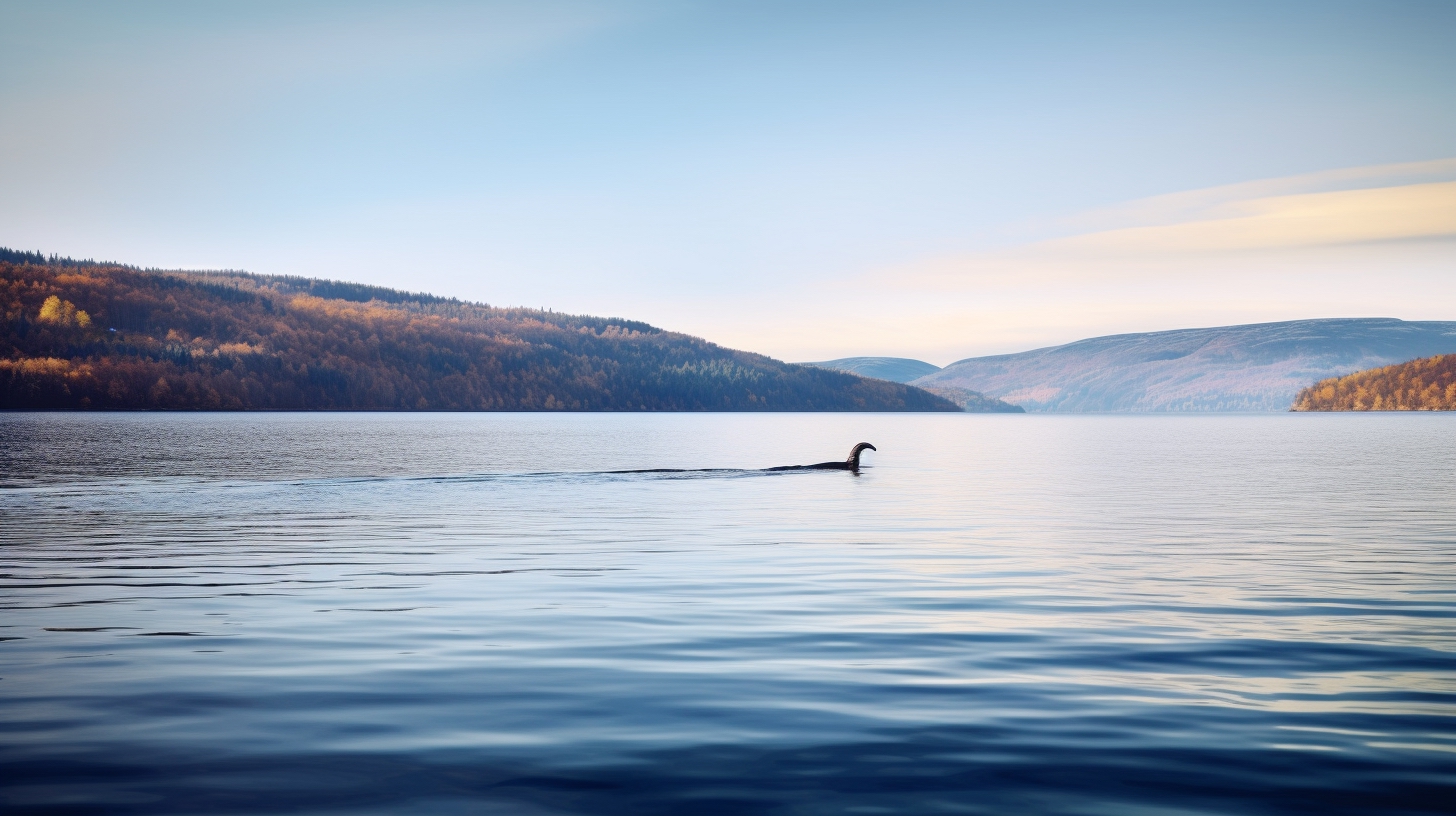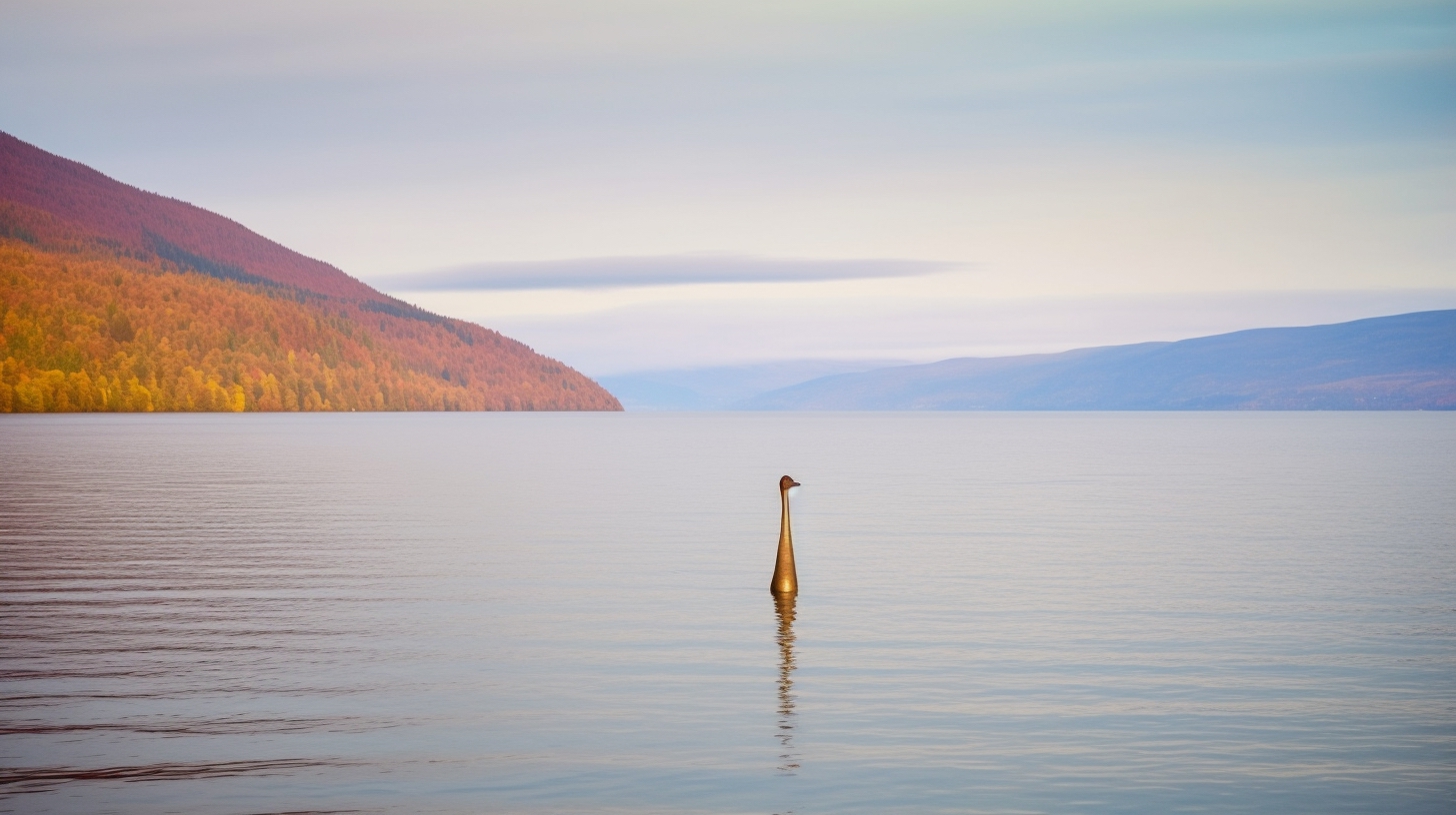Loch Ness monster surfacing it's long neck on lake Loch Ness, in the style of minimalist muted colors, documentary travel photography, soft, muted palette, serene and peaceful ambiance, wilderness --ar 16:9 --style raw