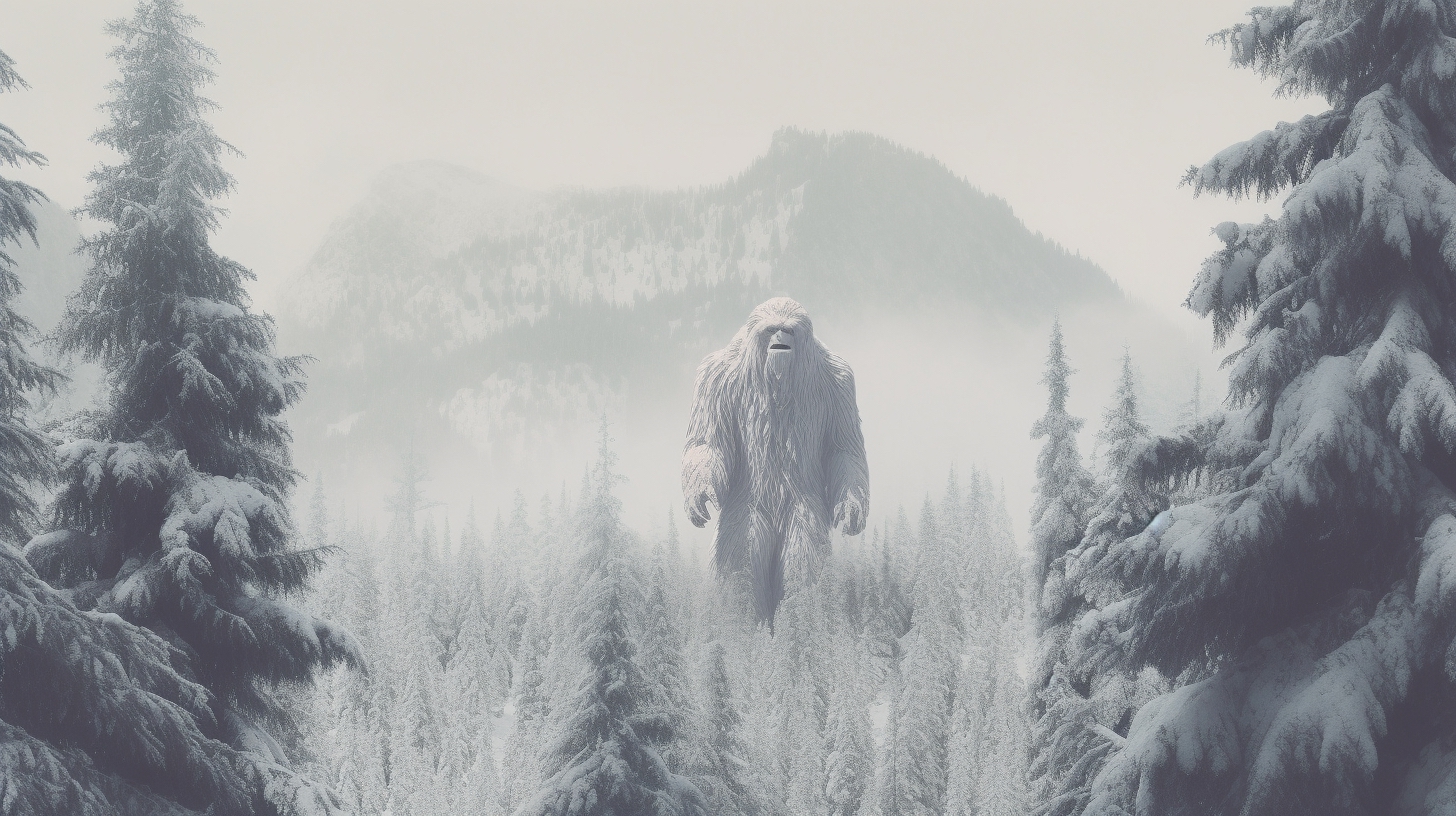 The Big Yeti appearing through the trees on a snowy mountaing top, in the style of minimalist muted colors, documentary travel photography, soft, muted palette, serene and peaceful ambiance, wilderness --ar 16:9 --style raw