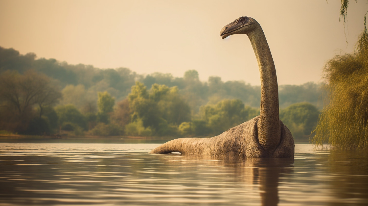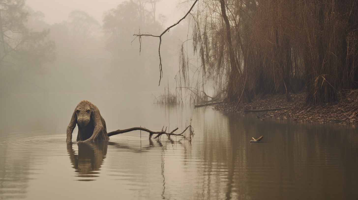 editorial image of Mokele-mbembe , which according to Central African folklore, Mokele-mbembe is a large creature that lives in the Congo River basin. Some say it resembles a dinosaur, in the style of minimalist muted colors, documentary travel photography, soft, muted palette, serene and peaceful ambiance, wilderness --ar 16:9 --style raw