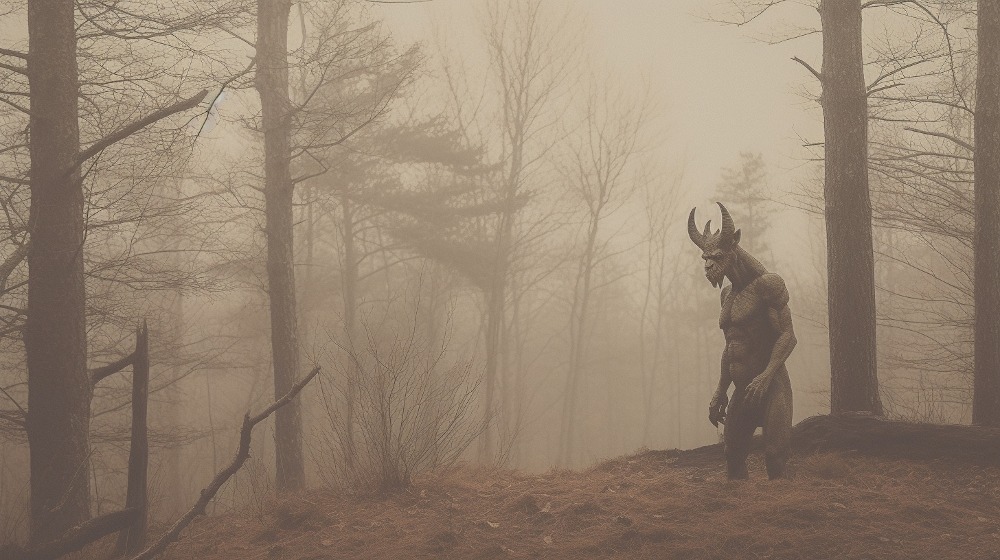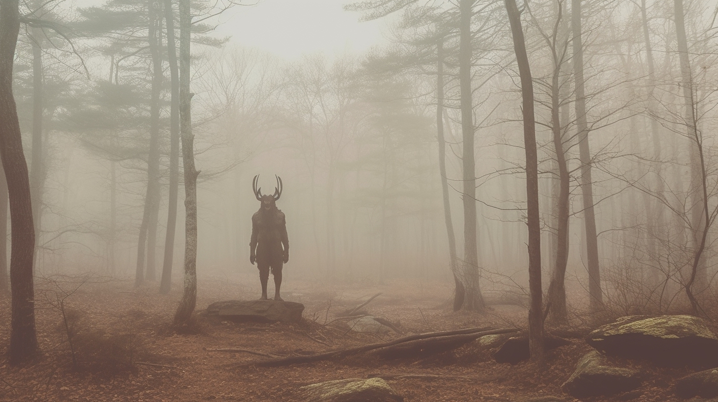 The enigmatic figure of the Jersey Devil, an elusive cryptid believed to inhabit the Pine Barrens of Southern New Jersey, in the style of minimalist muted colors, documentary travel photography, soft, muted palette, serene and peaceful ambiance, wilderness --ar 16:9 --style raw