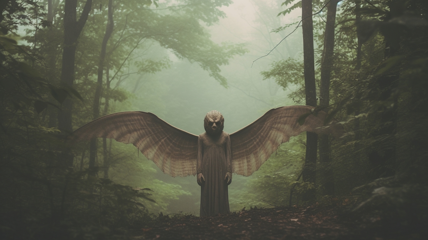 The enigmatic figure of the Mothman, a legendary entity said to inhabit the forests of West Virginia, in the style of minimalist muted colors, documentary travel photography, soft, muted palette, serene and peaceful ambiance, wilderness --ar 16:9 --style raw