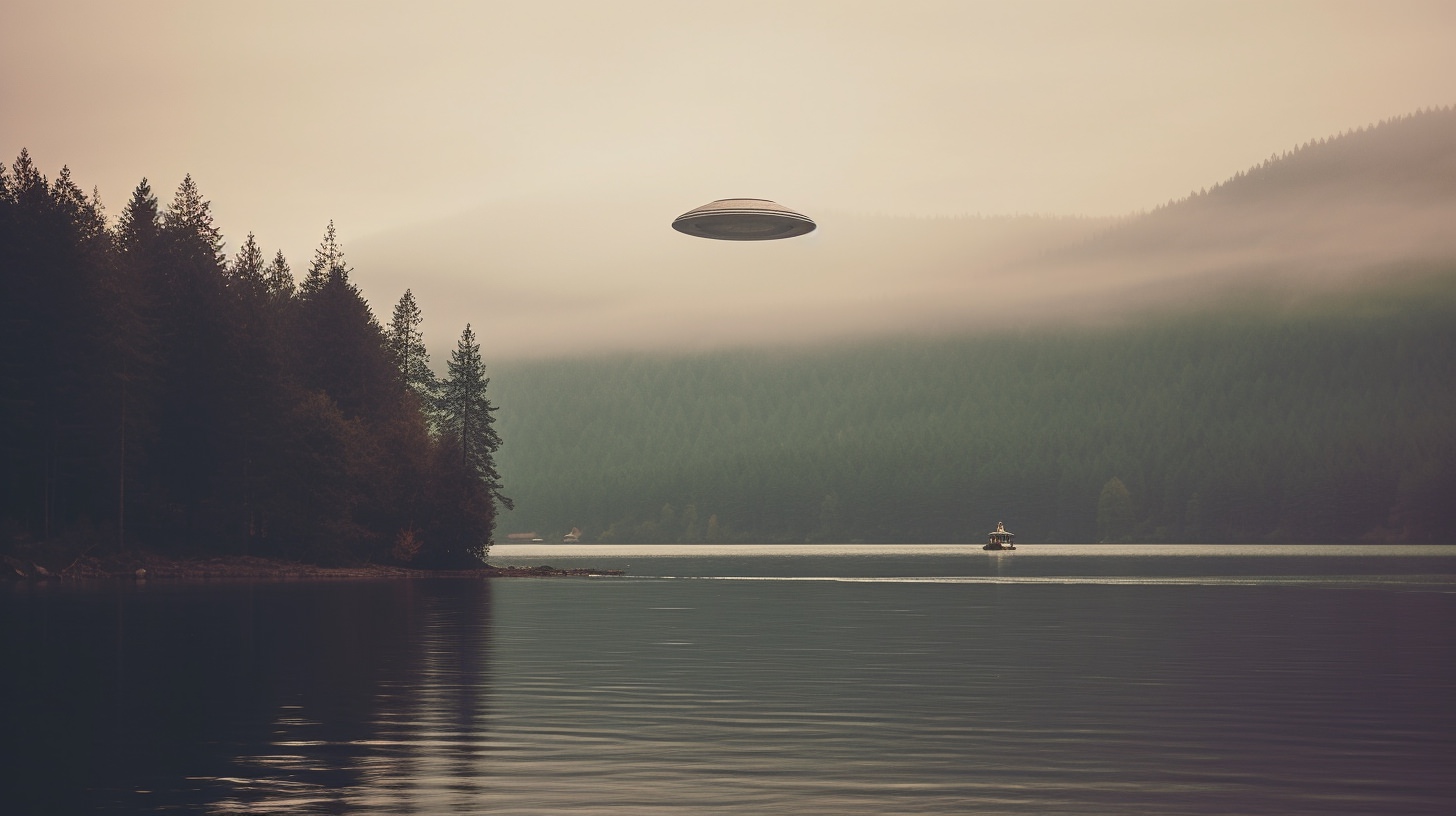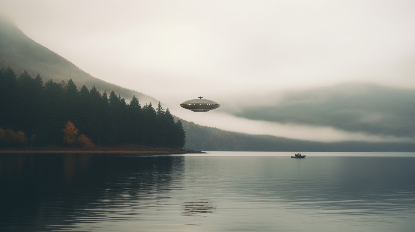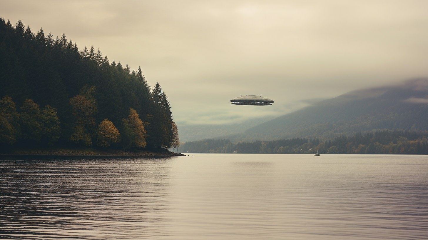 UFO hovering over Loch Ness lake with a water monster, in the style of minimalist muted colors, documentary travel photography, soft, muted palette, serene and peaceful ambiance, wilderness --ar 16:9 --style raw