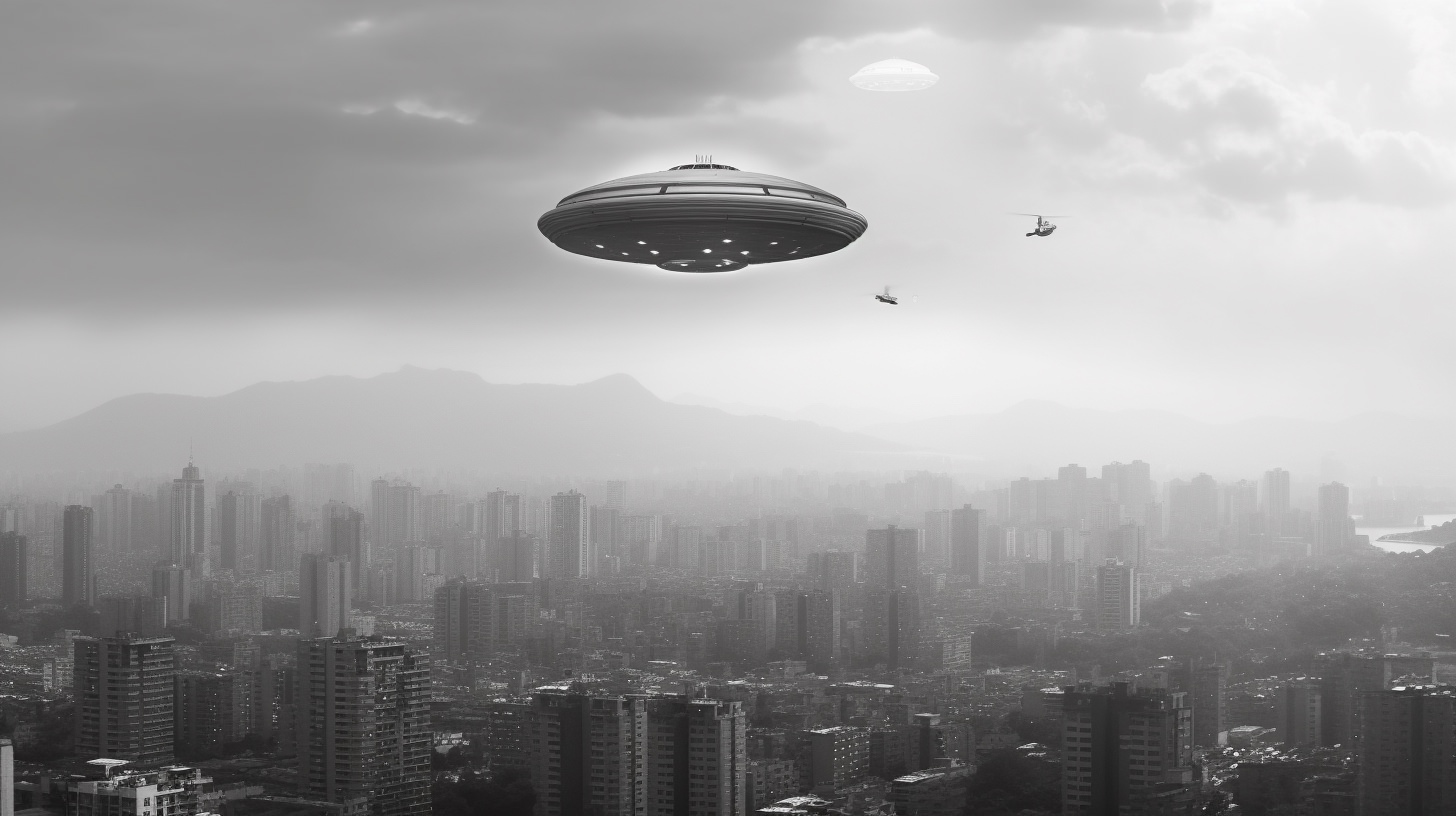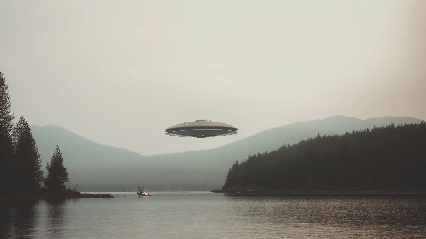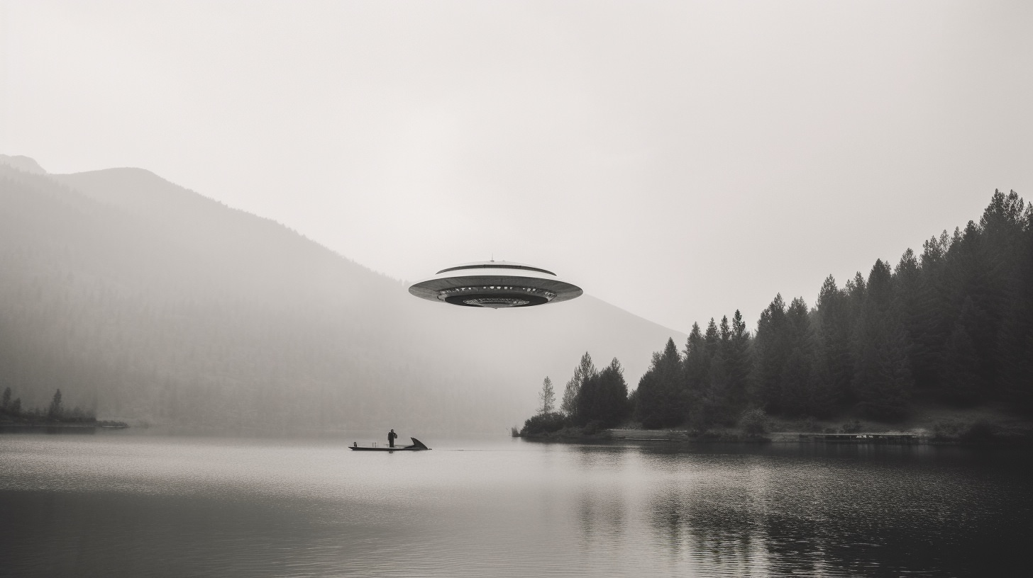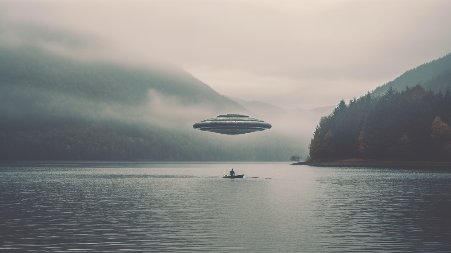 UFO hovering over Loch Ness lake with a water monster, in the style of minimalist muted colors, documentary travel photography, soft, muted palette, serene and peaceful ambiance, wilderness --ar 16:9 --style raw