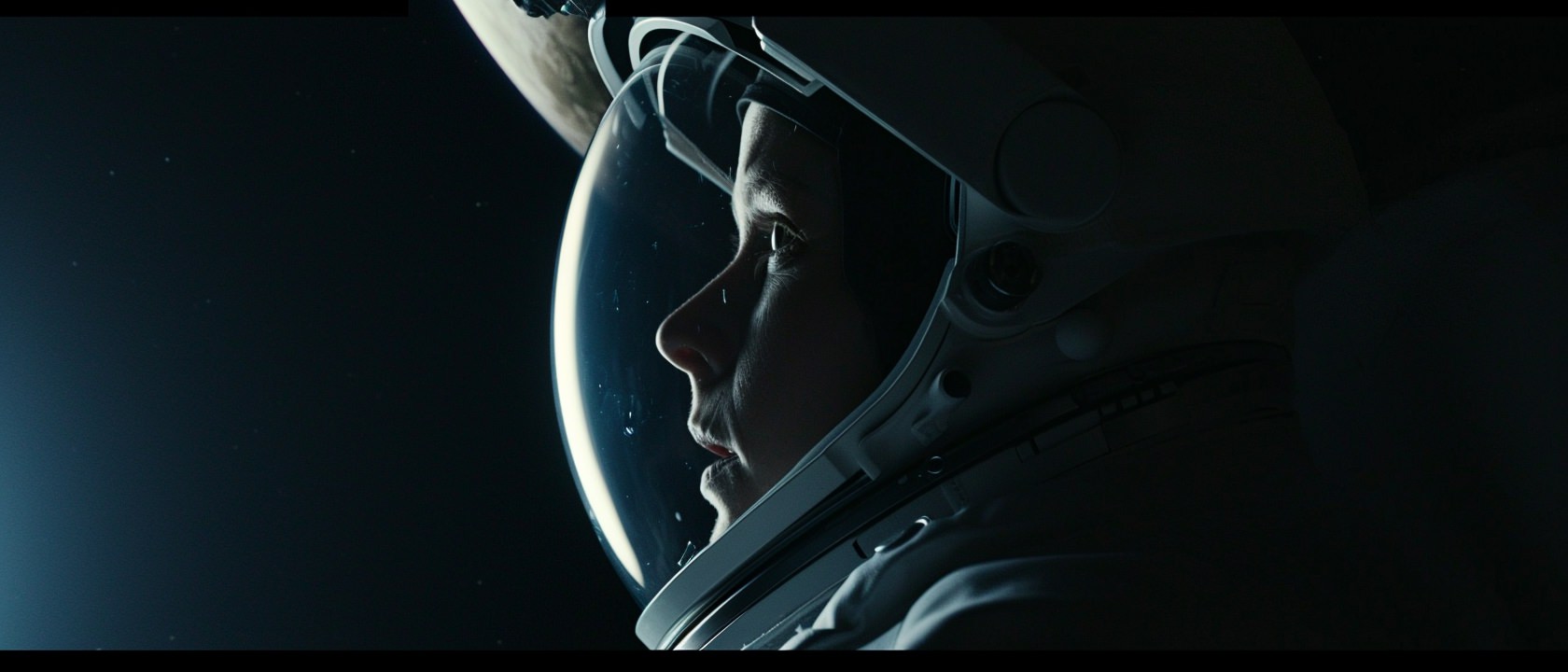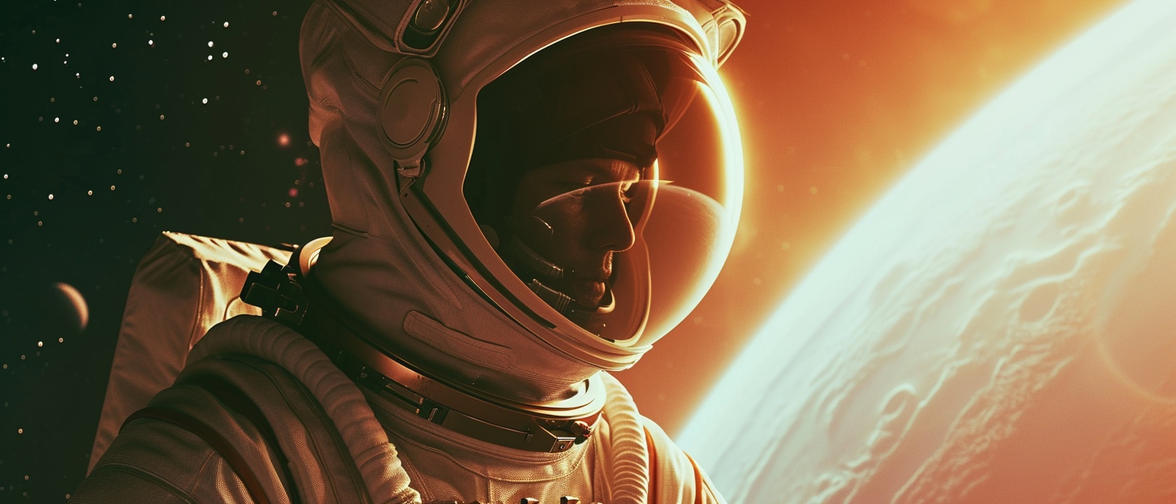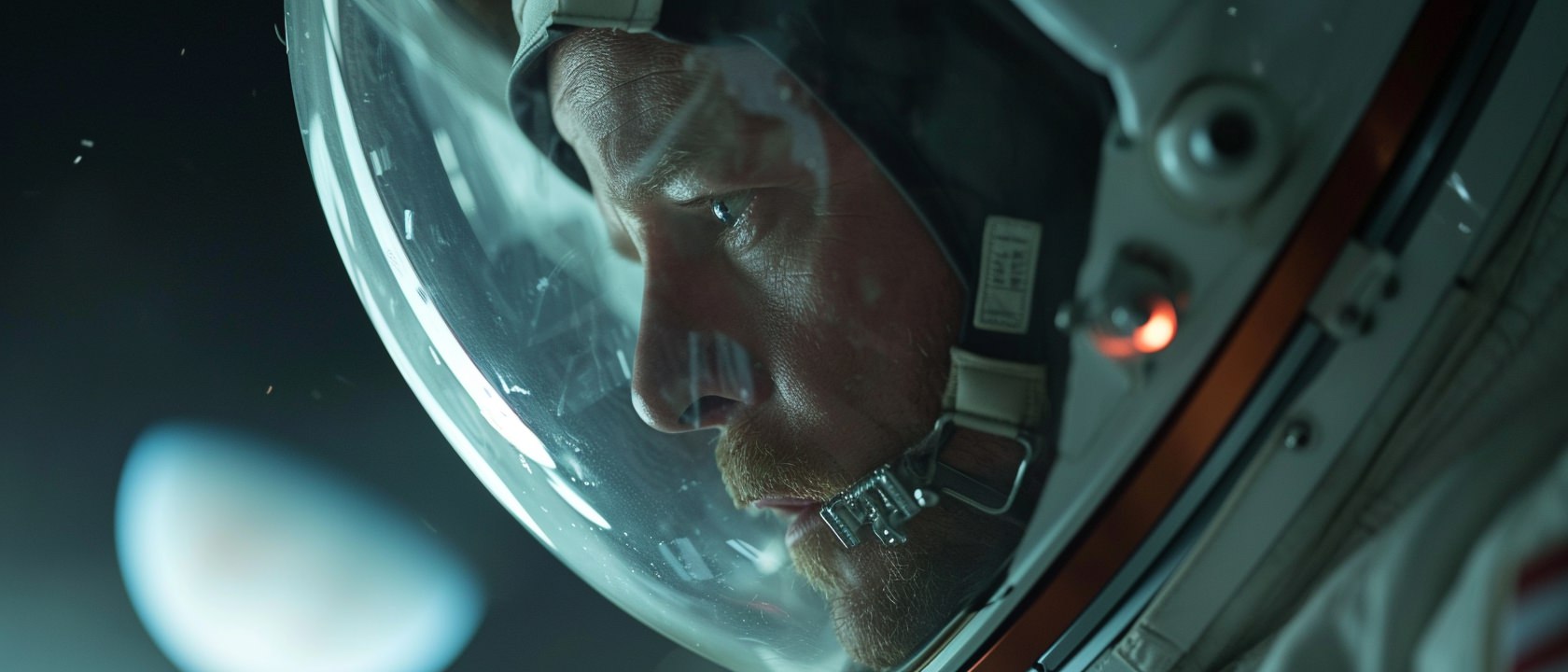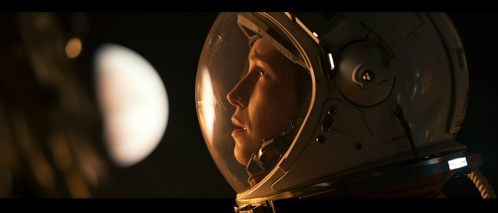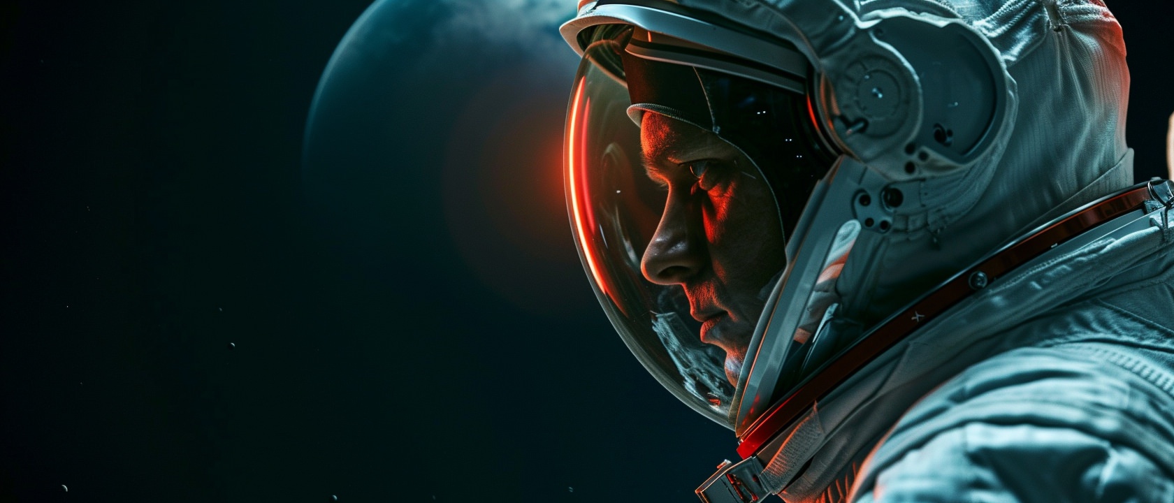 Close-up photo of an astronaut, side view, [Earth,Mars,Moon,Saturn,Venus,Jupiter,Neptune,Uranus], movie still --ar 21:9 --v 6.0