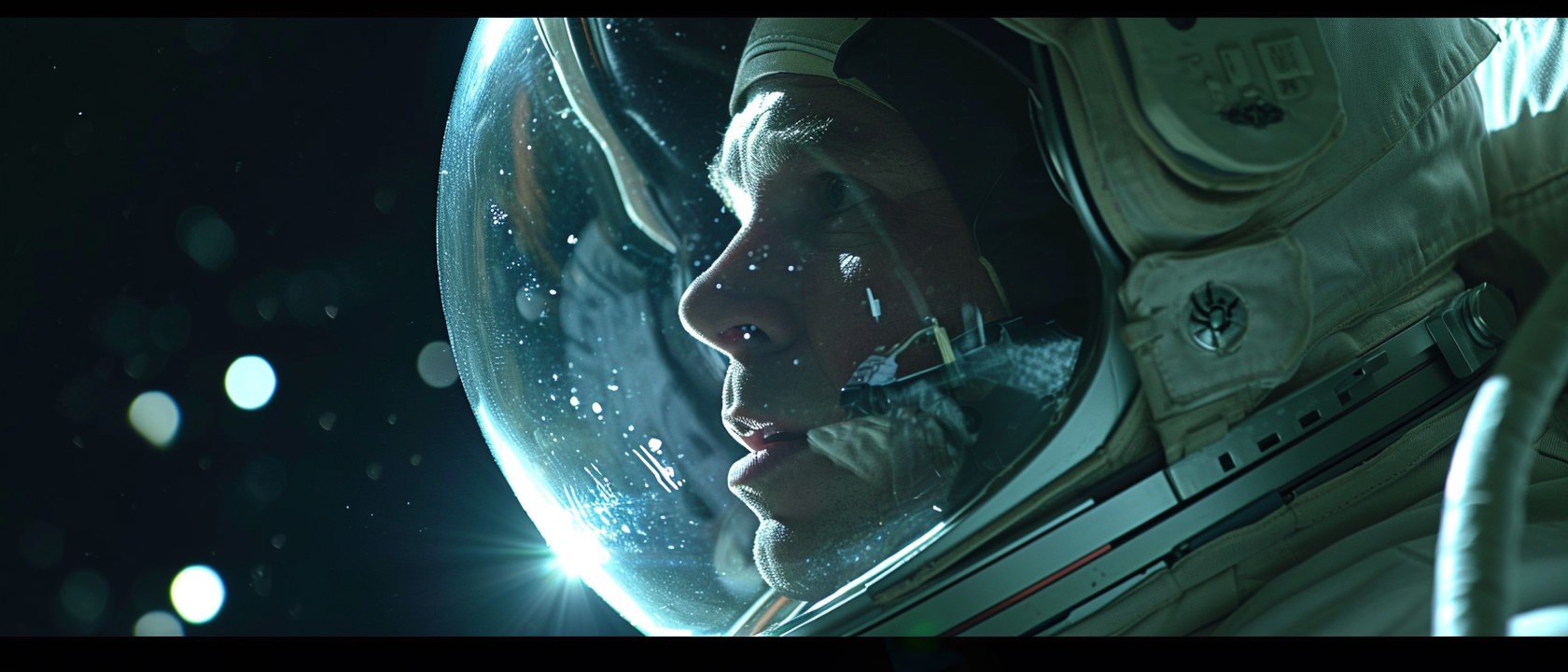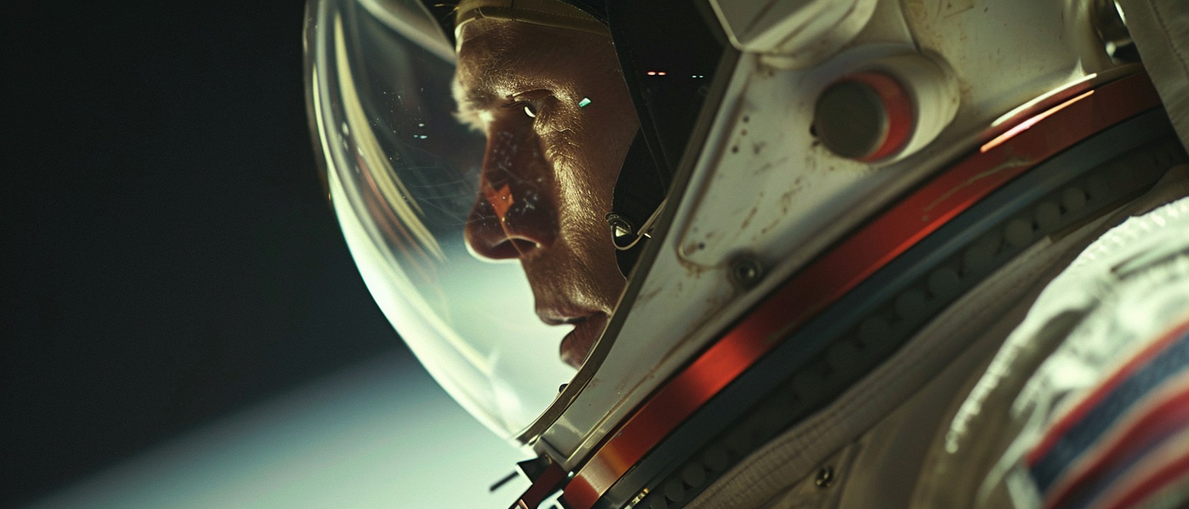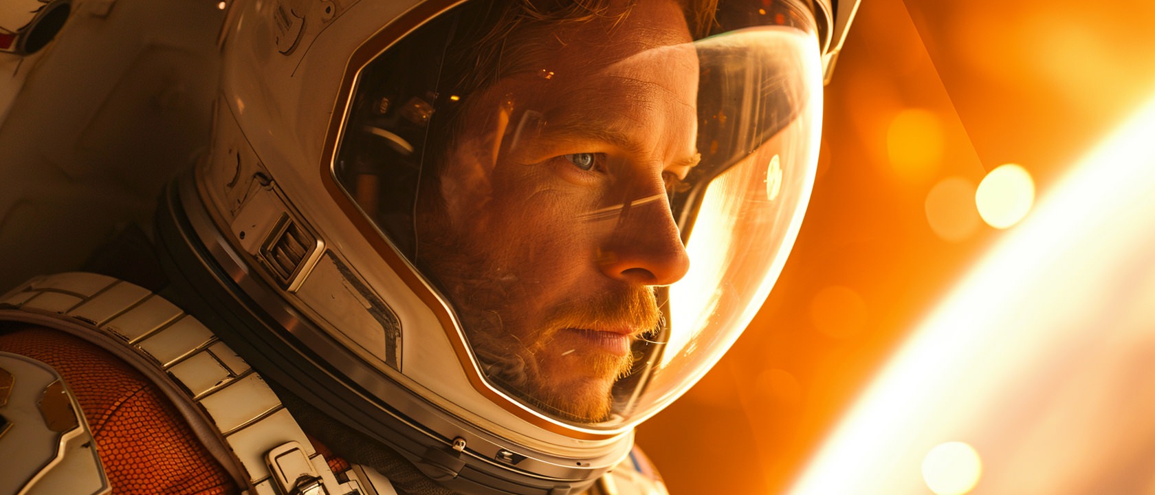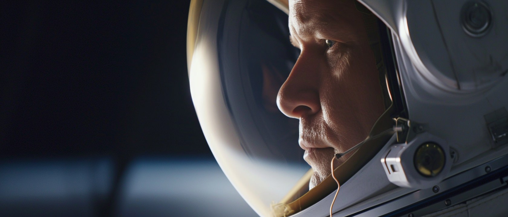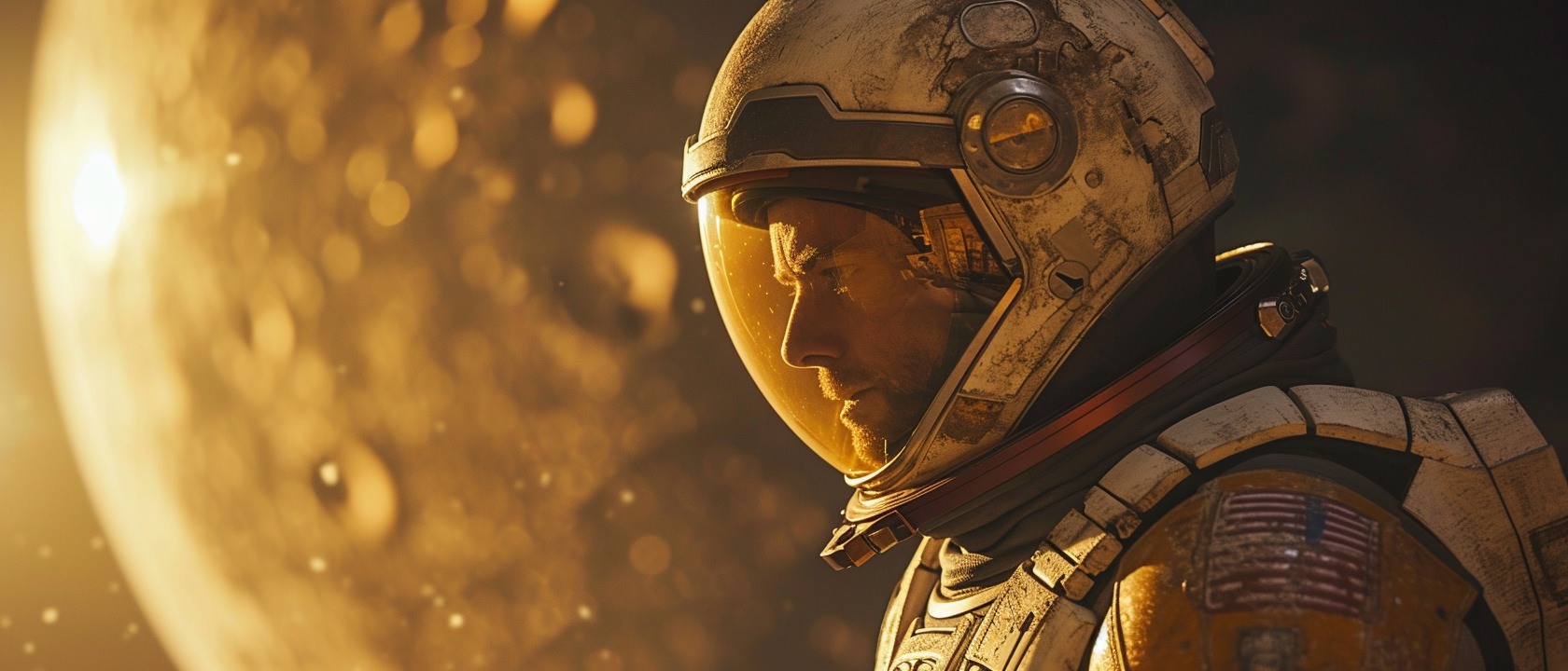 Close-up photo of an astronaut, side view, [Earth,Mars,Moon,Saturn,Venus,Jupiter,Neptune,Uranus], movie still --ar 21:9 --v 6.0