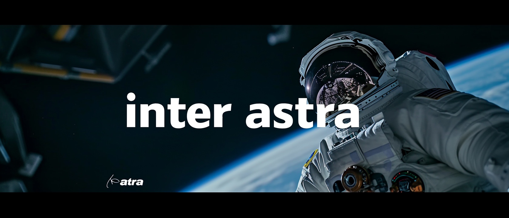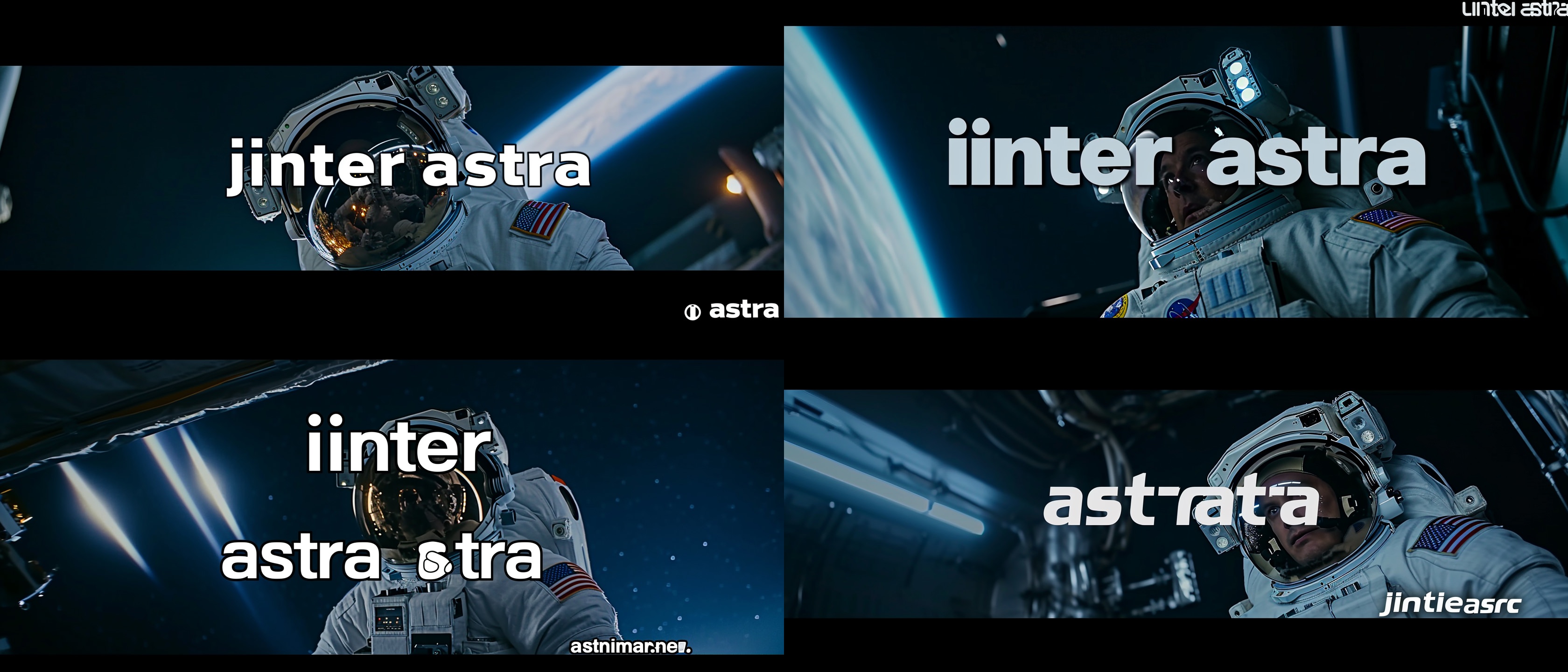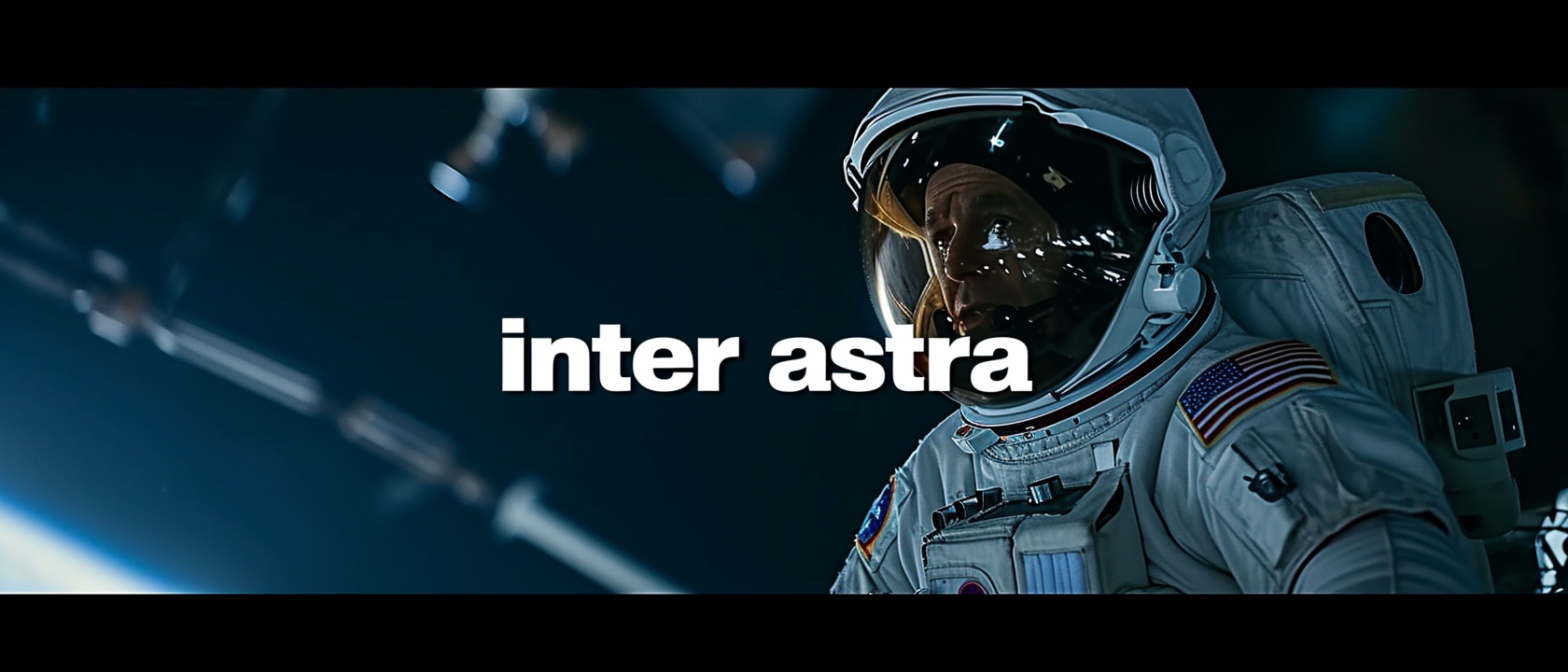 Close-up photo of an astronaut, side view, [Earth,Mars,Moon,Saturn,Venus,Jupiter,Neptune,Uranus], movie title still with large centred title text overlay "inter astra" --ar 21:9 --v 6