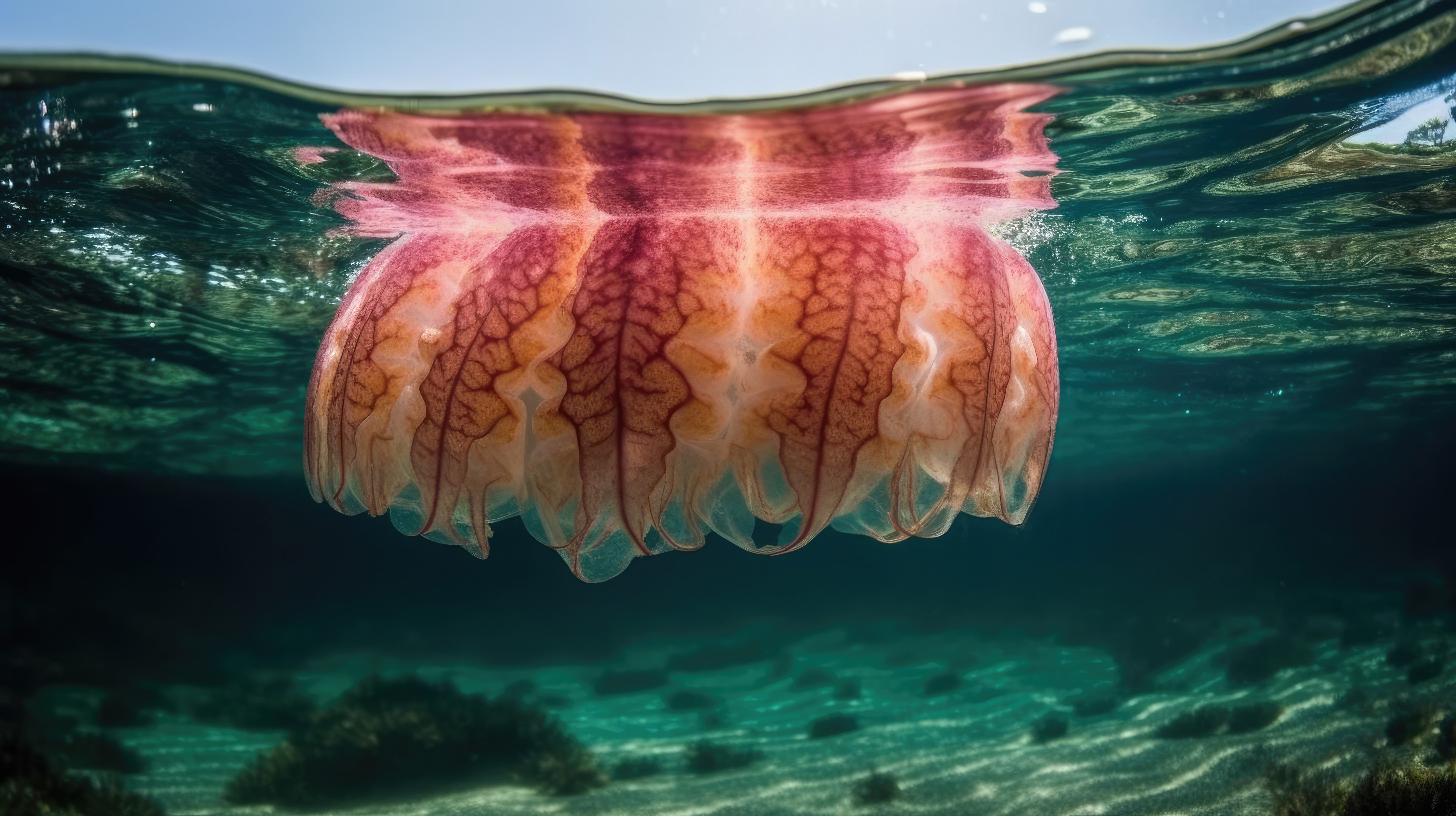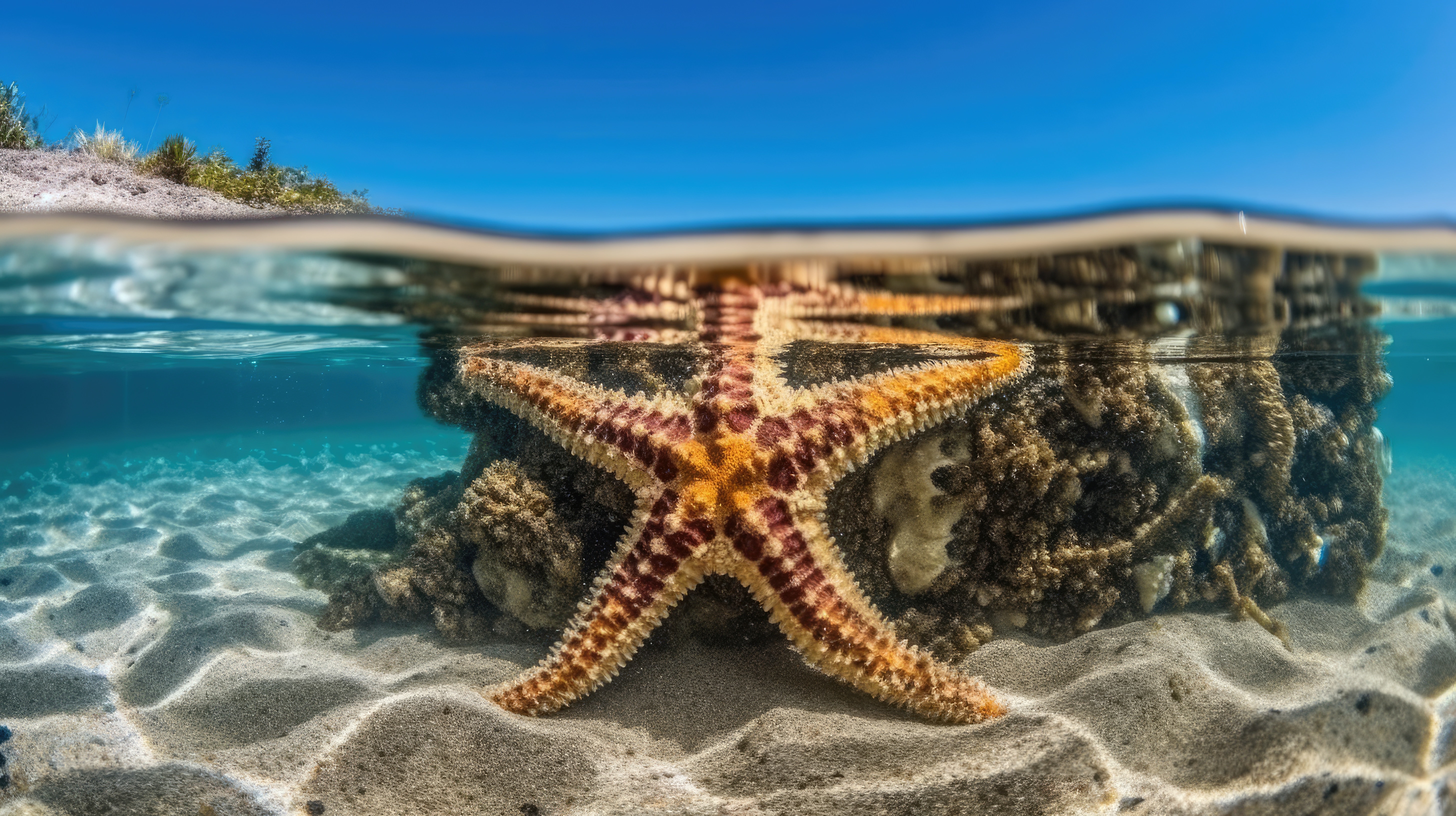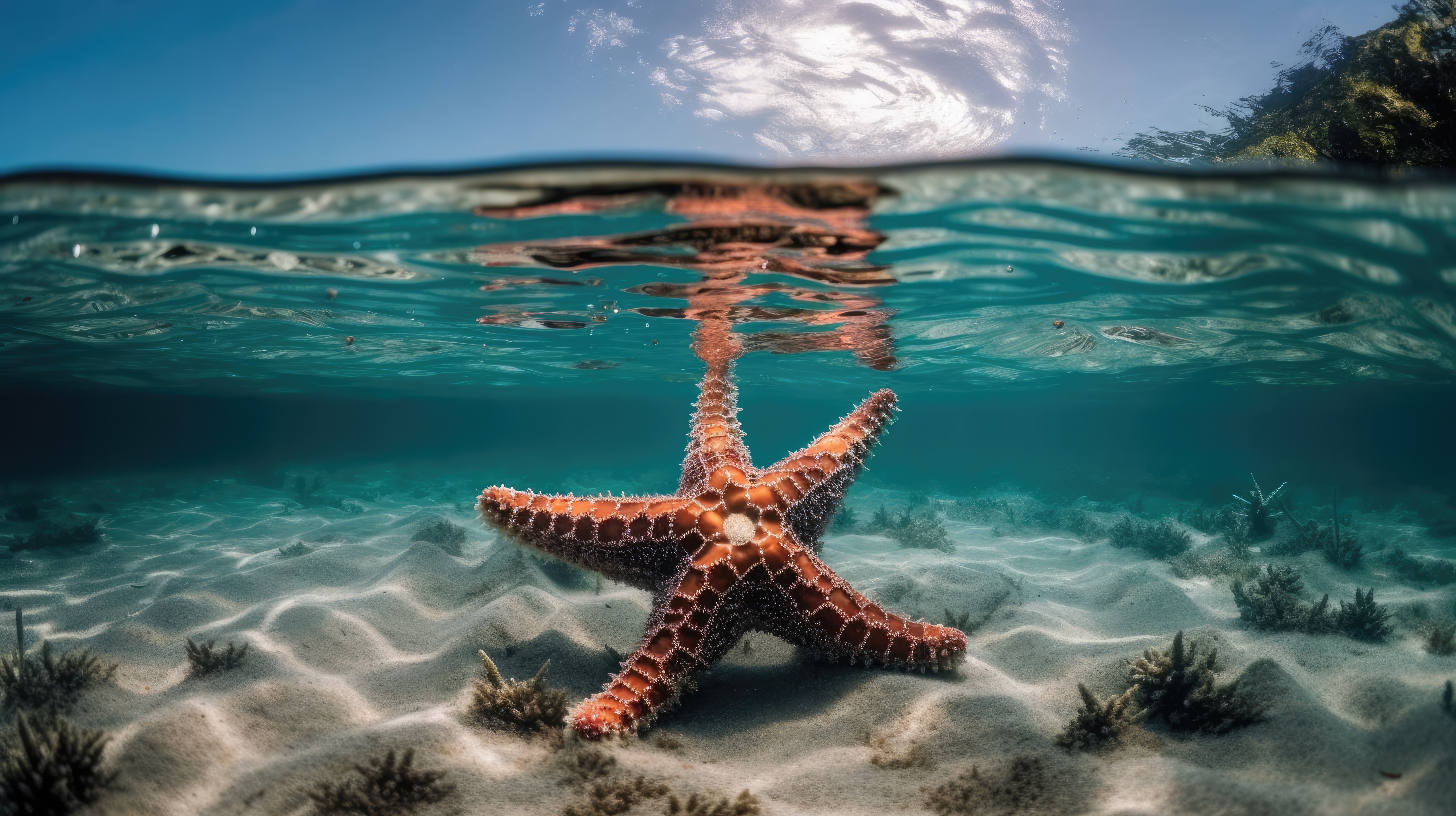 Prompt: A starfish, split view with half of the image above water and half below –ar 16:9 –v 5