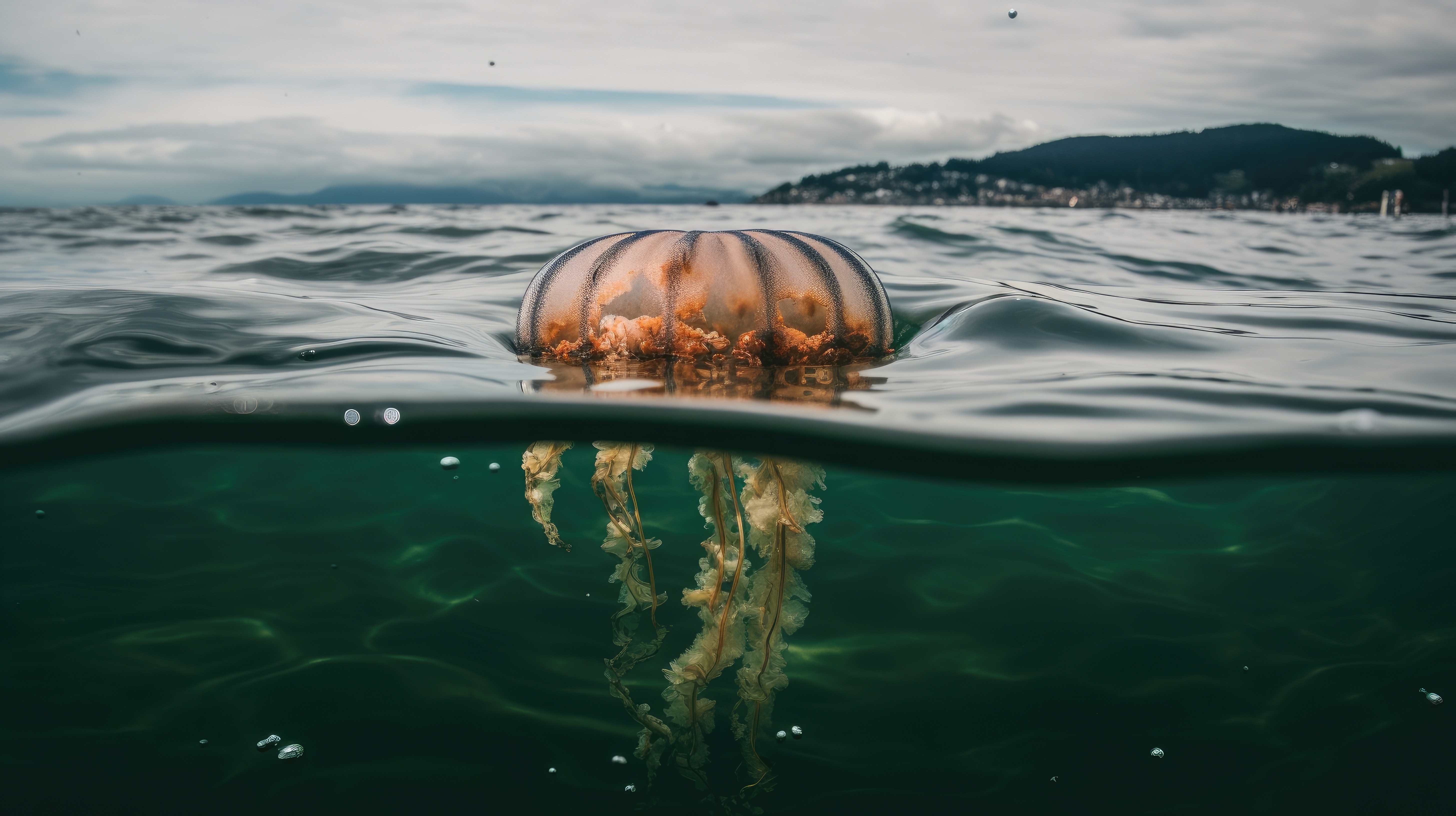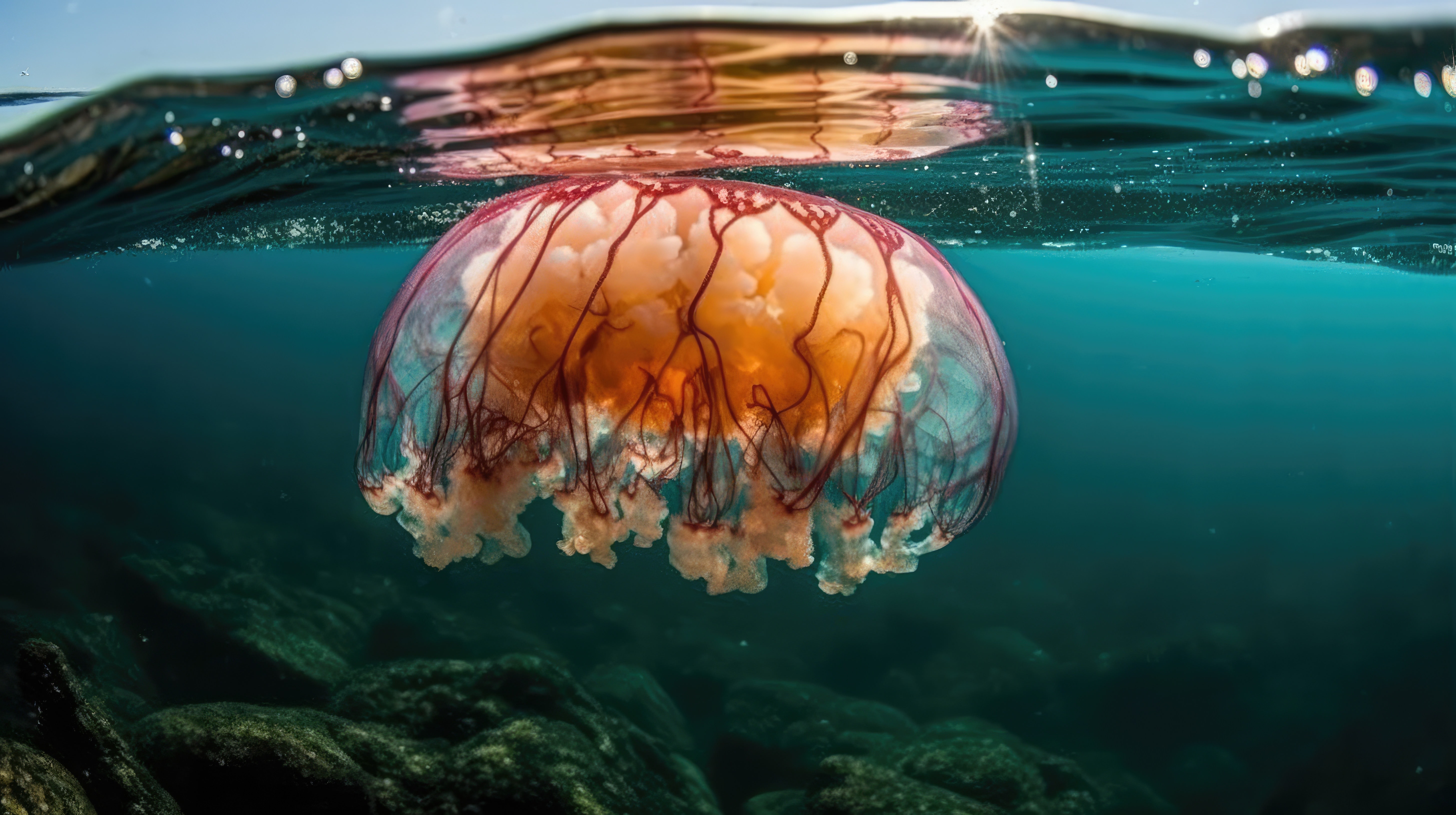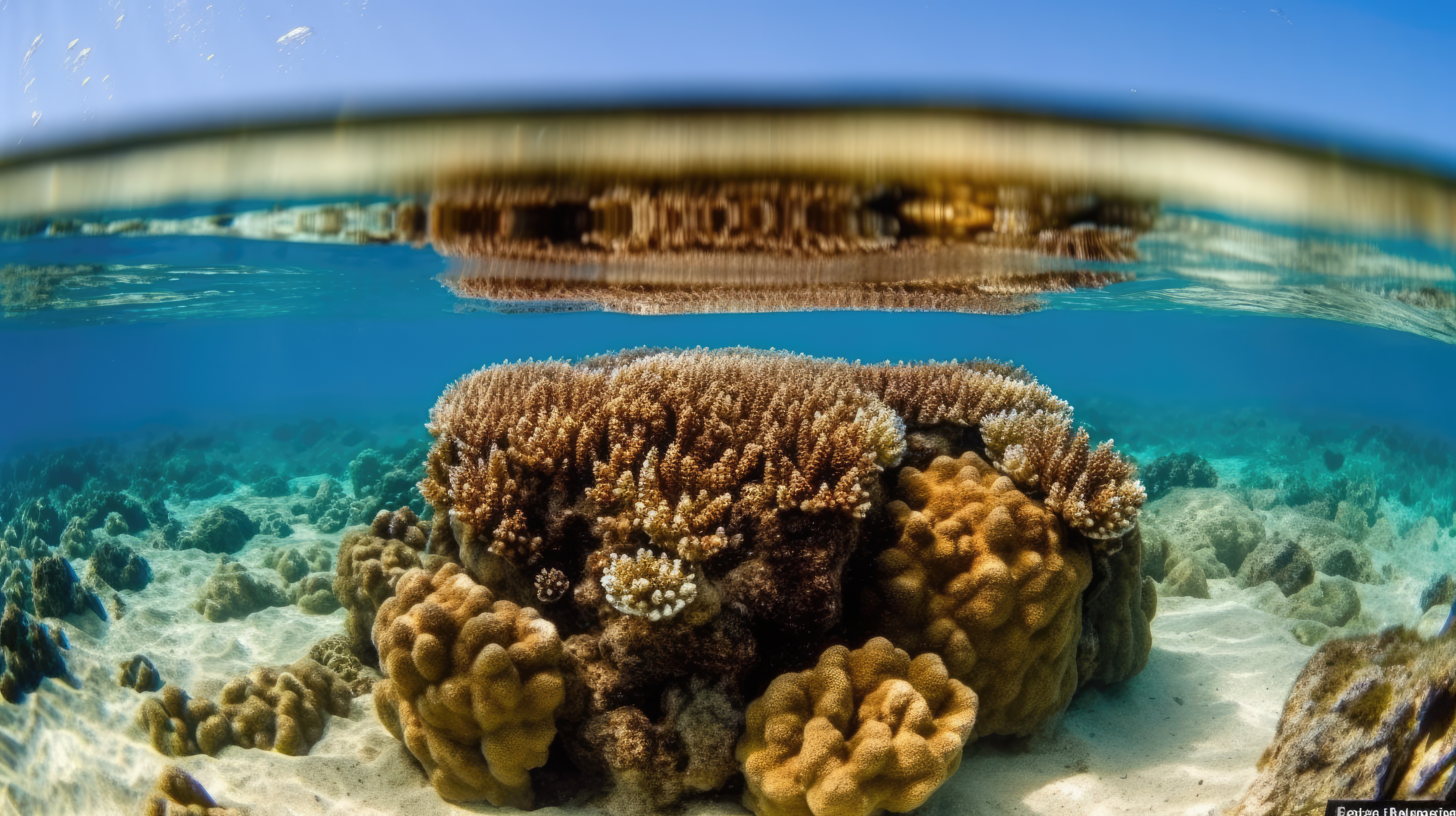 Prompt: A starfish, split view with half of the image above water and half below –ar 16:9 –v 5
