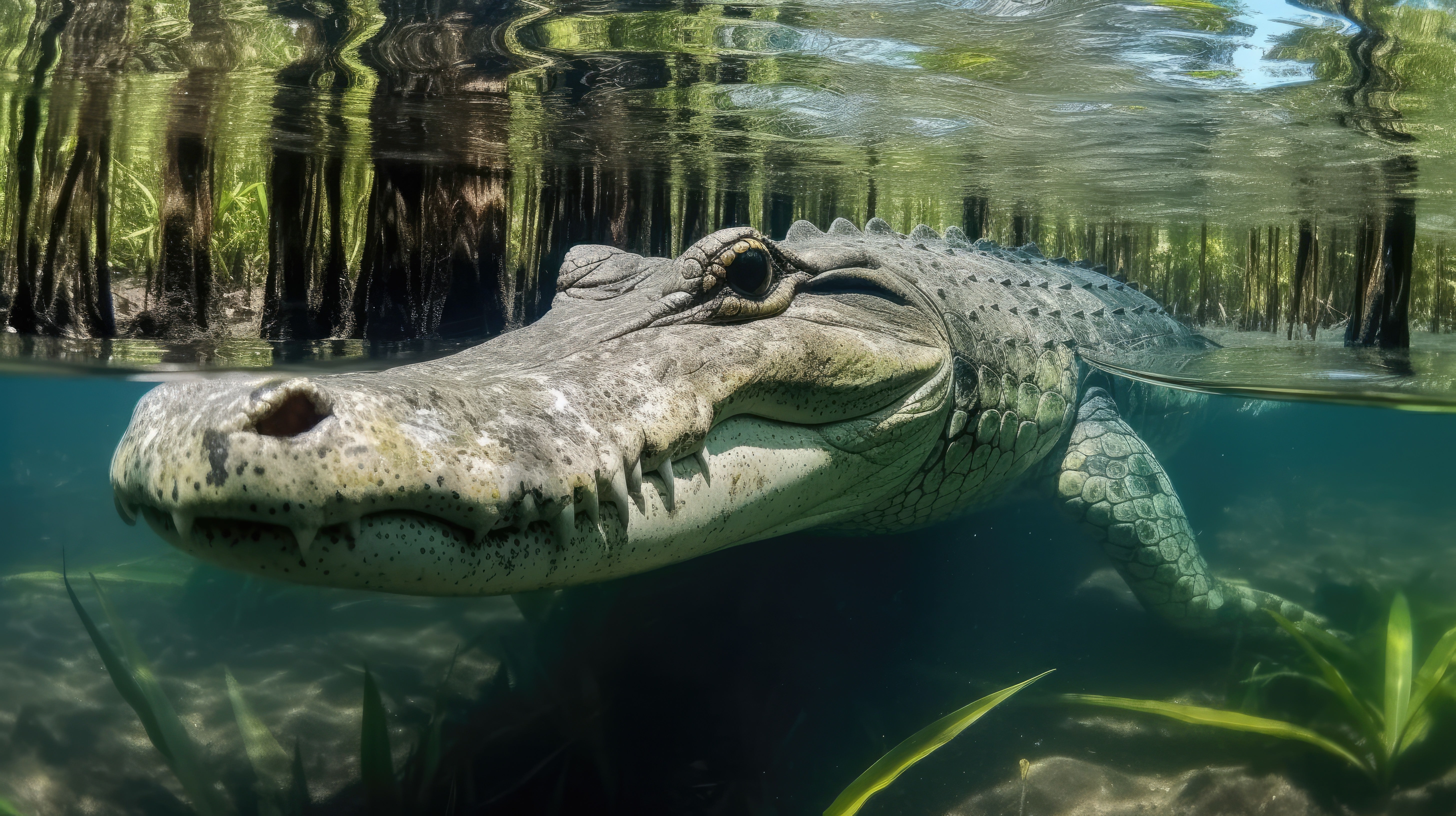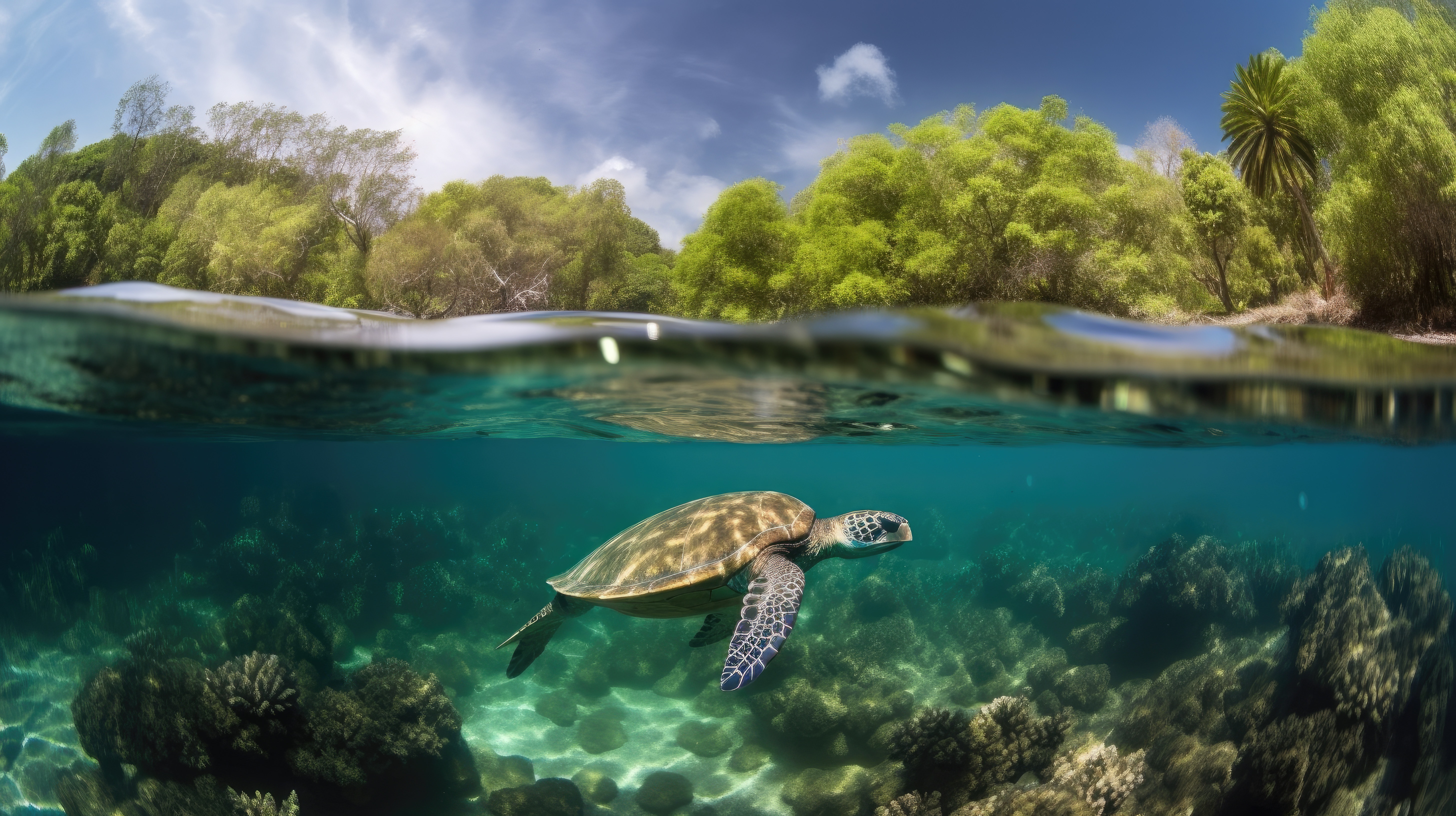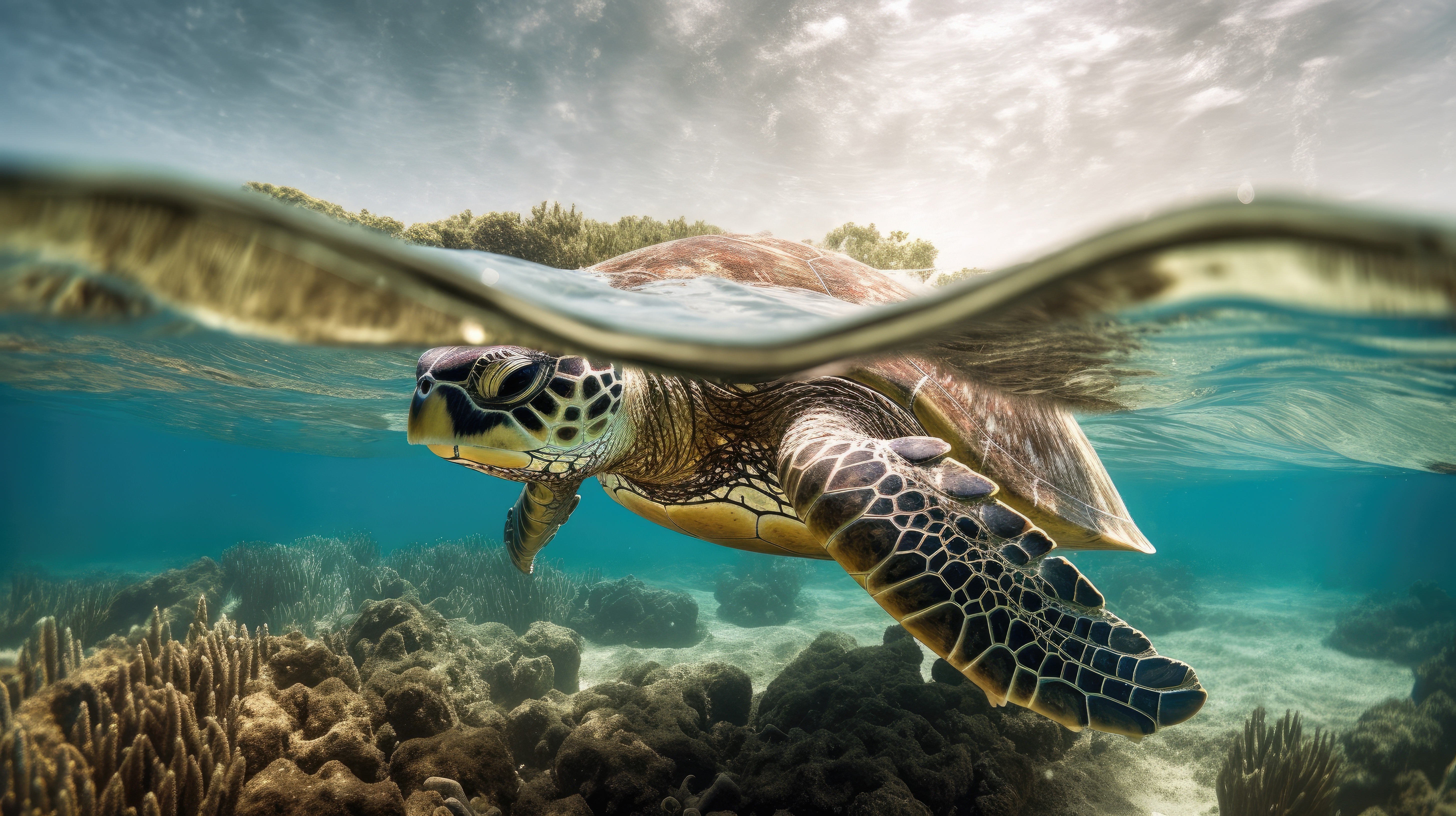 Prompt: A green sea turtle, split view with half of the image above water and half below –ar 16:9 –v 5