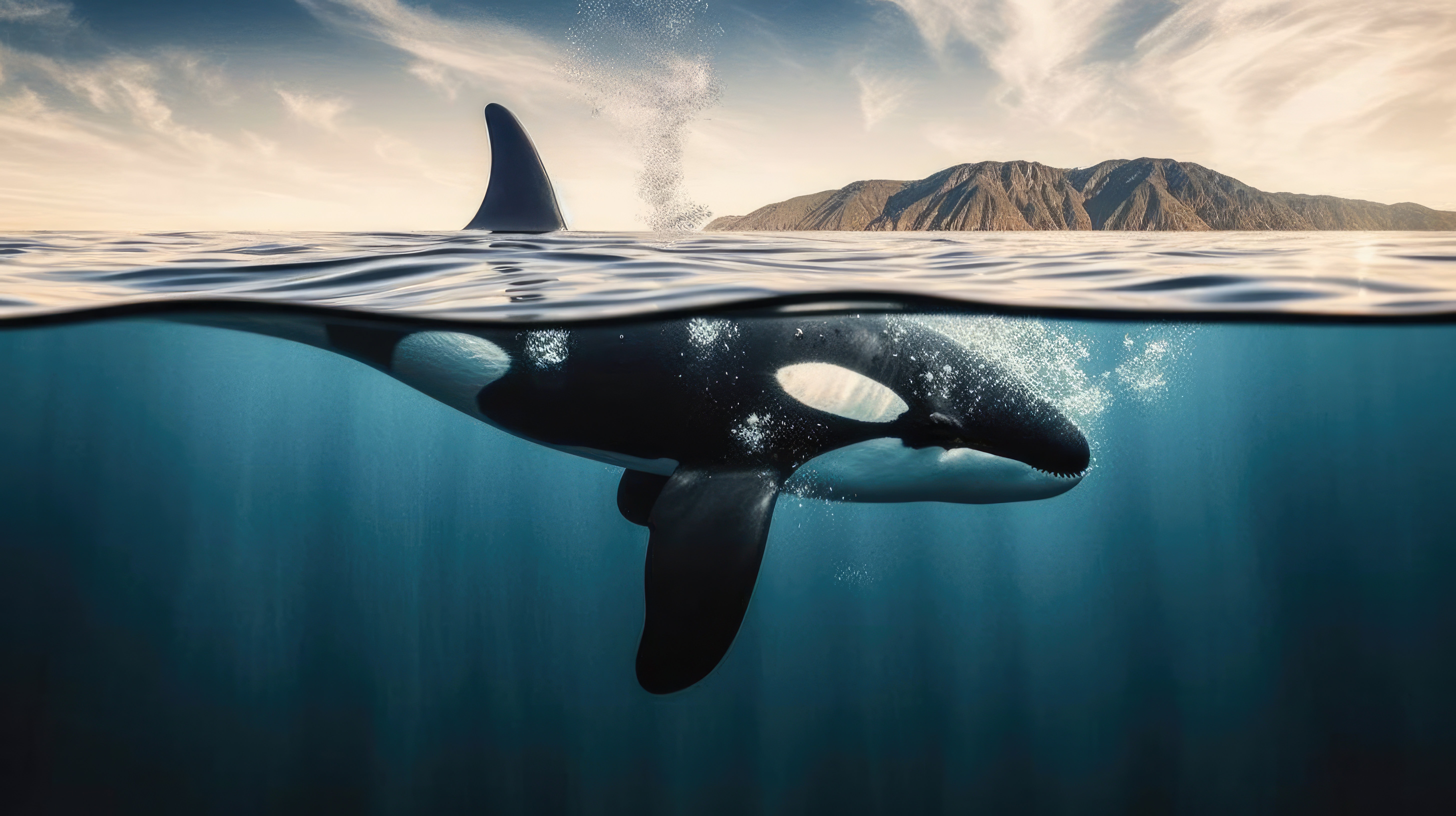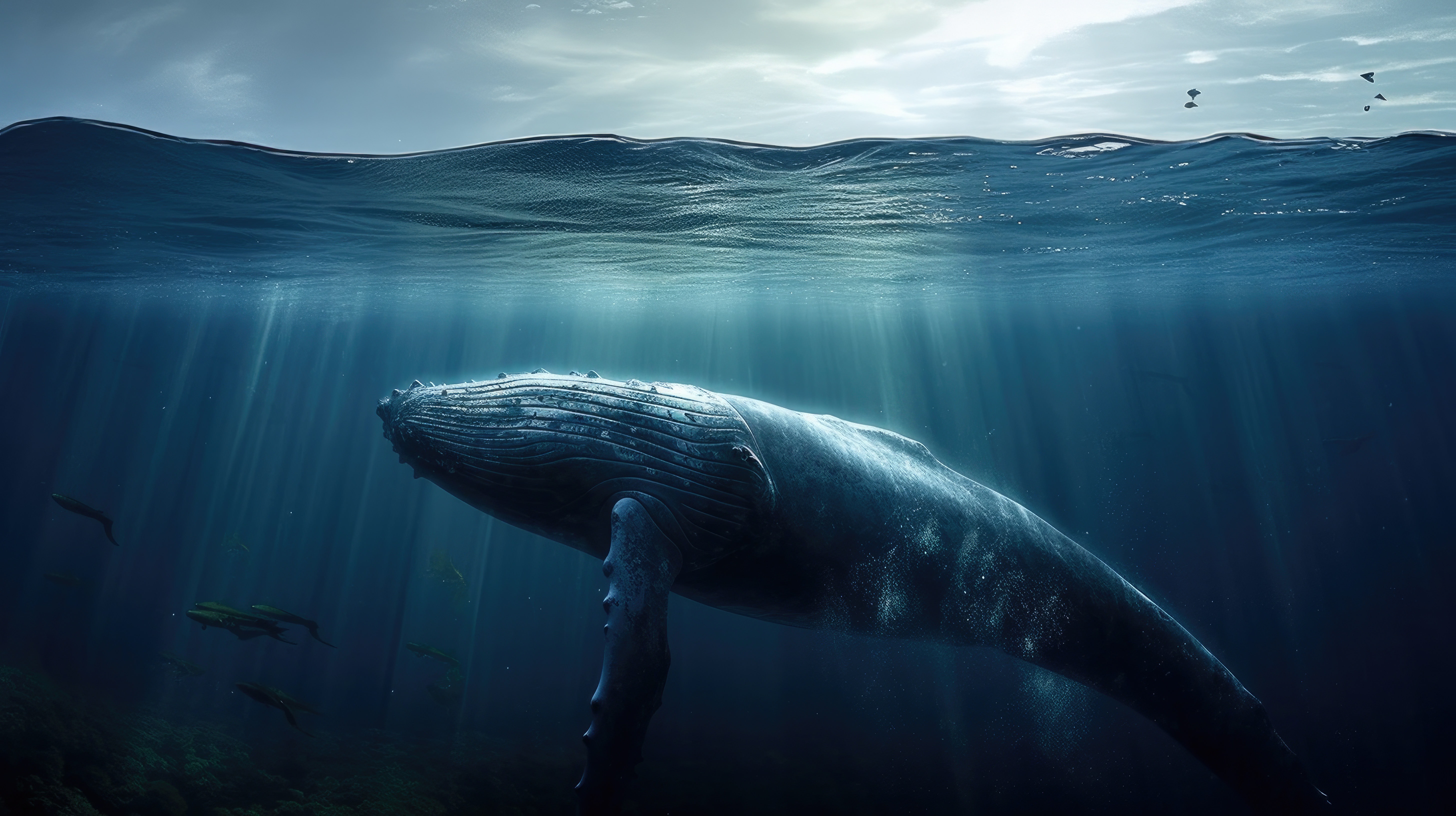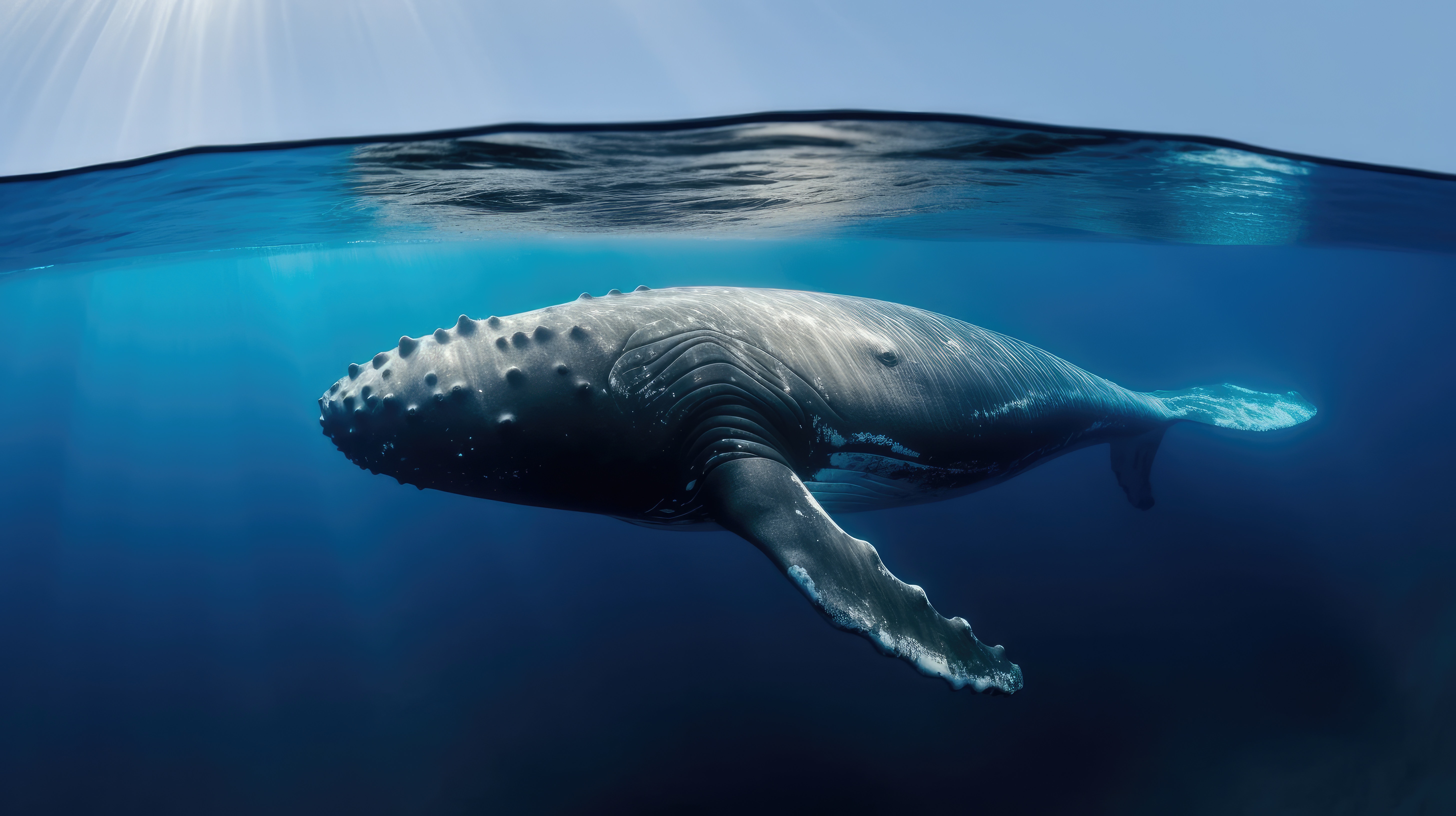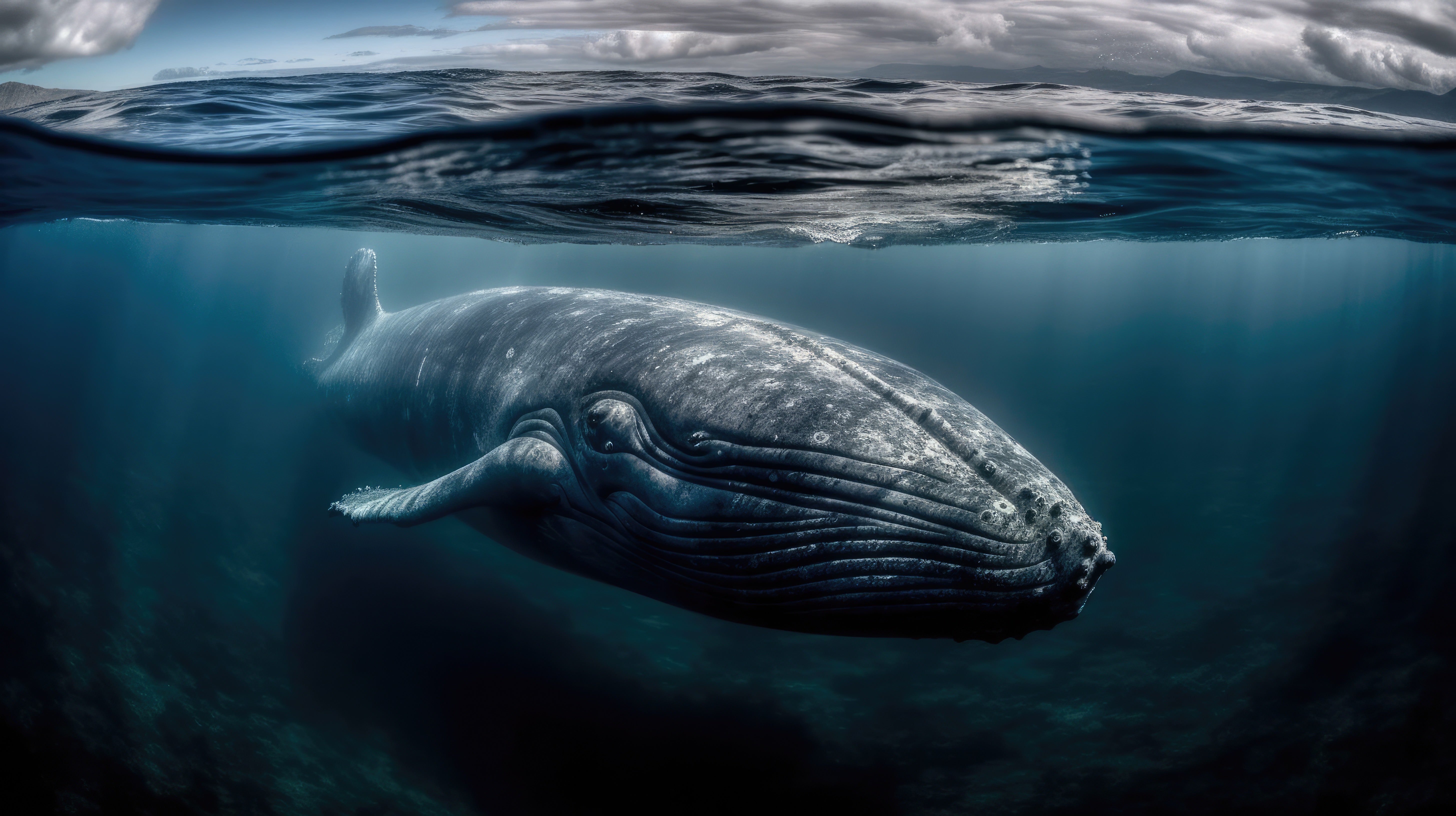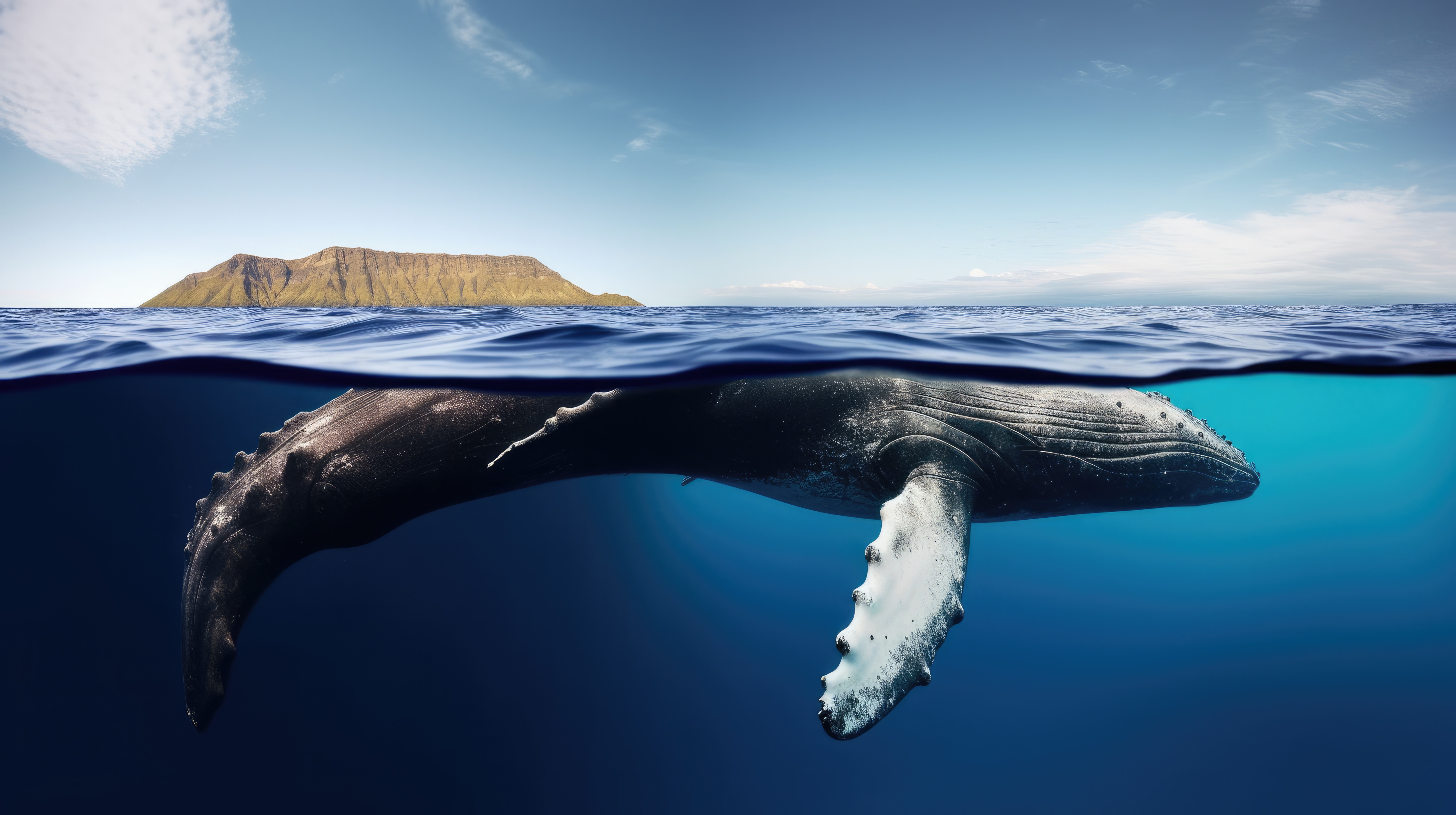 Prompt: A whale in the ocean, split view with half of the image above water and half below –ar 16:9 –v 5